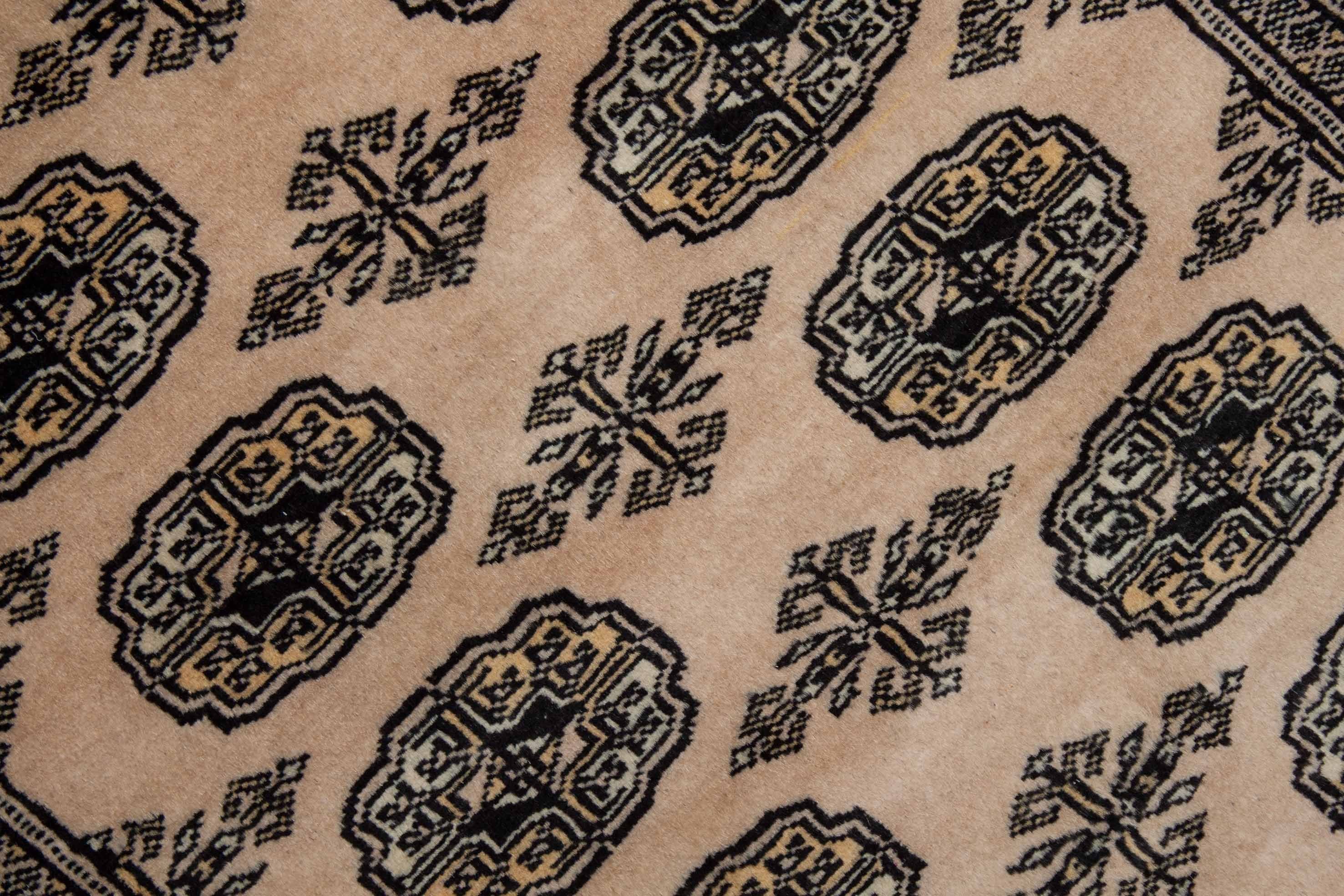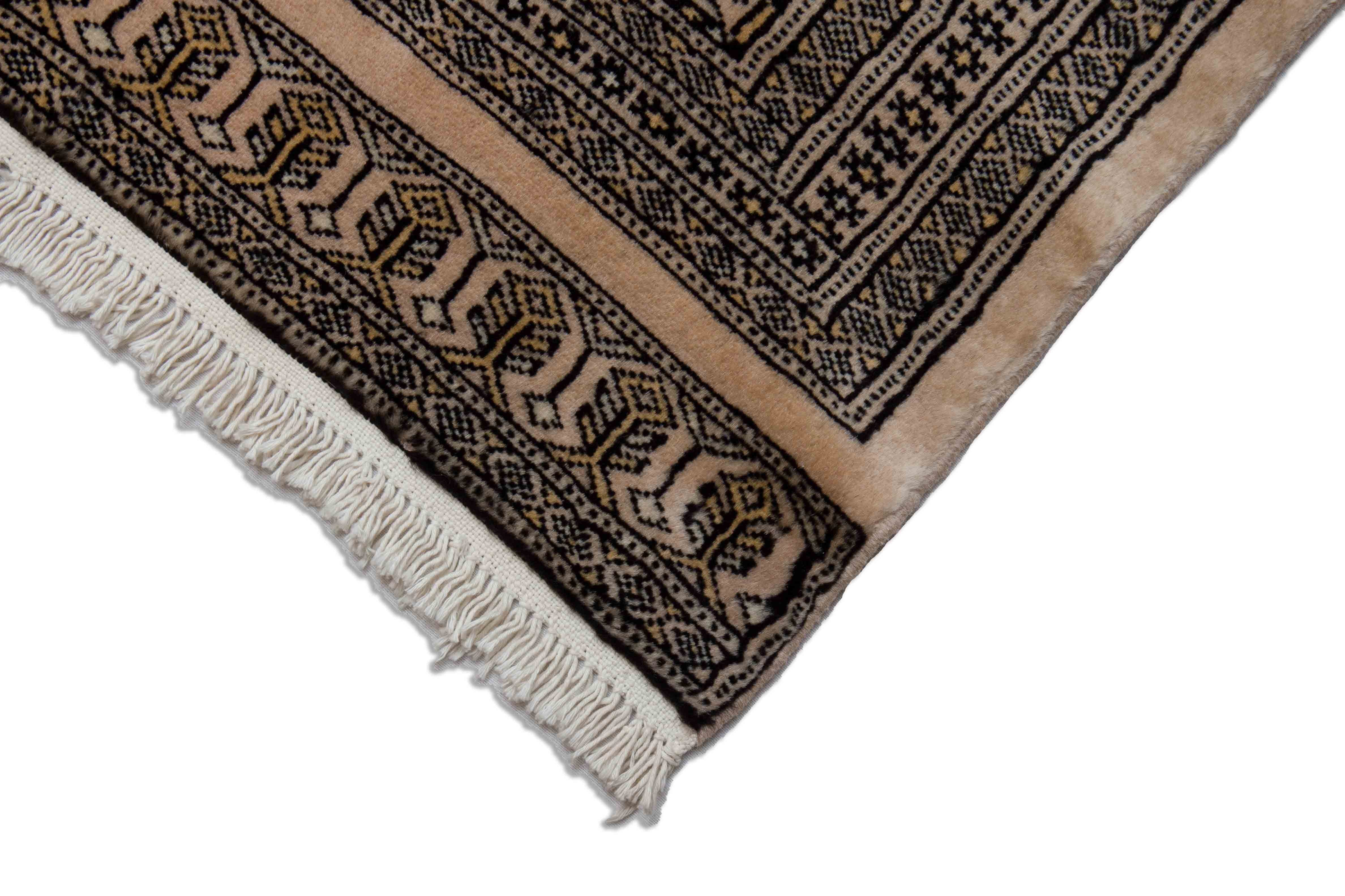 Weil Buchara Teppiche zu den feinsten und beliebtesten zentralasiatischen Teppichen gehören, haben ihre Muster auch die Knüpfer in Pakistan inspiriert. So kommt es, dass dieser Teppich mit dem typischen, usbekischen Buchara Muster in Pakistan geknüpft wurde.