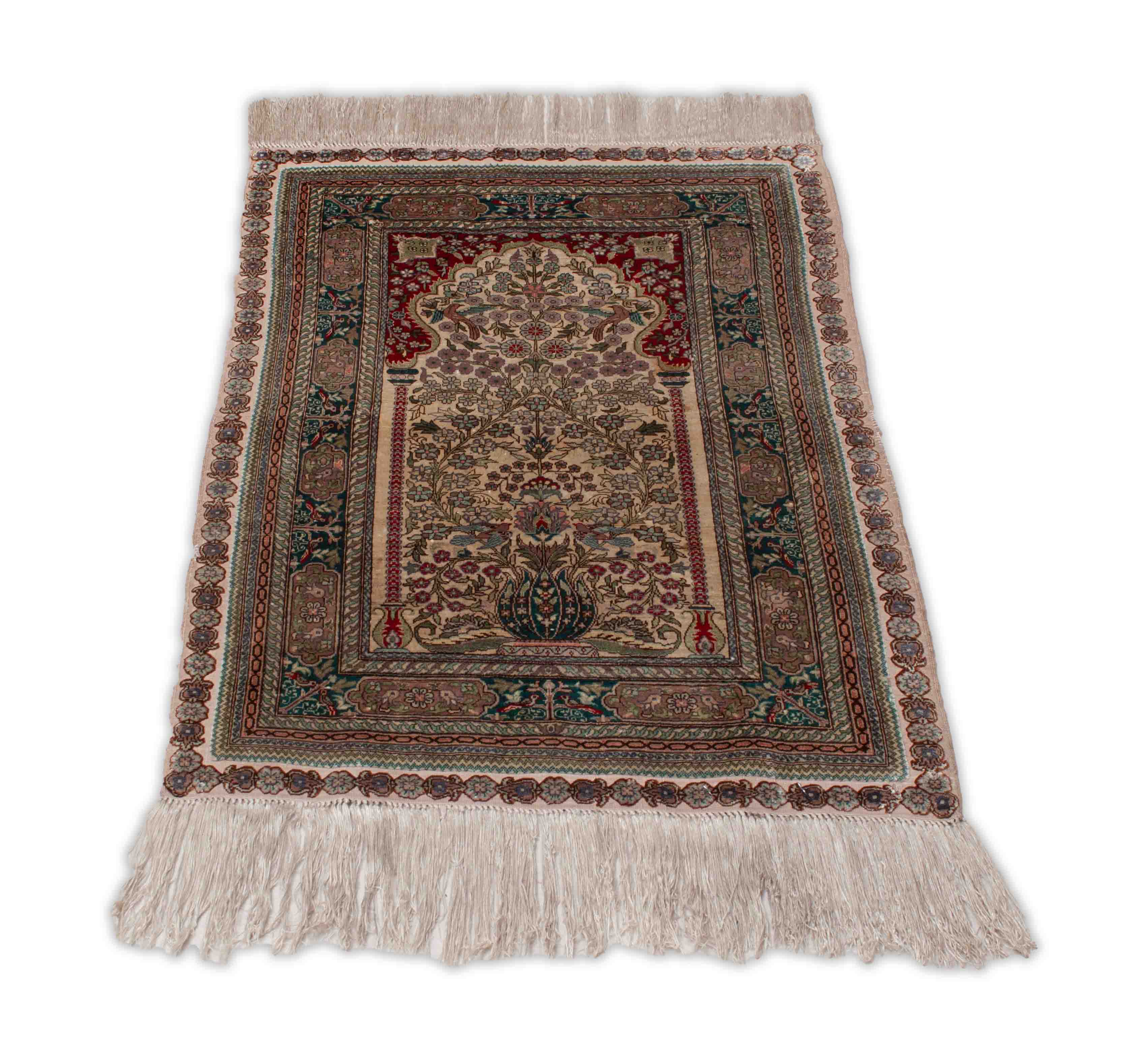 Diesen Hereke ziert das sogenannte Mehrab oder Mihrab Motiv. Mehrab bezeichnet die islamische Gebetsnische in Moscheen, die die Gebetsrichtung qibla also die Richtung Mekkas anzeigt. Traditionell werden Teppiche mit dem Mehrab Motiv von Muslimen zum Beten verwendet und sind daher besonders kostbar.