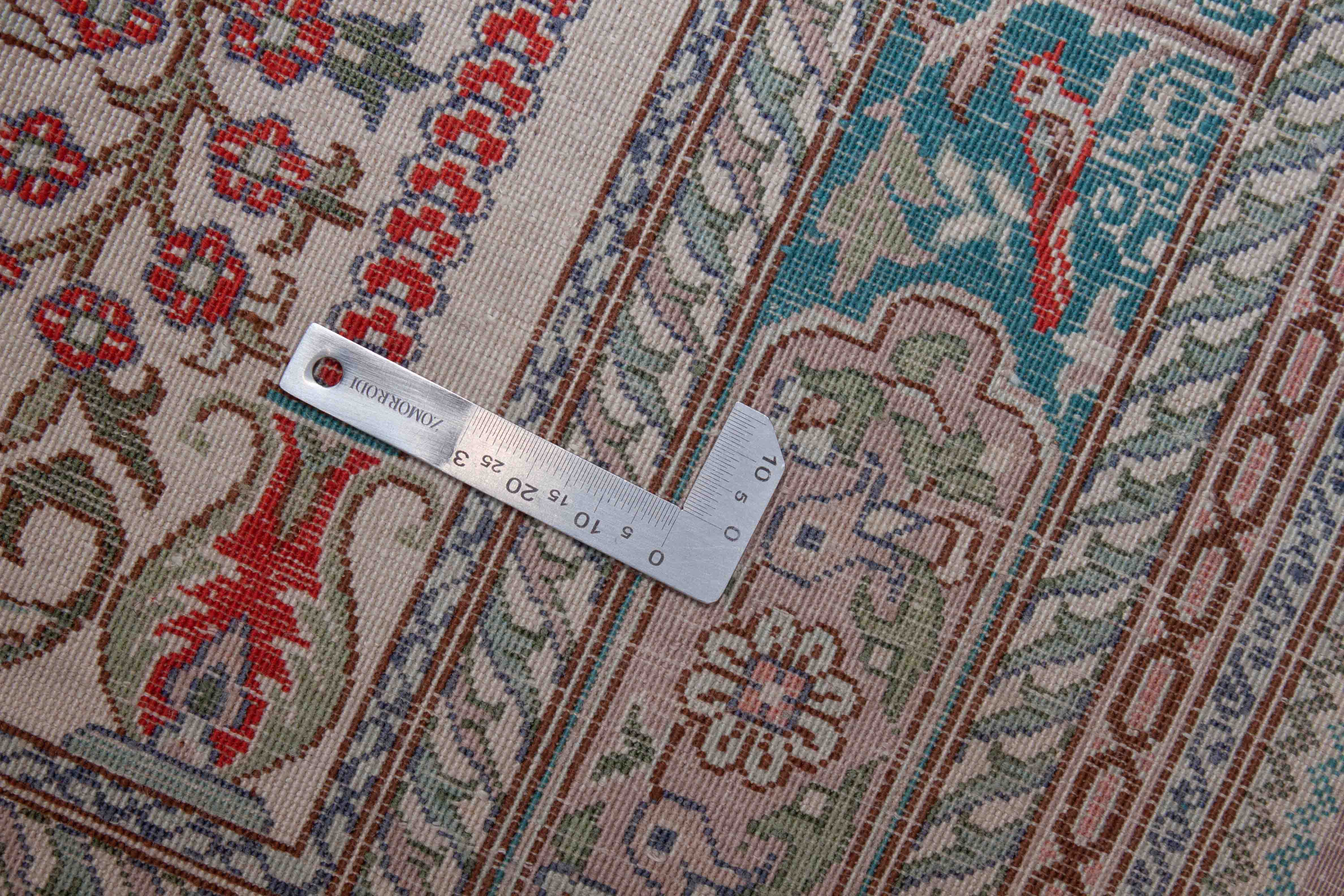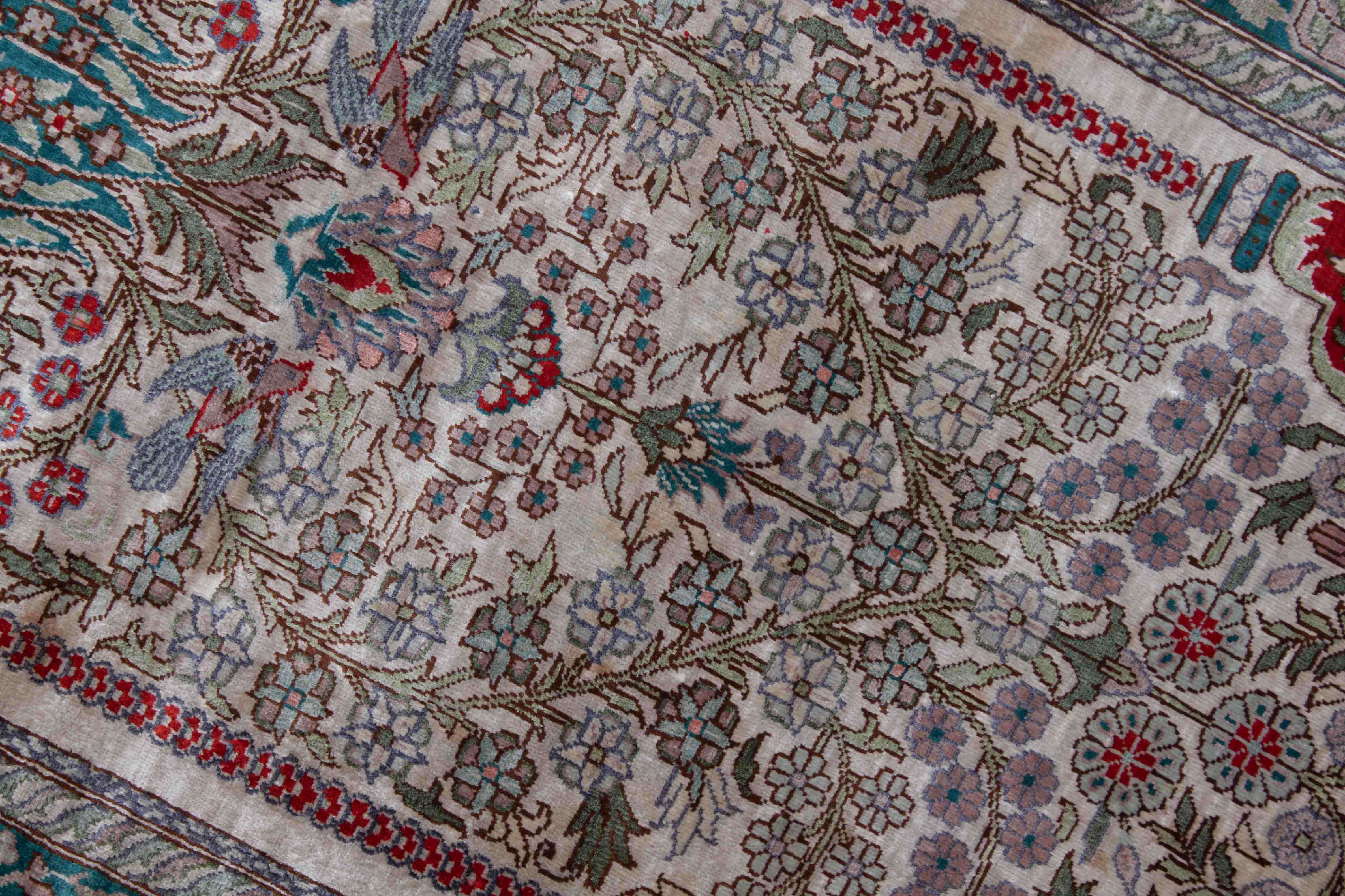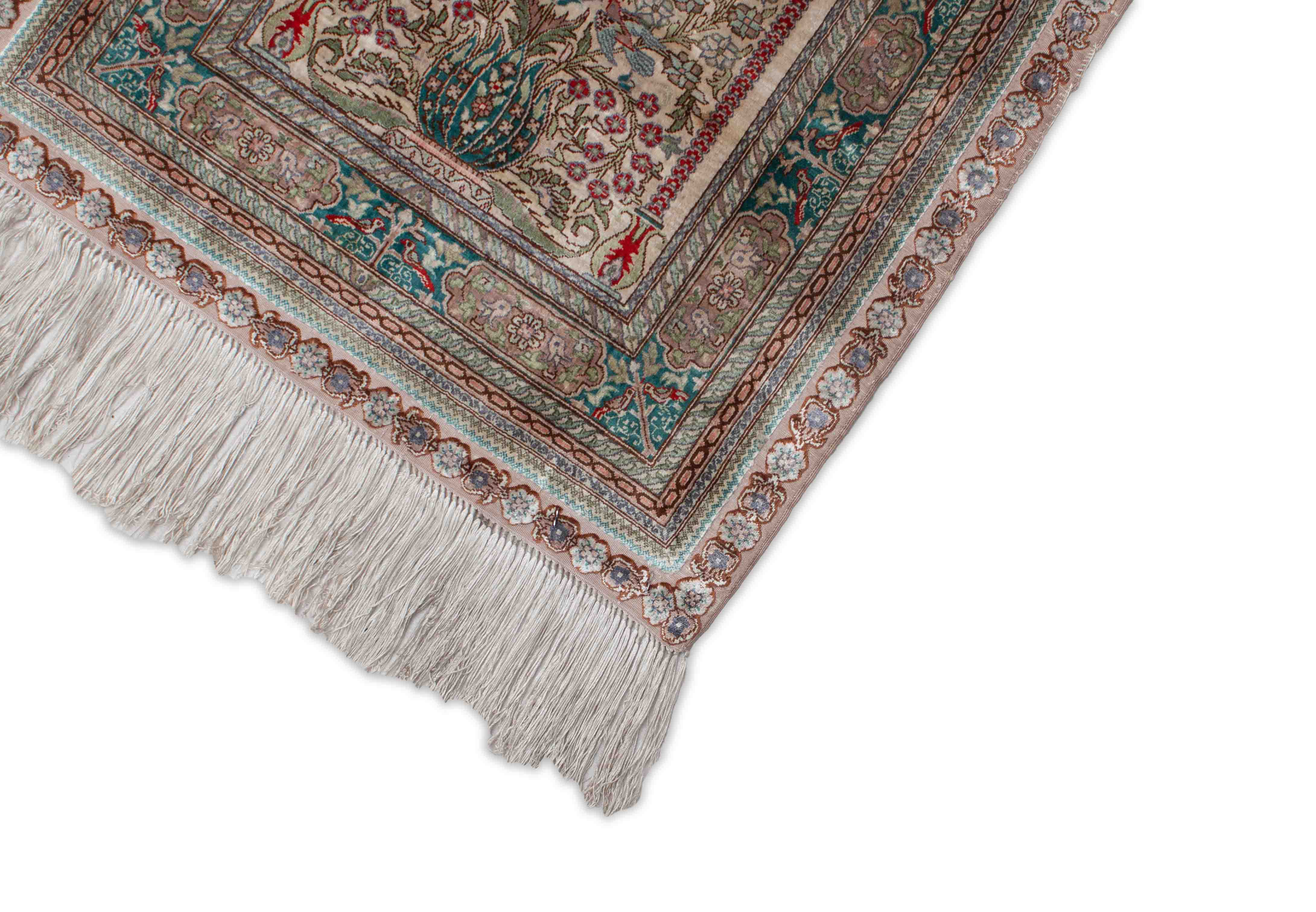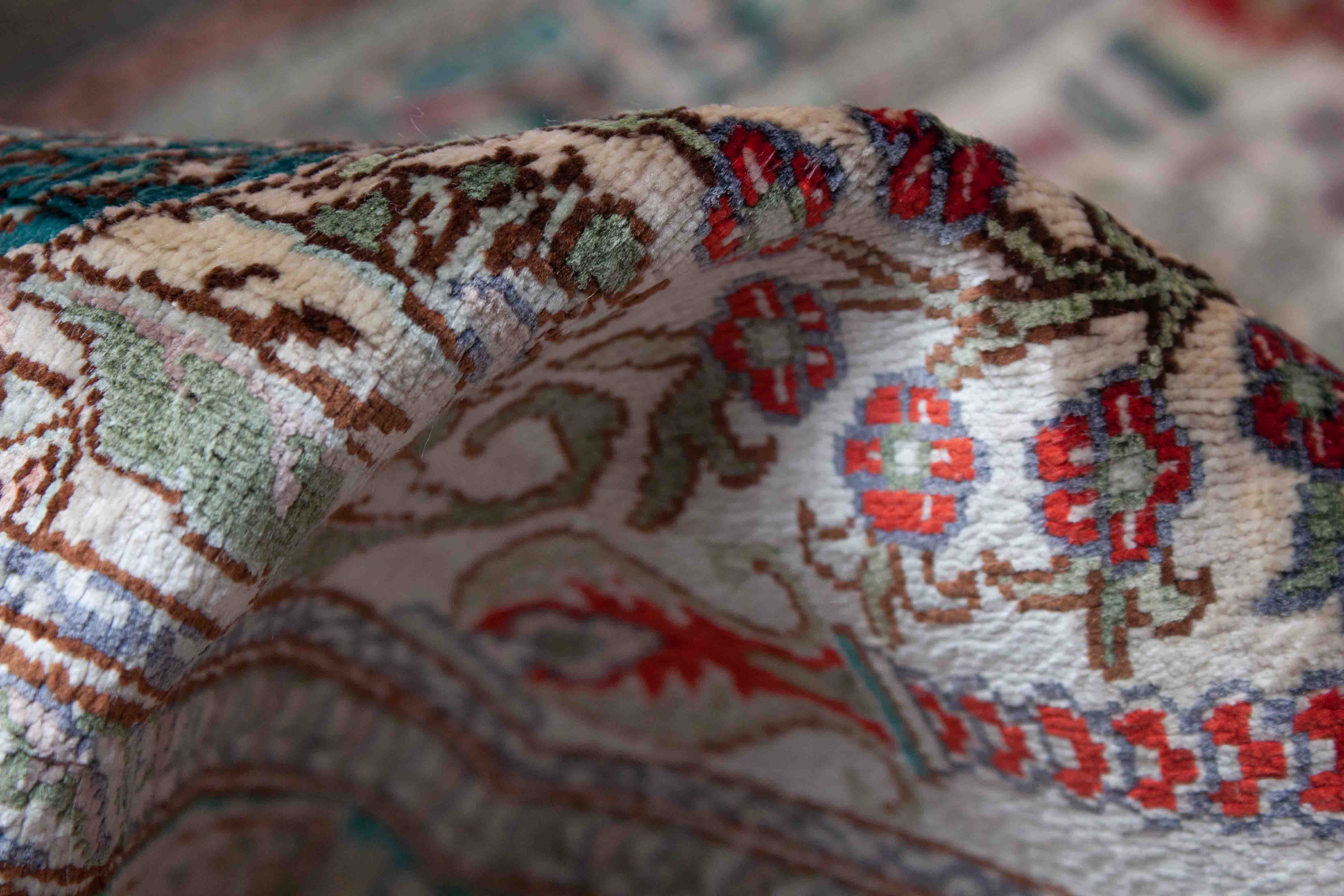 Die Seide des Flors dieses Herekes lässt die Farben des Musters – je nach Lichteinfall – in verschiedenen Facetten erstrahlen. Sie macht diesen Hereke zu einem echten Juwel und schafft eine gemütliche und zugleich sehr elegante und hochwertige Atmosphäre im Raum. Seide wird in Handarbeit aus den Kokons des Seidenspinners gewonnen. Da die einzelnen Seidenfäden äußerst lang sind, lassen sich sehr dünne Garne herstellen, die bei geringem Gewicht trotzdem reißfest sind. Mit dem dünnen Garn lassen sich kleinere Teppichknoten knüpfen und damit feinere Muster erzeugen. Daher werden die feinsten Teppiche der Welt aus reiner Seide handgeknüpft. Bei diesem Hereke wurde sogar der Untergrund aus reiner Seide gefertigt. Durch das dünne, aber strapazierfähige Material der Schuss- und Kettfäden ist eine besonders feine Knüpfung und daher auch ein besonders feines Muster möglich.