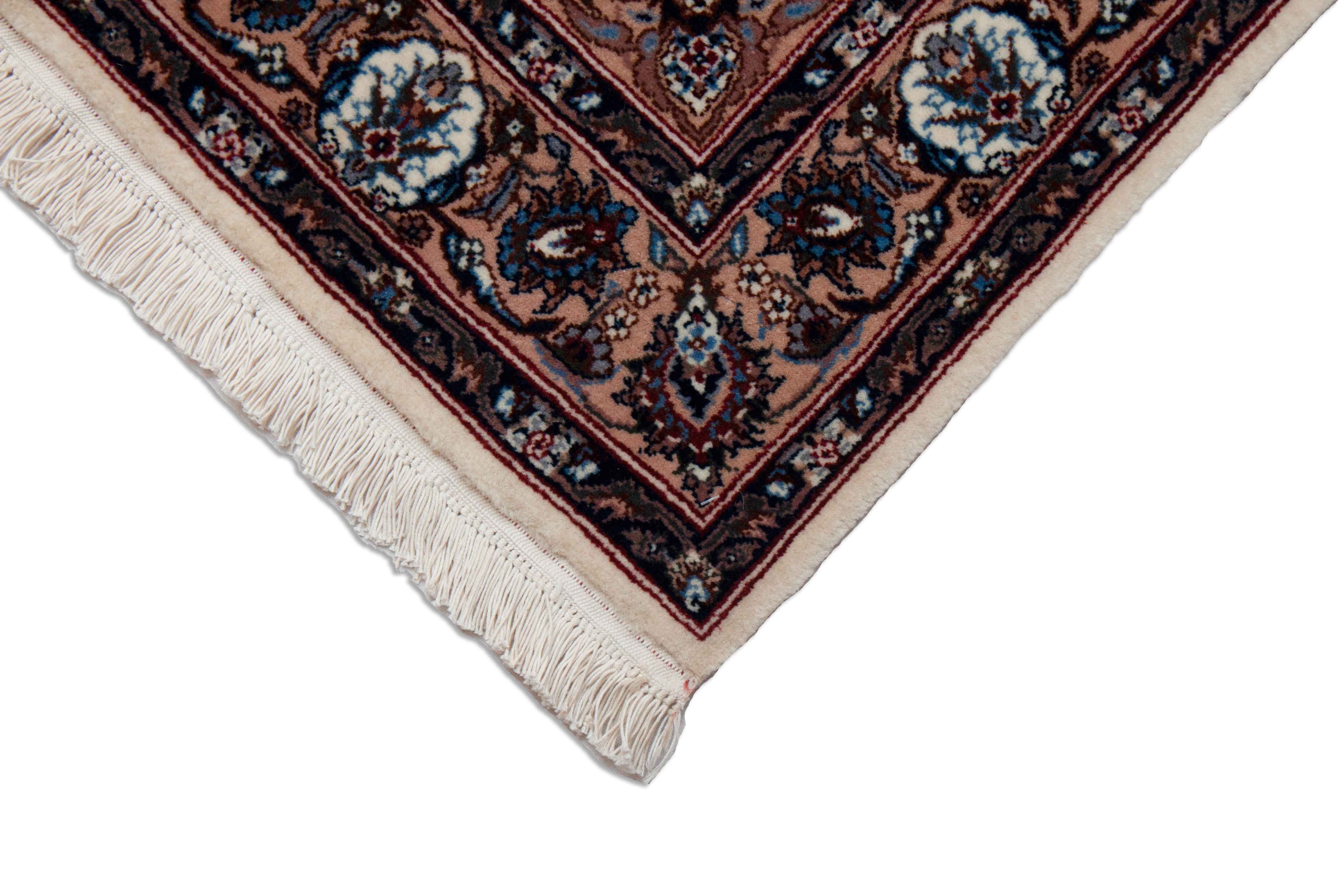 Das Muster dieses Teppichs ist vom Muster klassischer Keshan inspiriert. Dieser Teppich wurde allerdings in China geknüpft. Die zentralpersische Stadt Keshan (auch Kashan oder Keschan) liegt geografisch zwischen den Berghängen des Zagros Gebirges und den persischen Wüstengebieten. Aufgrund ihres Klimas und der Karawanen, die durchs Land zogen war es - zumindest bist die Safawiden ihren Regierungssitz nach Isfahan verlegten - eine blühende Metropole, die insbesondere für ihre Stoff- und Teppichproduktion bekannt ist. Sie ist bis heute geprägt von der Eleganz und Pracht der damaligen Epoche. Die Keshan Teppiche sind in antiker Tradition gefertigte, kunstvolle Textilerzeugnisse. Die Produktion in Keshan fand traditionell in den Häusern der Knüpfer statt. Der Flor ist typischerweise aus äußerst weicher Wolle geknüpft und dadurch besonders dicht und kompakt.