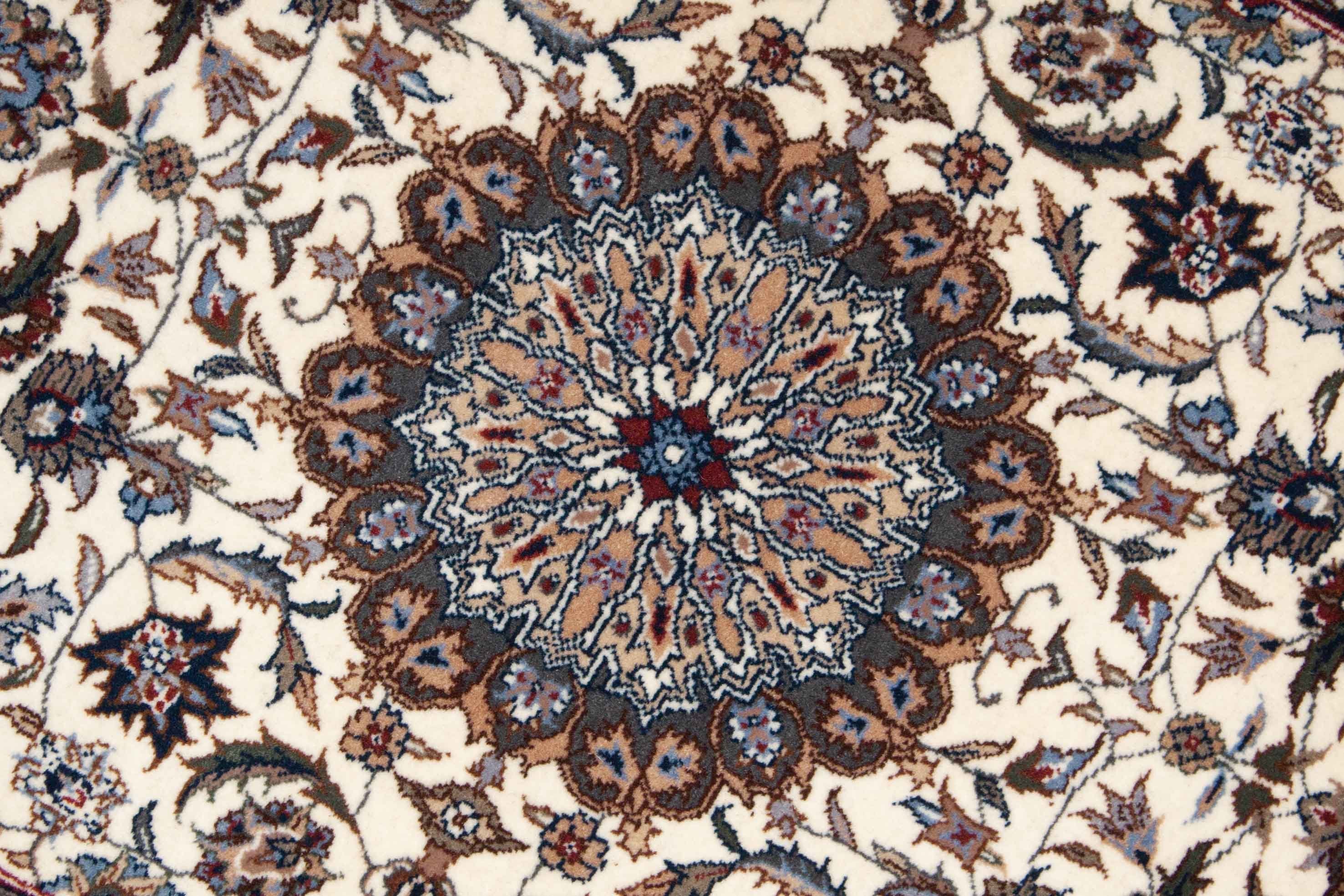 Die wiederholenden Elemente dieses Keshan Tepppichs haben kein spezifisches Zentrum. Das wiederkehrende Rapportmuster wirkt beruhigend aber nicht langweilig. Teppiche mit Rapportmuster werden auch als durchgemustert bezeichnet.