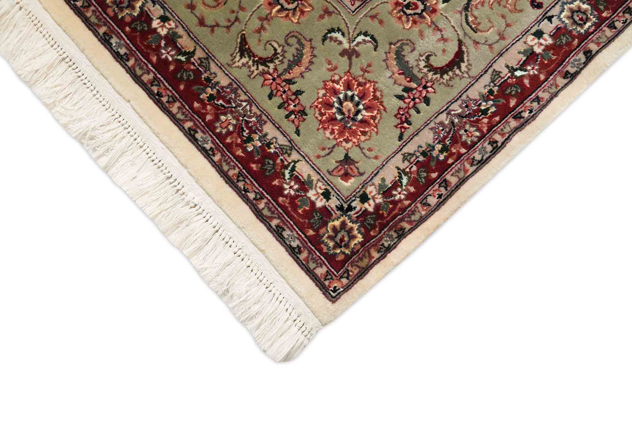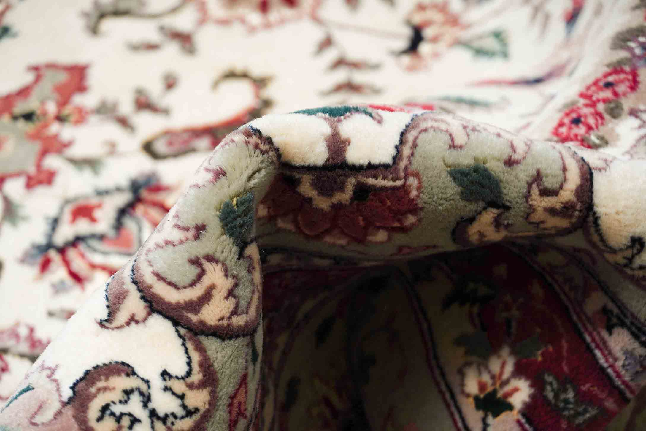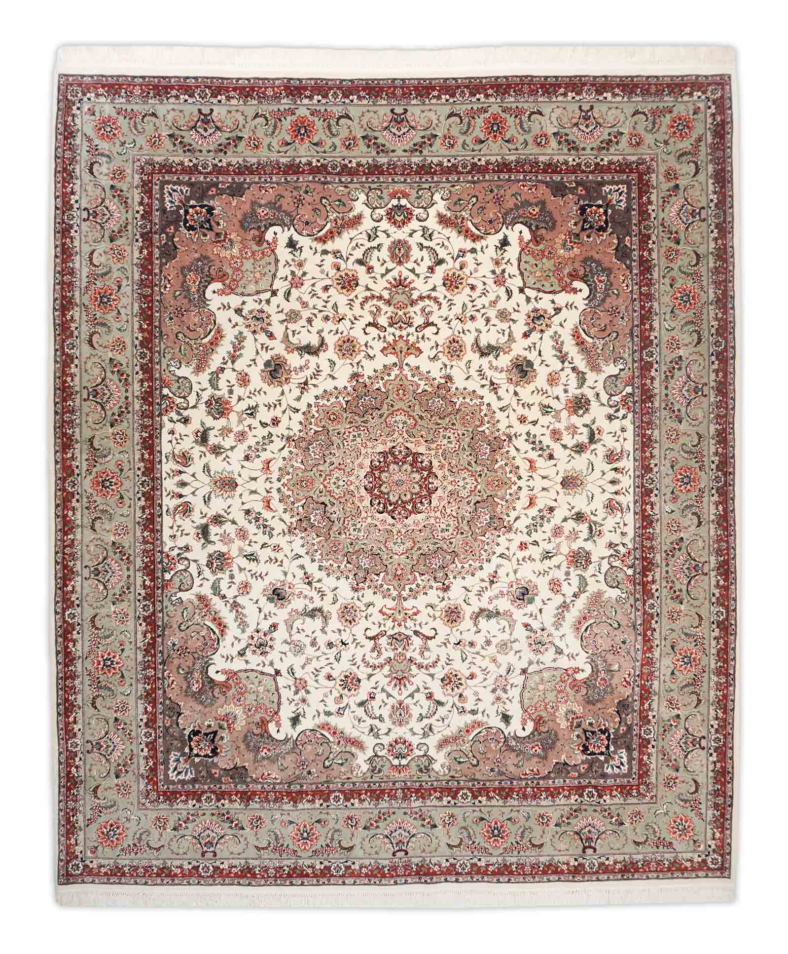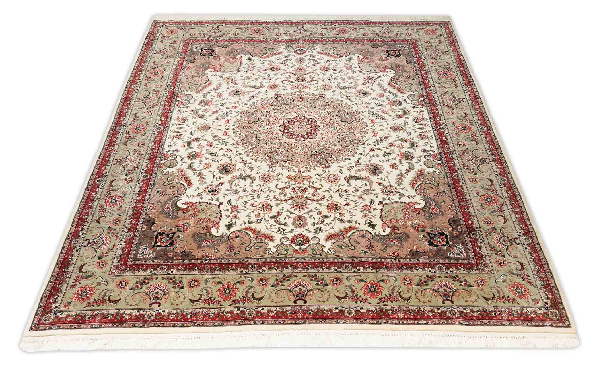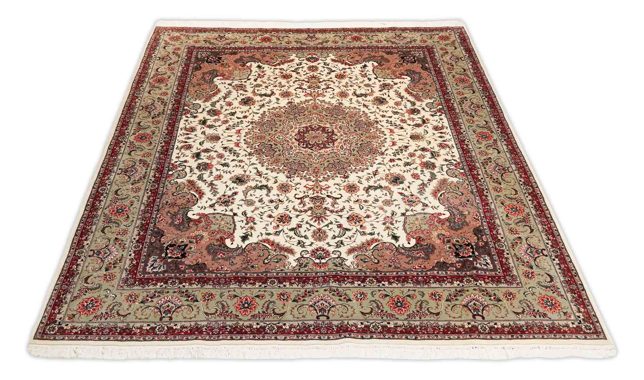 Der Flor dieses Täbriz wurde aus Korkwolle und Seide handgeknüpft. Kork- oder auch Kurkwolle ist ein besonders feinfädiges, sich fast samten anfühlendes Knüpfgarn. Die Korkwolle wird dem Nacken, dem Bauch und den Innenseiten der Beine der Schafe entnommen und ist besonders hochwertig. Das Muster dieses Täbriz ist mit glänzender reiner Seide, die in Handarbeit aus den Kokons des Seidenspinners gewonnen wird, abgesetzt. Die Seidenelemente erzeugen einen schimmernden Kontrast und lassen die Farben – je nach Lichteinfall – in verschiedenen Nuancen erstrahlen. Die Schuss- und Kettfäden dieses Täbriz bestehen aus Baumwolle. Das vielseitige Material ist reißfest und dehnbar und daher besonders geeignet für ein strapazierfähiges Untergewebe.