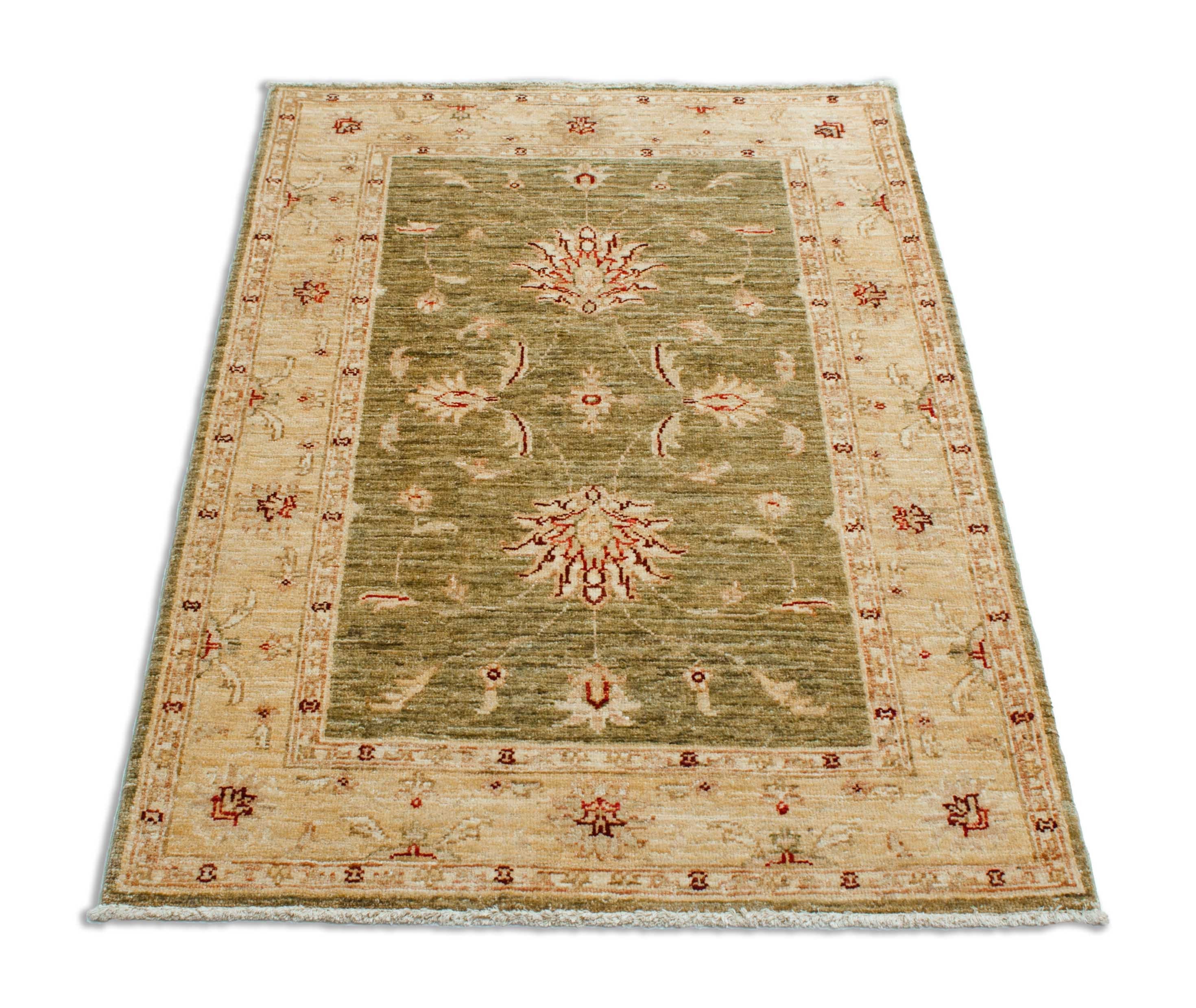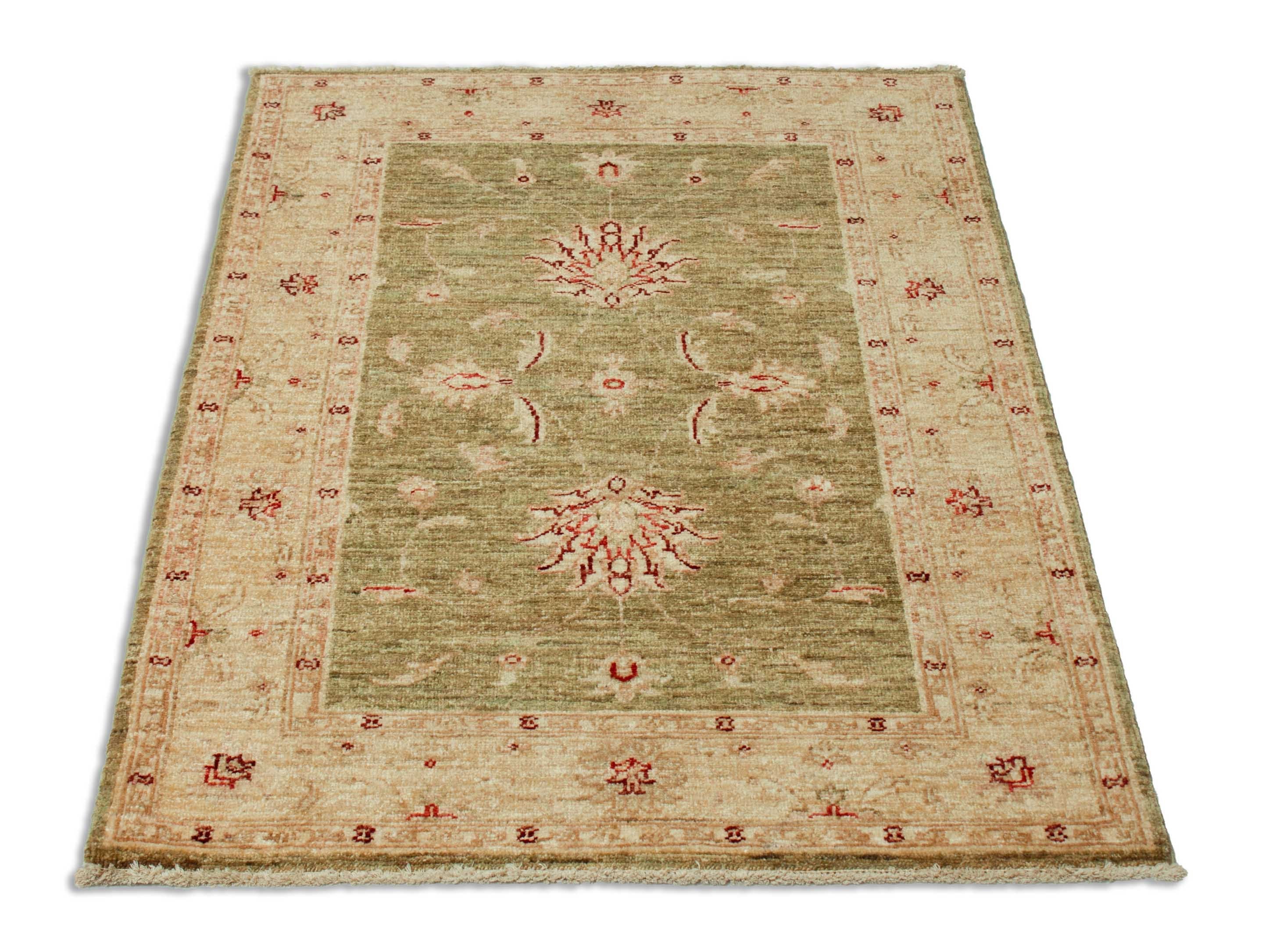 Der Hintergrund dieses Farahans ist Olivgrün. Der Rand ist in den Farben Beigegelb und Olivgrün gestaltet.