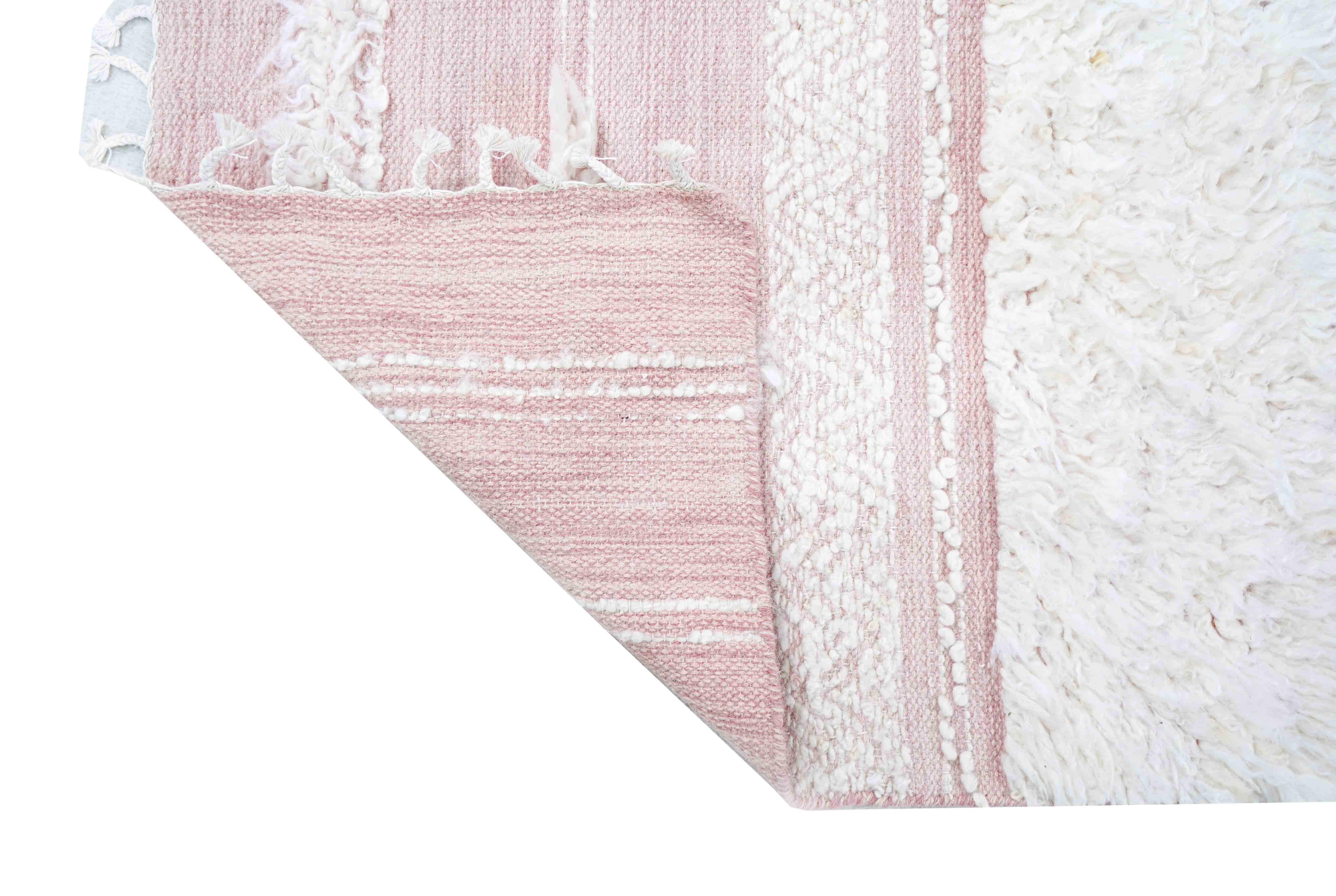 Zusammen ergeben diese unterschiedlichen Techniken einen faszinierenden Kontrast und eine abwechslungsreiche Textur, die sowohl das Auge als auch den Tastsinn anspricht. Jeder Furry Kelims ist ein Unikat und zeigt die Fähigkeiten und das Talent der Knüpferinnen, die ihn geschaffen hat. Dieses Stück wurde halb geknüpft und halb gewebt.