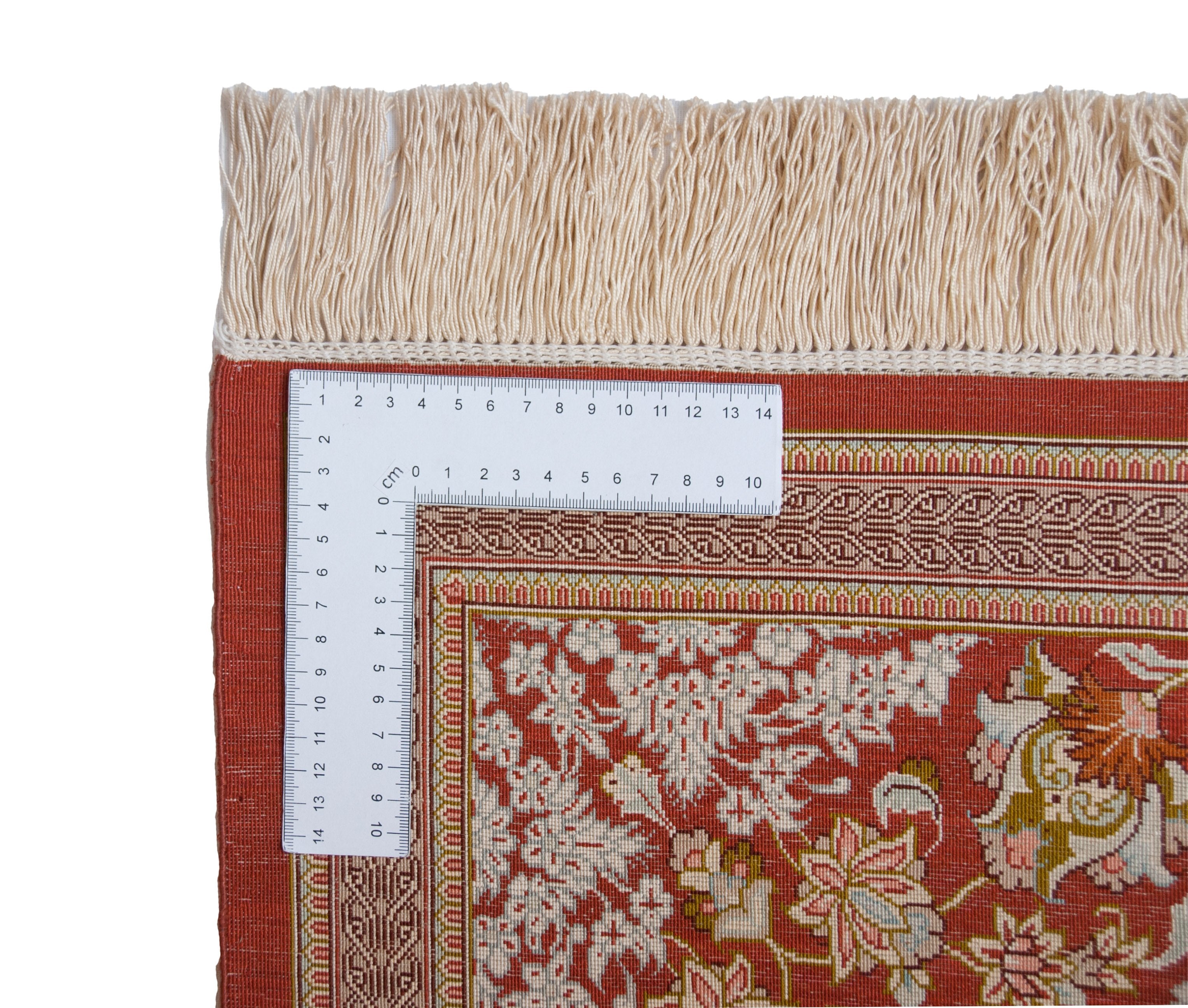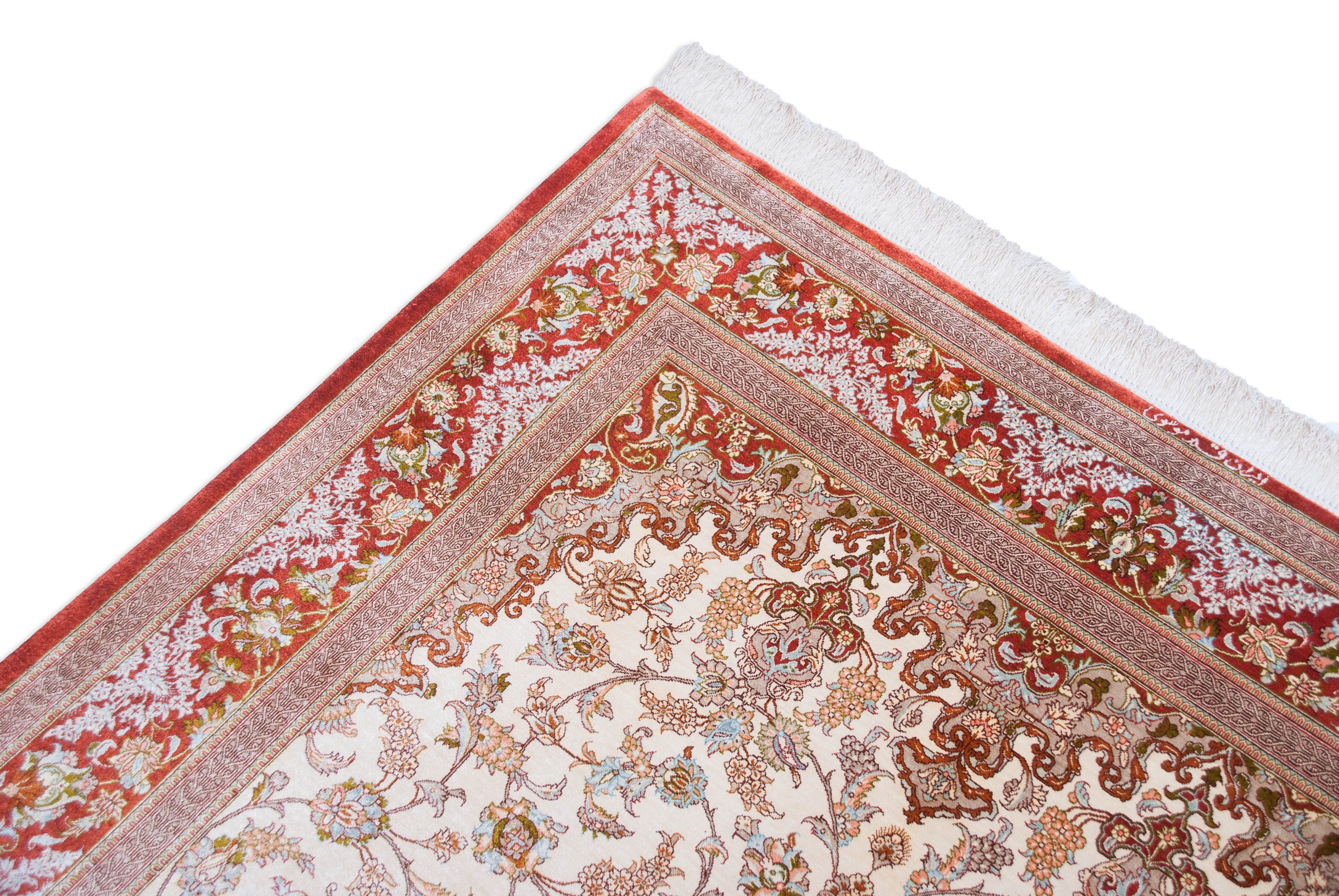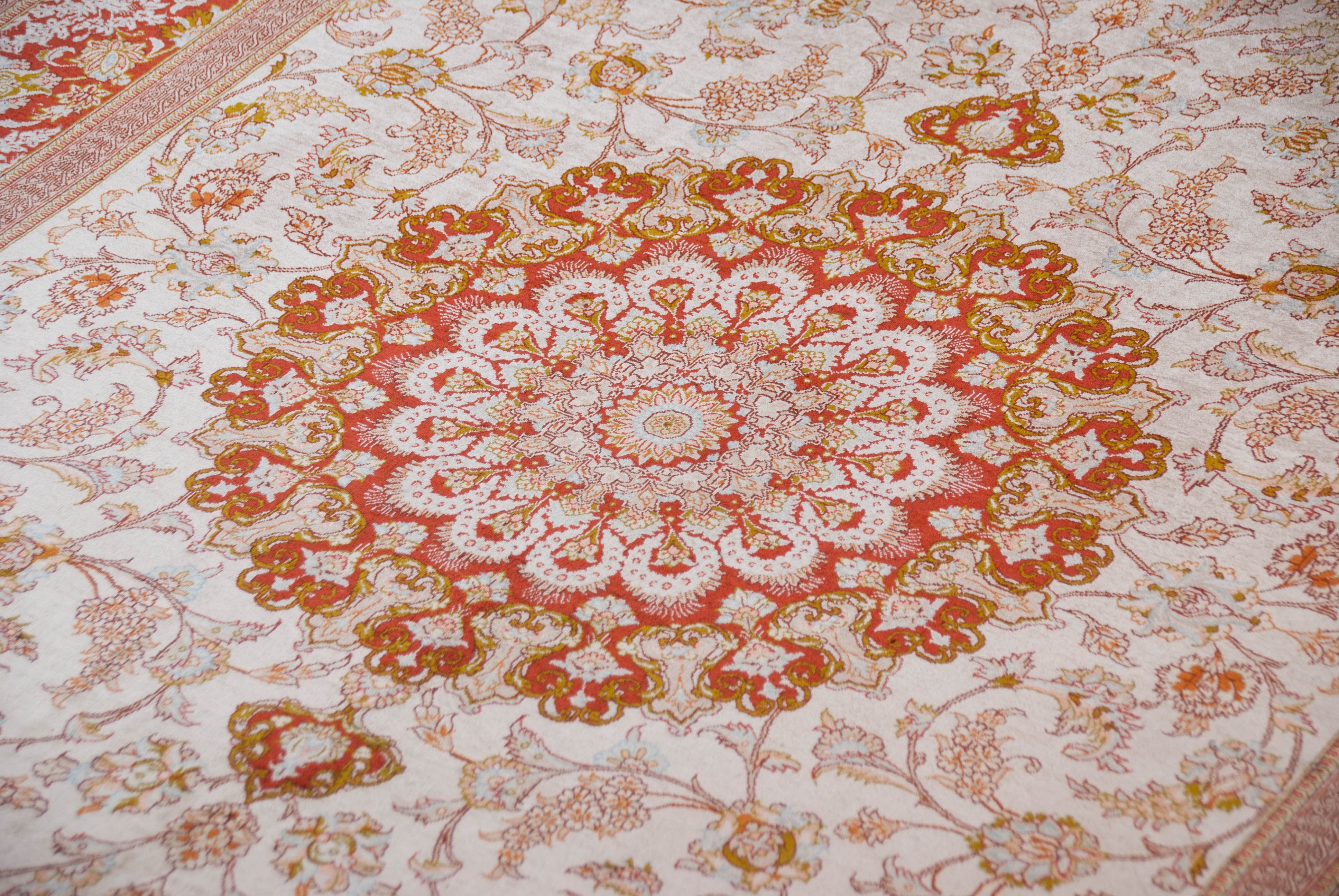 Die Seide des Flors dieses Ghoms lässt die Farben des Musters – je nach Lichteinfall – in verschiedenen Nuancen erstrahlen. Sie macht diesen Ghom zu einem echten Highlight und schafft eine gemütliche und zugleich sehr elegante und hochwertige Atmosphäre im Raum. Seide wird in Handarbeit aus den Kokons des Seidenspinners gewonnen. Da die einzelnen Seidenfäden äußerst lang sind, lassen sich sehr dünne Garne herstellen, die bei geringem Gewicht trotzdem reißfest sind. Mit dem dünnen Garn lassen sich kleinere Teppichknoten knüpfen und damit feinere Muster erzeugen. Daher werden die feinsten Teppiche der Welt aus reiner Seide handgeknüpft. Bei diesem Ghom wurde sogar der Untergrund aus reiner Seide gefertigt. Durch das dünne, aber strapazierfähige Material der Schuss- und Kettfäden ist eine besonders feine Knüpfung und daher auch ein besonders feines Muster möglich.