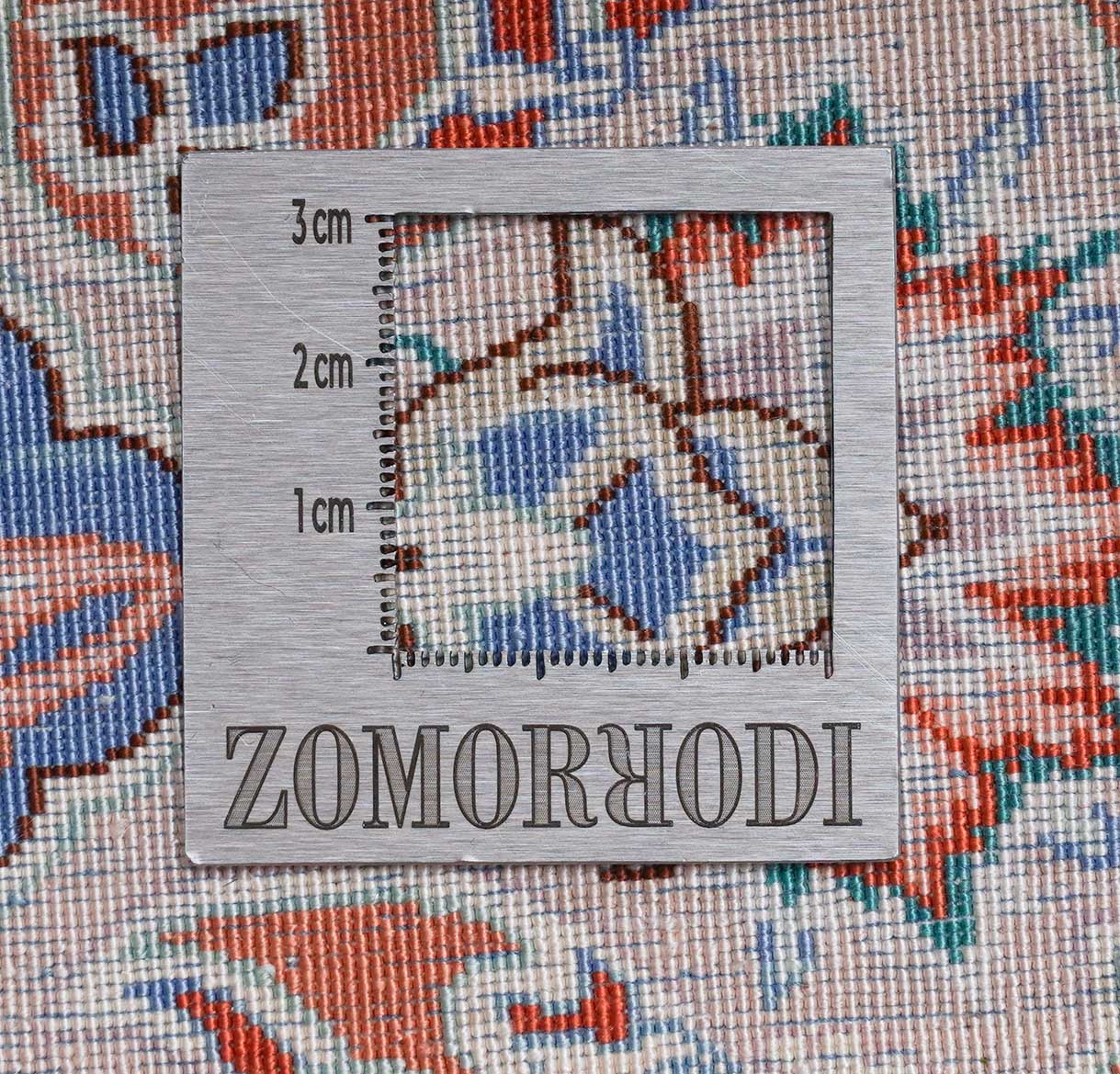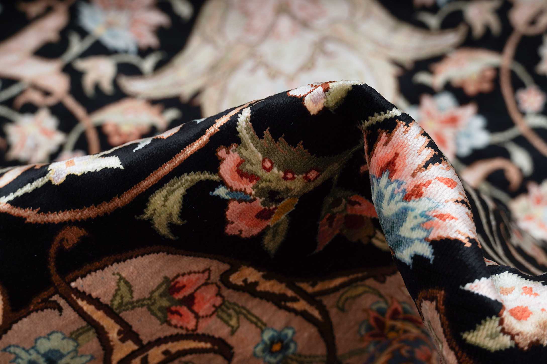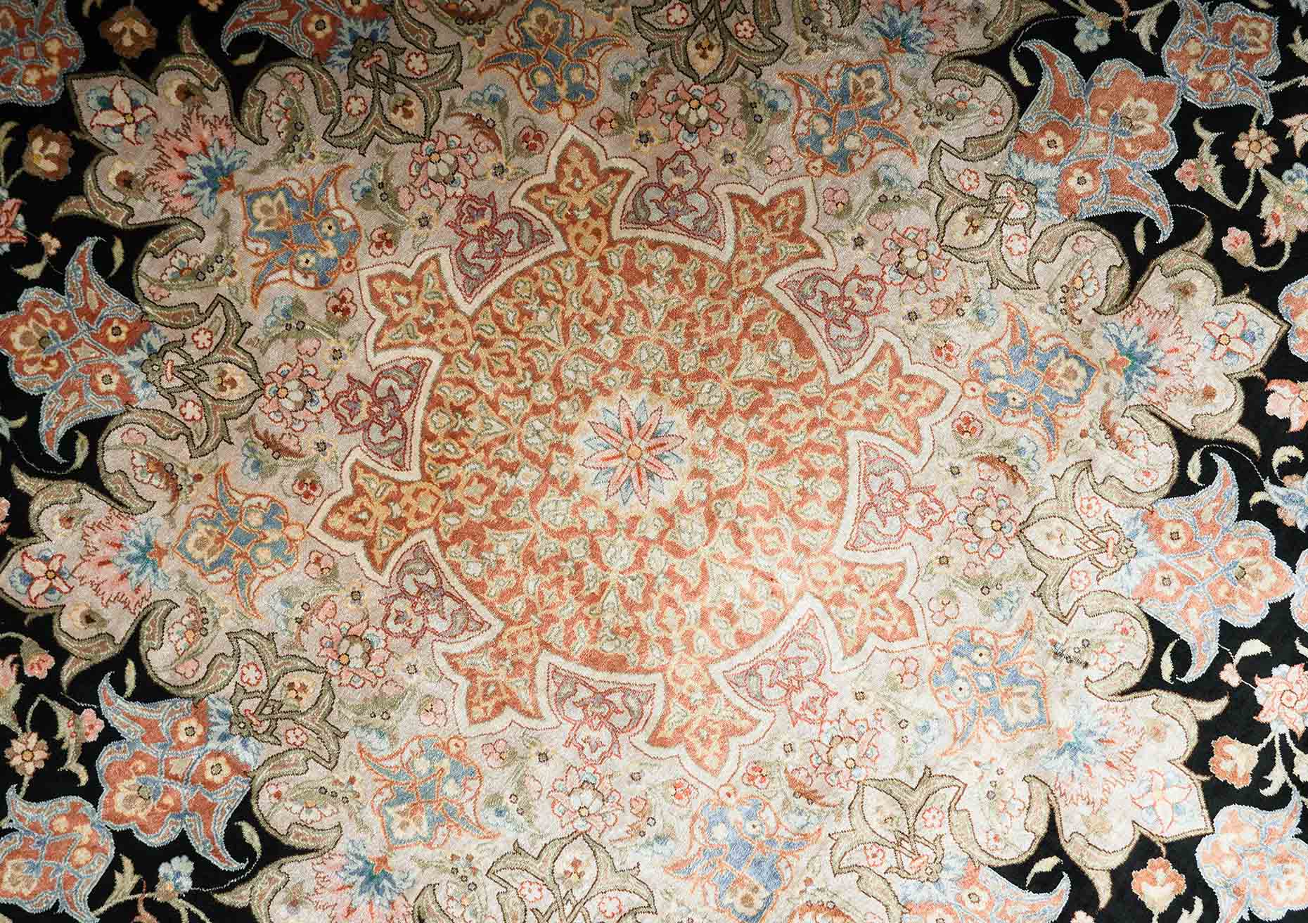 Die Seide des Flors dieses Ghoms lässt die Farben des Musters – je nach Lichteinfall – in verschiedenen Facetten erstrahlen. Sie macht diesen Ghom zu einem echten Juwel und schafft eine gemütliche und zugleich sehr elegante und hochwertige Atmosphäre im Raum. Seide wird in Handarbeit aus den Kokons des Seidenspinners gewonnen. Da die einzelnen Seidenfäden äußerst lang sind, lassen sich sehr dünne Garne herstellen, die bei geringem Gewicht trotzdem reißfest sind. Mit dem dünnen Garn lassen sich kleinere Teppichknoten knüpfen und damit feinere Muster erzeugen. Daher werden die feinsten Teppiche der Welt aus reiner Seide handgeknüpft. Bei diesem Ghom wurde sogar der Untergrund aus reiner Seide gefertigt. Durch das dünne, aber strapazierfähige Material der Schuss- und Kettfäden ist eine besonders feine Knüpfung und daher auch ein besonders feines Muster möglich.