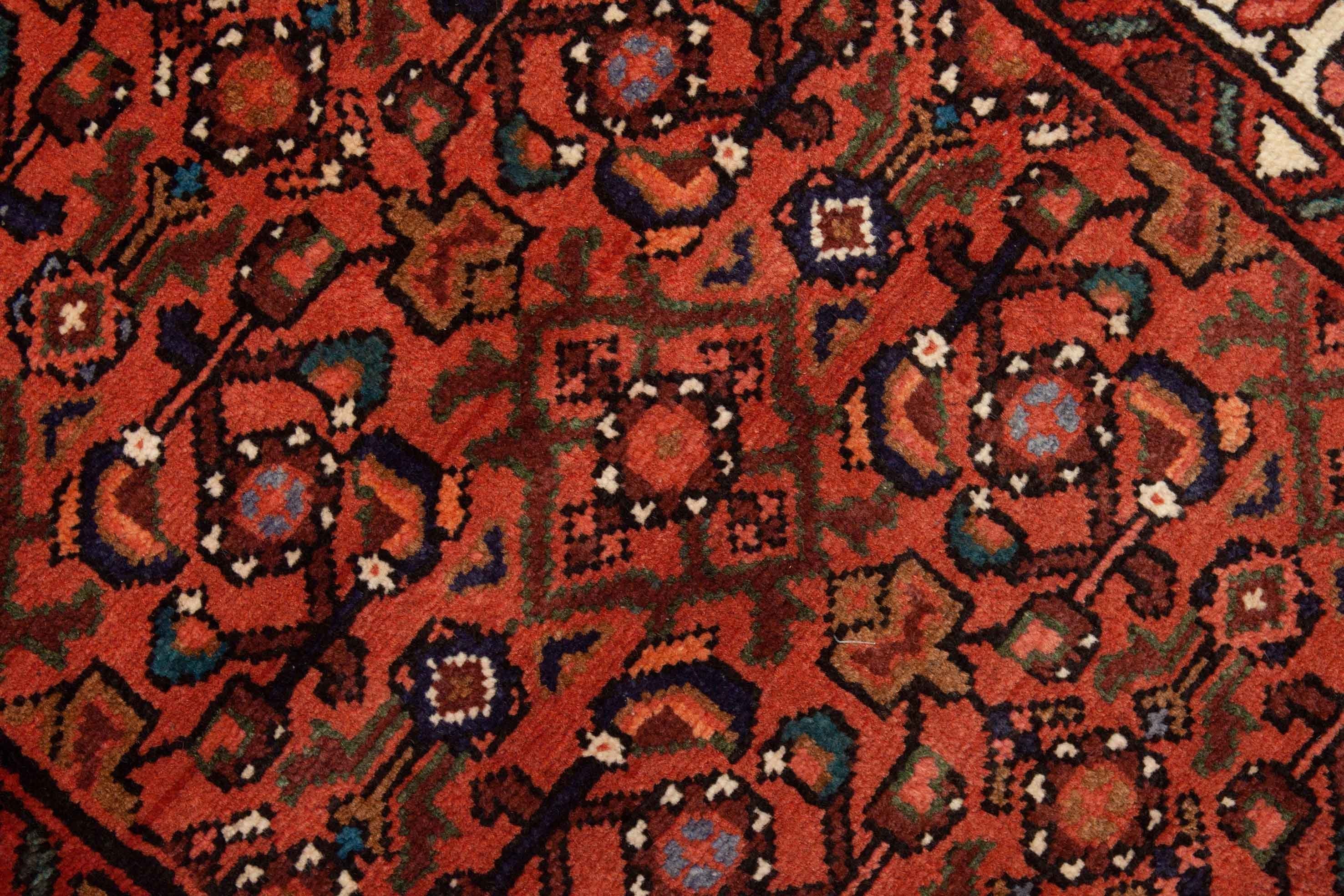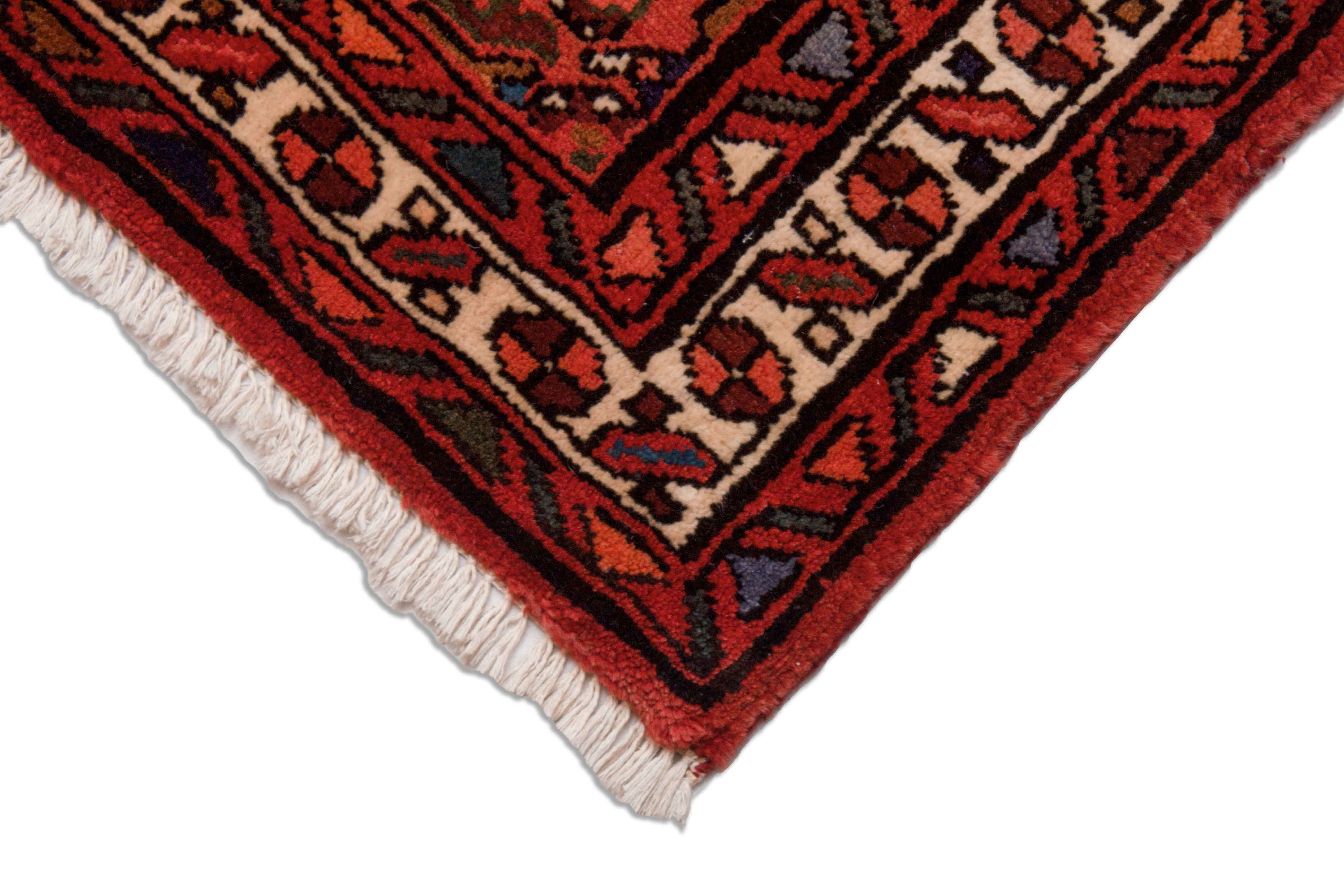 Die wiederholenden Elemente dieses Hosseinabad Tepppichs haben kein spezifisches Zentrum. Das wiederkehrende Rapportmuster wirkt beruhigend aber nicht langweilig. Teppiche mit Rapportmuster werden auch als durchgemustert bezeichnet.