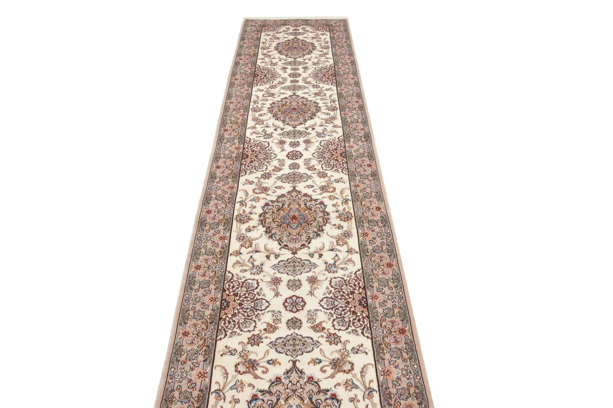 Die Stadt Isfahan gehört zu den architektonischen Perlen der islamischen Welt. Ihre künstlerische Tradition, das historische Stadtbild und die wohl einzigartige Architektur verdankt Isfahan der Safawiden-Dynastie und insbesondere Schah Abbas. Typisch für das Muster der Isfahan Teppiche sind florale Motive. Weit verbreitet sind vierer- oder längssymmetrische Designs mit einem Medaillon in der Mitte, umgeben von Arabesken, Blüten oder Vögeln. Die Grundfarbe ist meist klassisch Rot, typisch sind auch ein leuchtendes Blau und ein helles Beige. Mit meist mehr als 15 Farbtönen ist der Isfahan aber ausgesprochen farbenfroh. Die Bordüren sind häufig Grünblau und mit Blumenranken und Palmetten verziert.