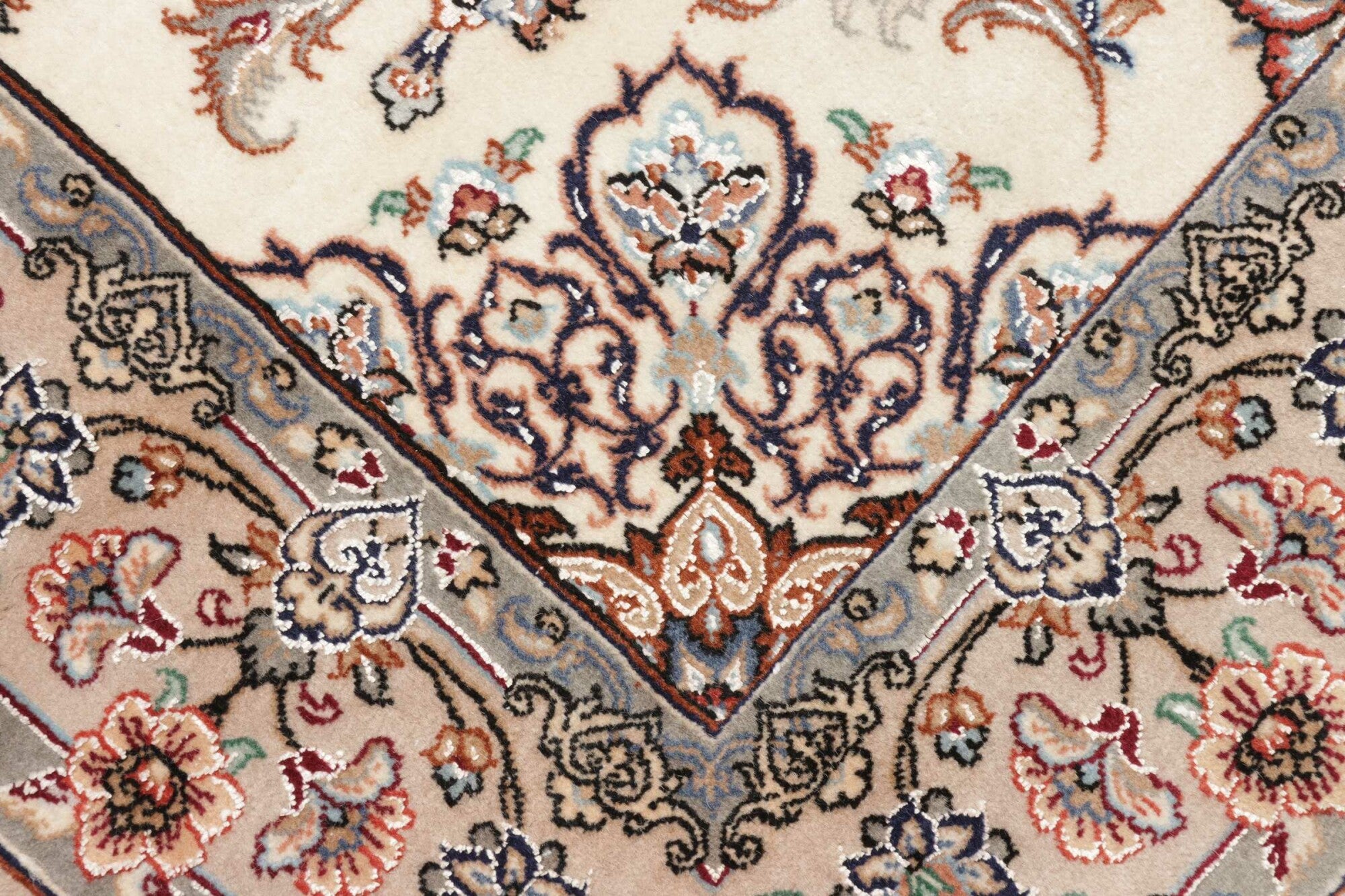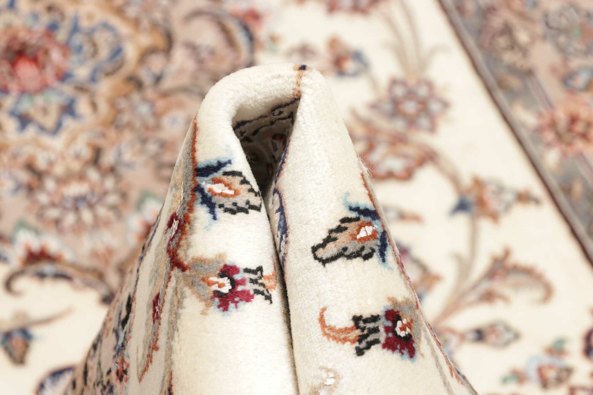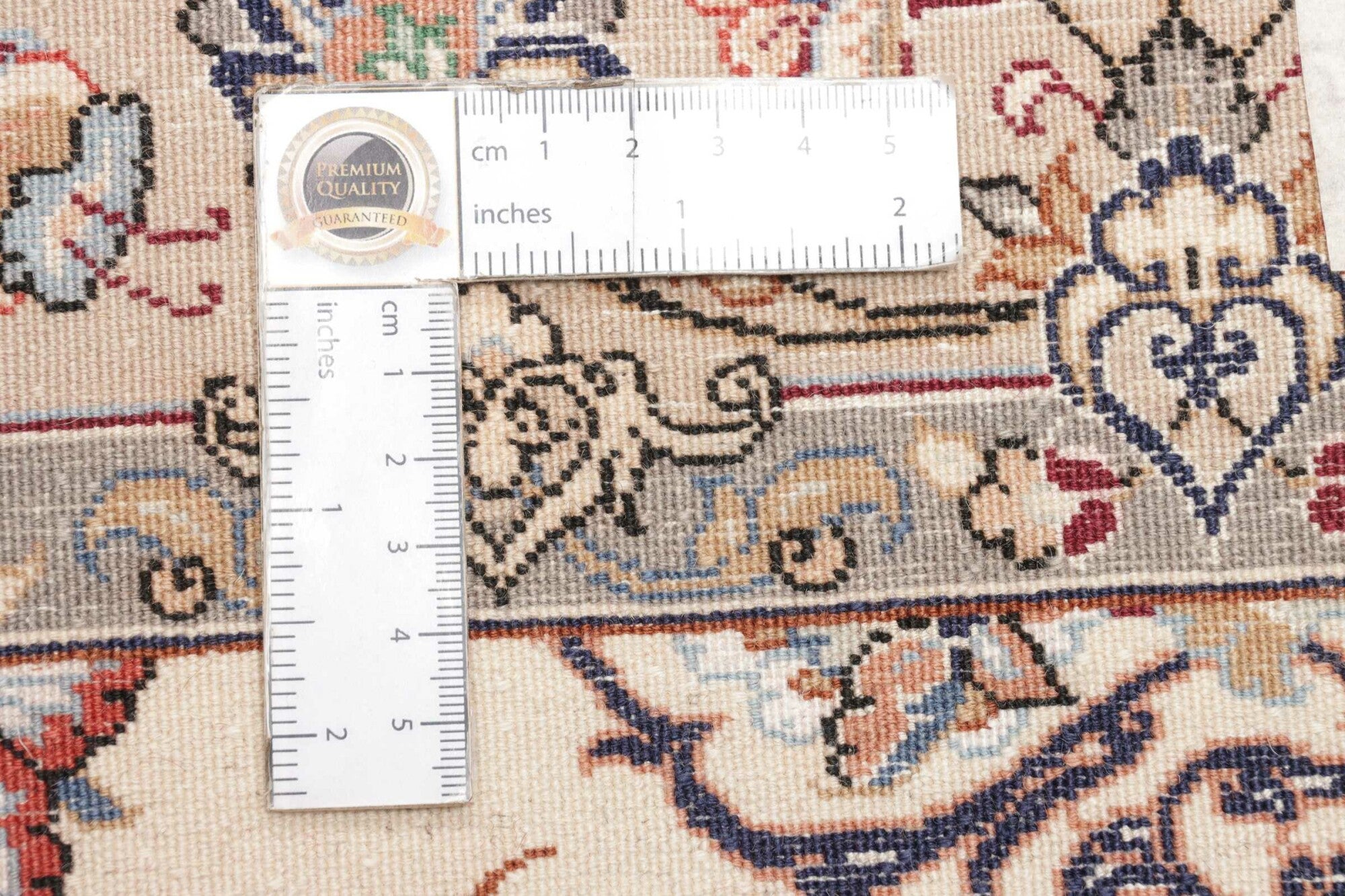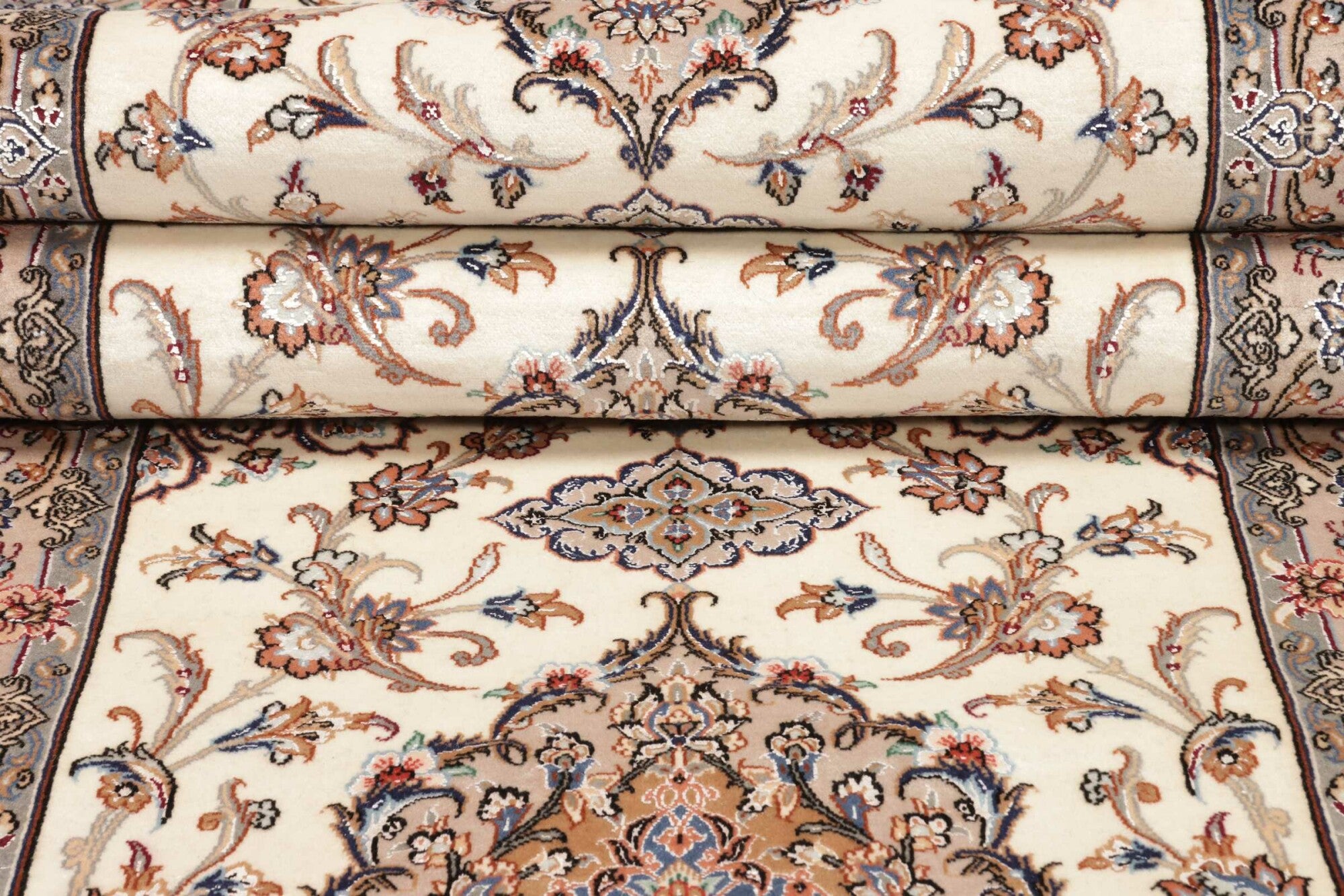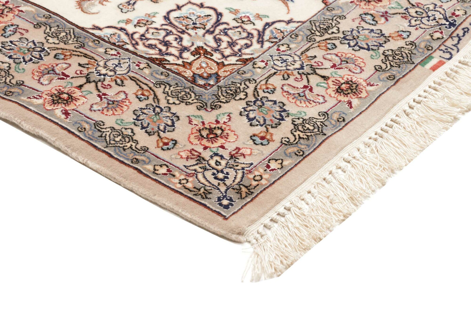 Der Flor dieses Isfahans wurde aus hochwertiger Schurwolle handgeknüpft. Schurwolle wird durch das schonende Scheren von Schafen gewonnen. Schurwolle ist ein nachwachsender, natürlicher Rohstoff mit einer Reihe beeindruckender Eigenschaften: Durch den natürlichen Fettgehalt der Wolle stößt die Oberfläche Wassertropfen ab und ist so auf natürliche Weise gegen Schmutz imprägniert. Wolle bietet außerdem eine hervorragende Wärmeisolation, wirkt regulierend auf das Wohnklima und dämpft den Schall.