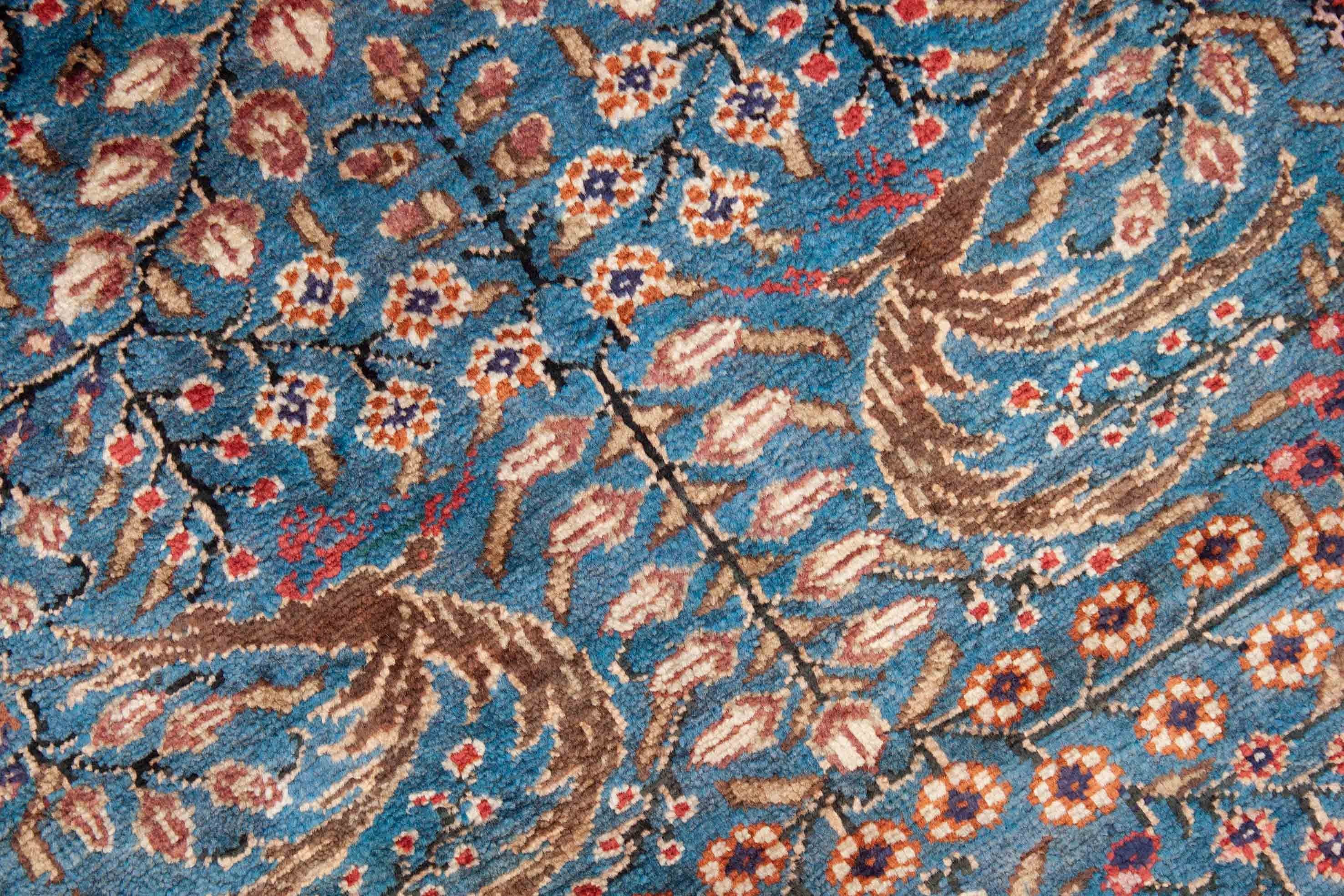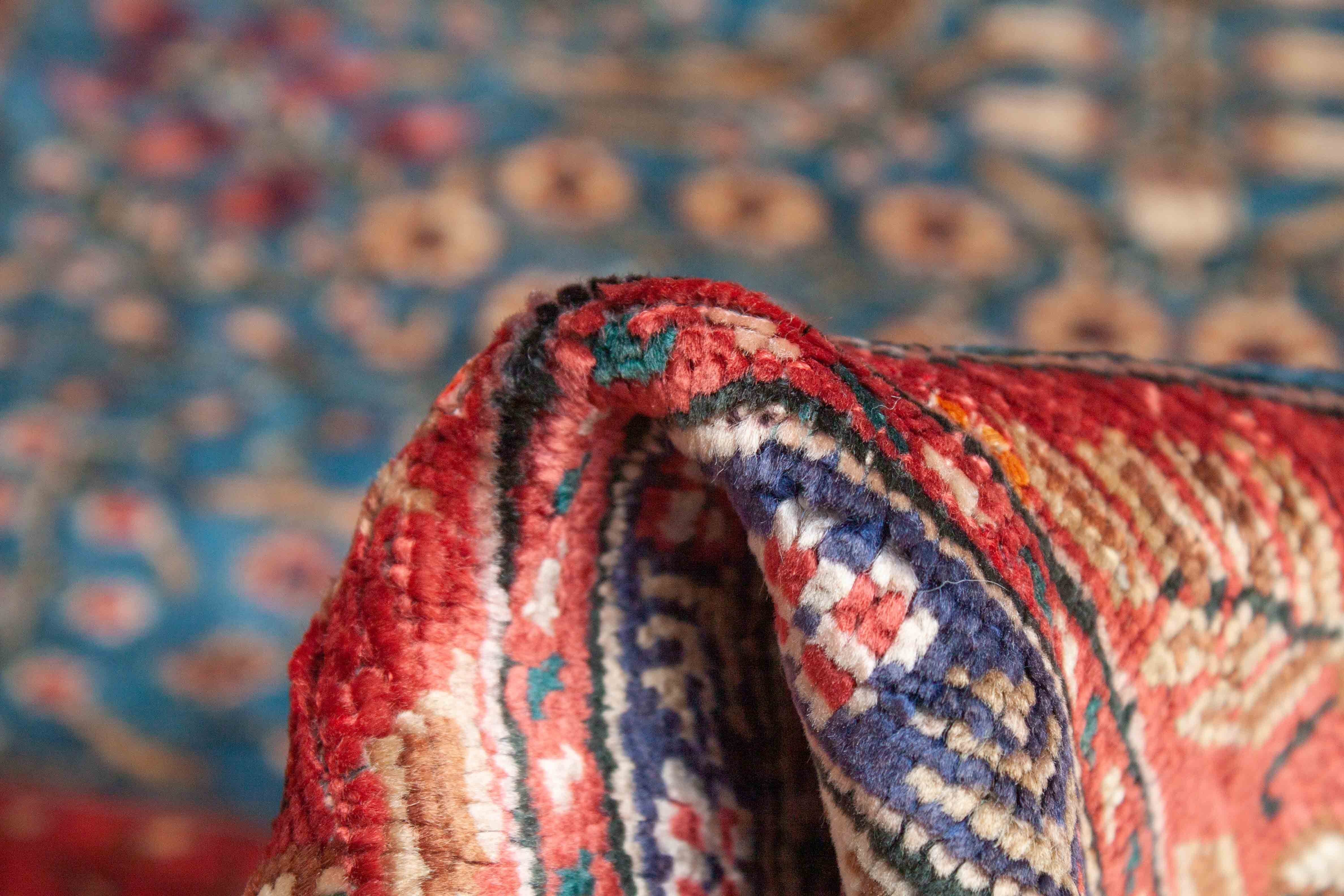 Der Hintergrund dieses Kayseris ist Hellblau. Im Gesamteindruck dominieren außerdem die Farben Dunkelrot und Hellblau. Der Rand ist in den Farben Dunkelrot, Beige und Flieder gestaltet.