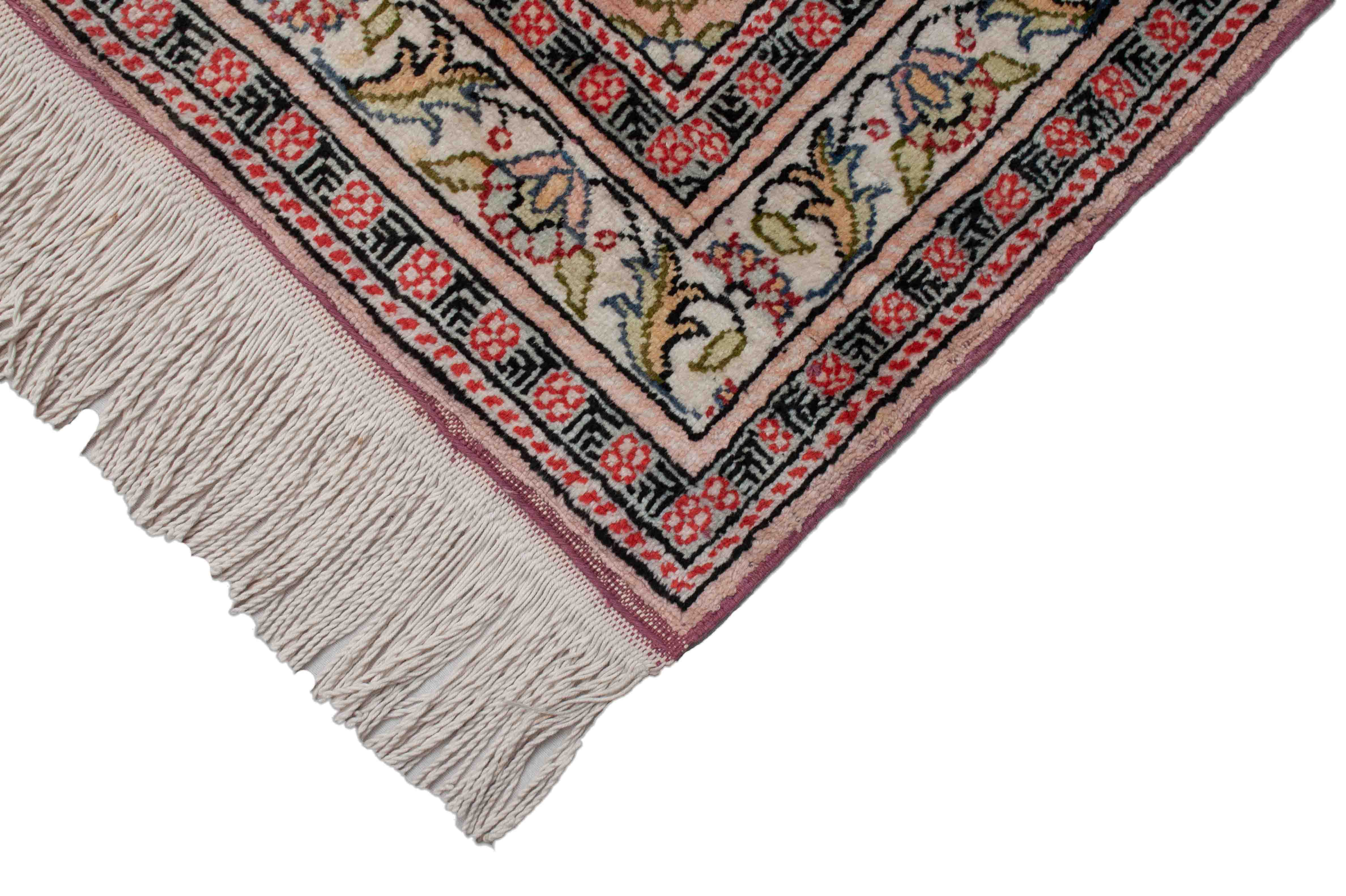 Der Hintergrund dieses Kayseris ist Altrosa. Der Rand ist in den Farben Creméweiß, Altrosa und Schwarz gestaltet.