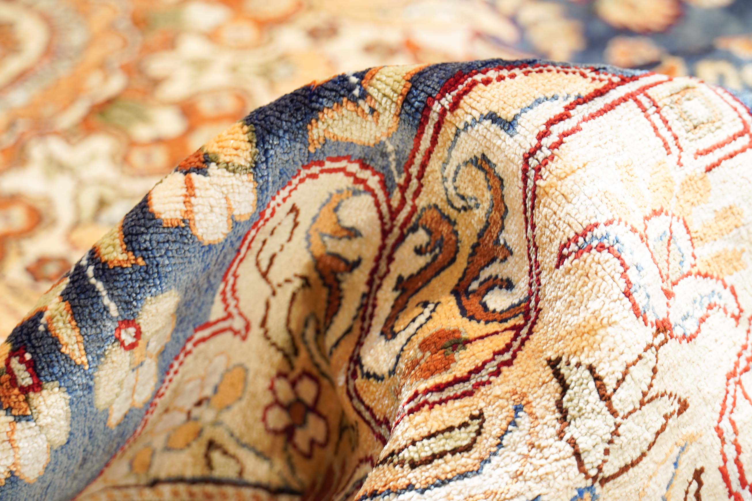 Die Seide des Flors dieses Kayseris lässt die Farben des Musters – je nach Lichteinfall – in verschiedenen Nuancen erstrahlen. Sie macht diesen Kayseri zu einem echten Highlight und schafft eine gemütliche und zugleich sehr elegante und hochwertige Atmosphäre im Raum. Seide wird in Handarbeit aus den Kokons des Seidenspinners gewonnen. Da die einzelnen Seidenfäden äußerst lang sind, lassen sich sehr dünne Garne herstellen, die bei geringem Gewicht trotzdem reißfest sind. Mit dem dünnen Garn lassen sich kleinere Teppichknoten knüpfen und damit feinere Muster erzeugen. Daher werden die feinsten Teppiche der Welt aus reiner Seide handgeknüpft. Bei diesem Kayseri wurde sogar der Untergrund aus reiner Seide gefertigt. Durch das dünne, aber strapazierfähige Material der Schuss- und Kettfäden ist eine besonders feine Knüpfung und daher auch ein besonders feines Muster möglich.