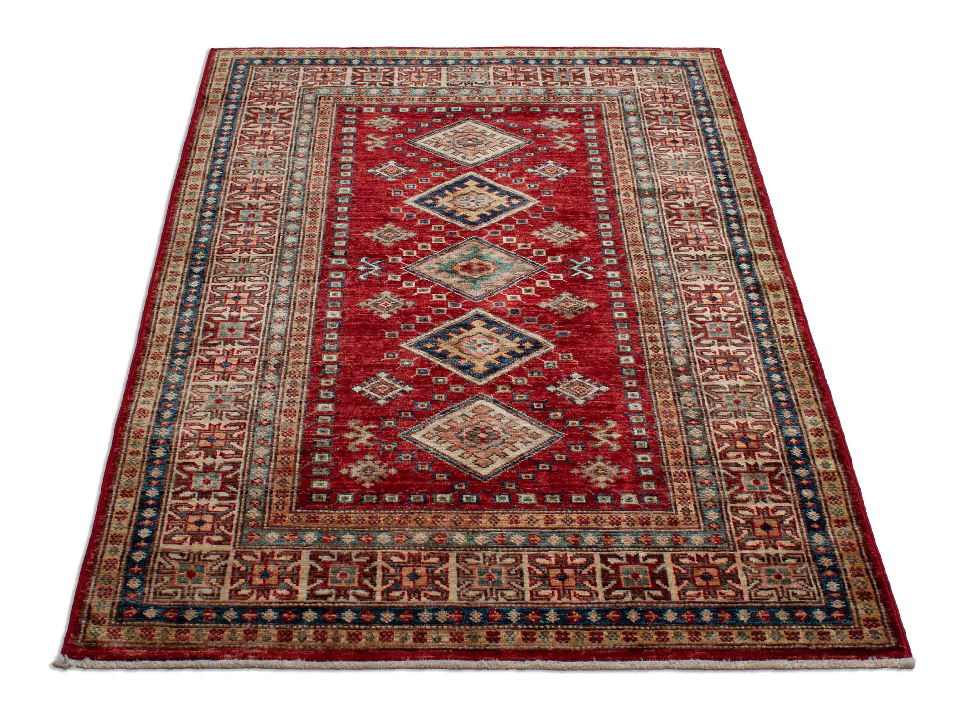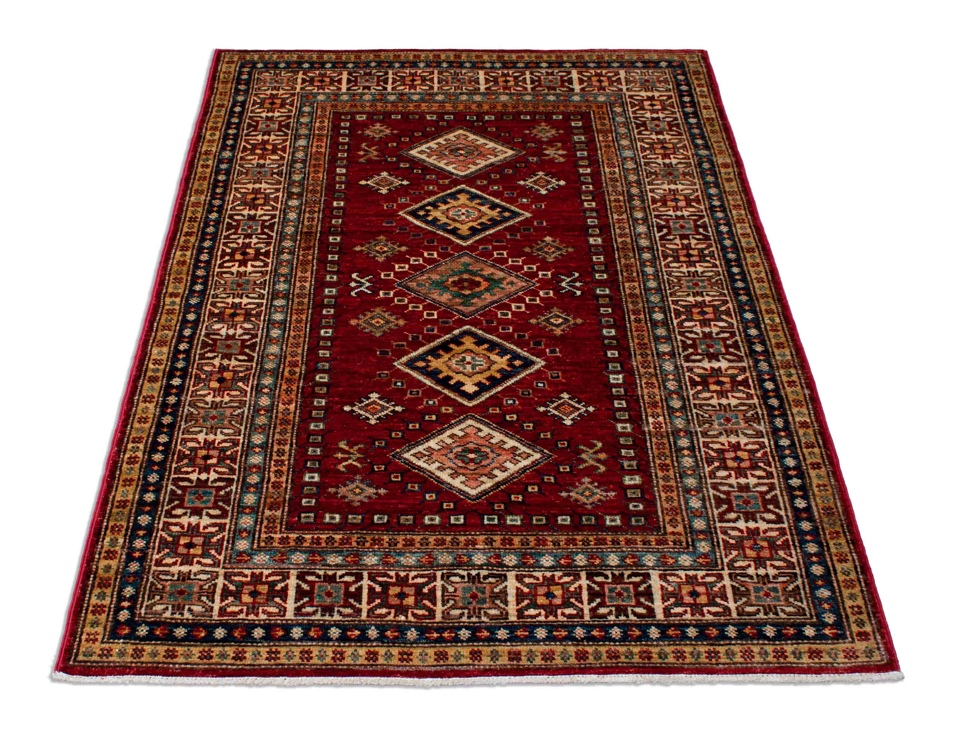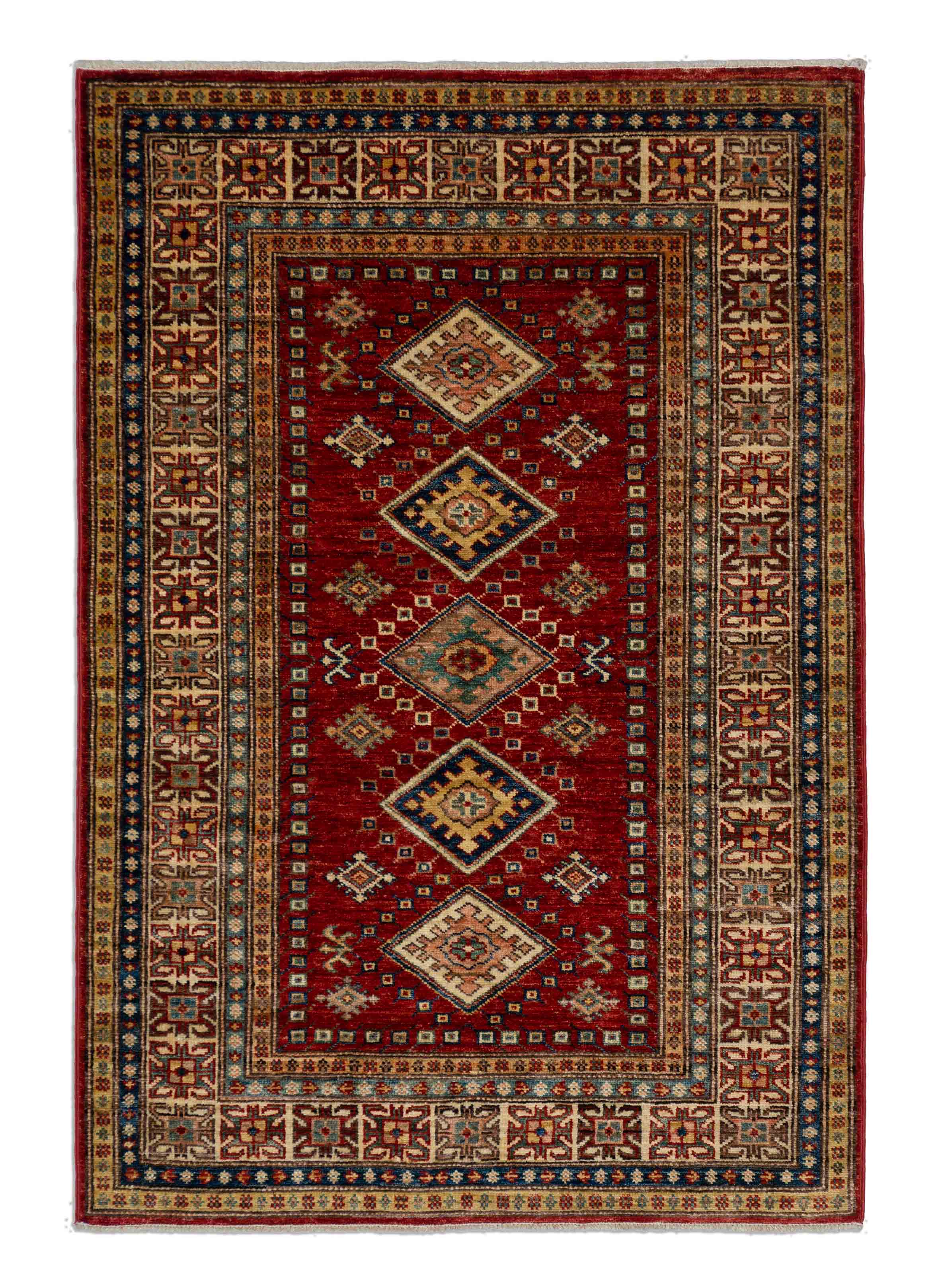 Der Hintergrund dieses Kazaks ist Dunkelrot. Der Rand ist in den Farben Beige, Dunkelblau und Gold gestaltet. In dem türkisen Zentrum sind die Farben Altrosa und Dunkelrot kombiniert.