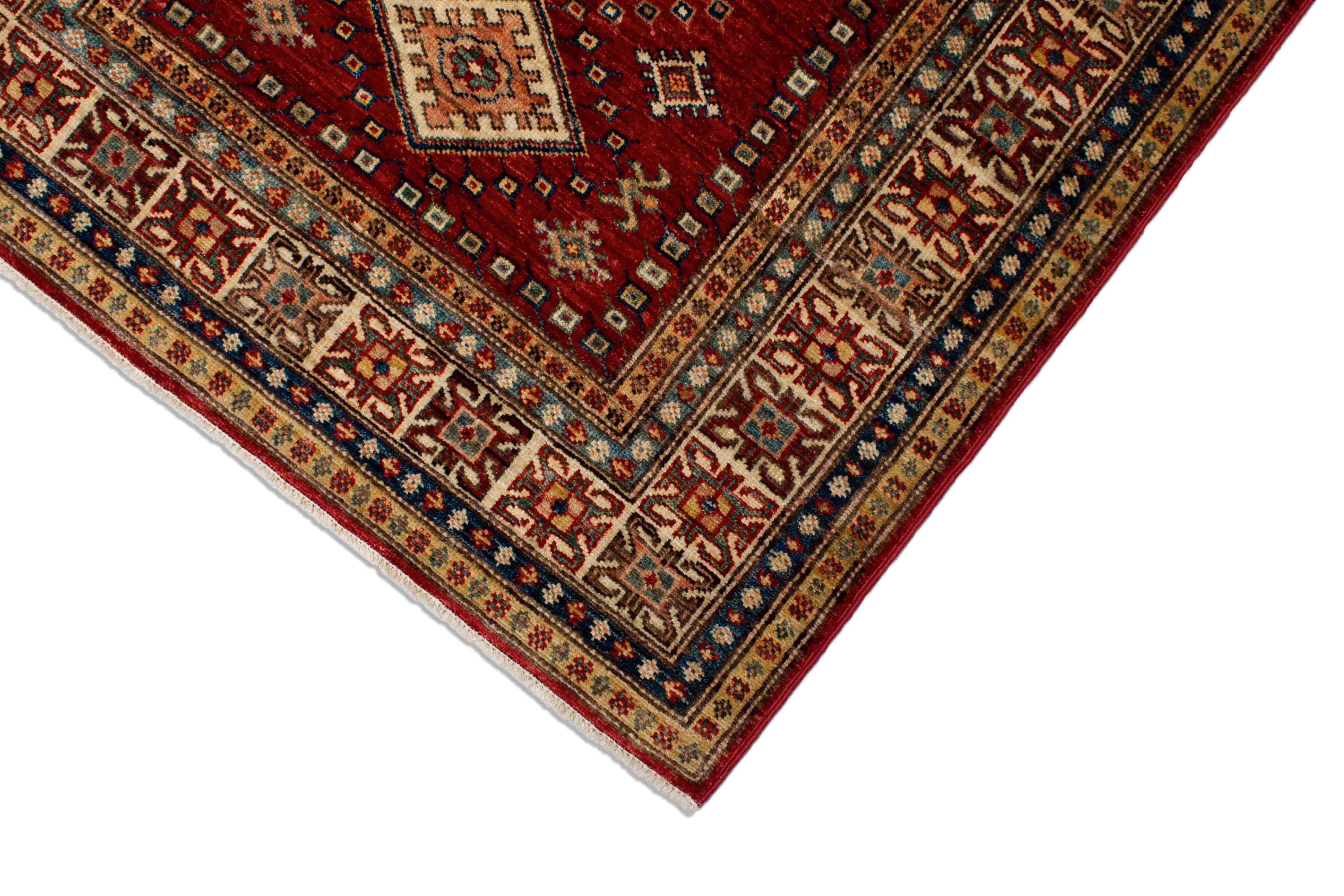 Dieser Kazak Teppich wurde nach einem traditionellen Verfahren aus handgesponnener Wolle und Naturfarben in Pakistan handgeknüpft.