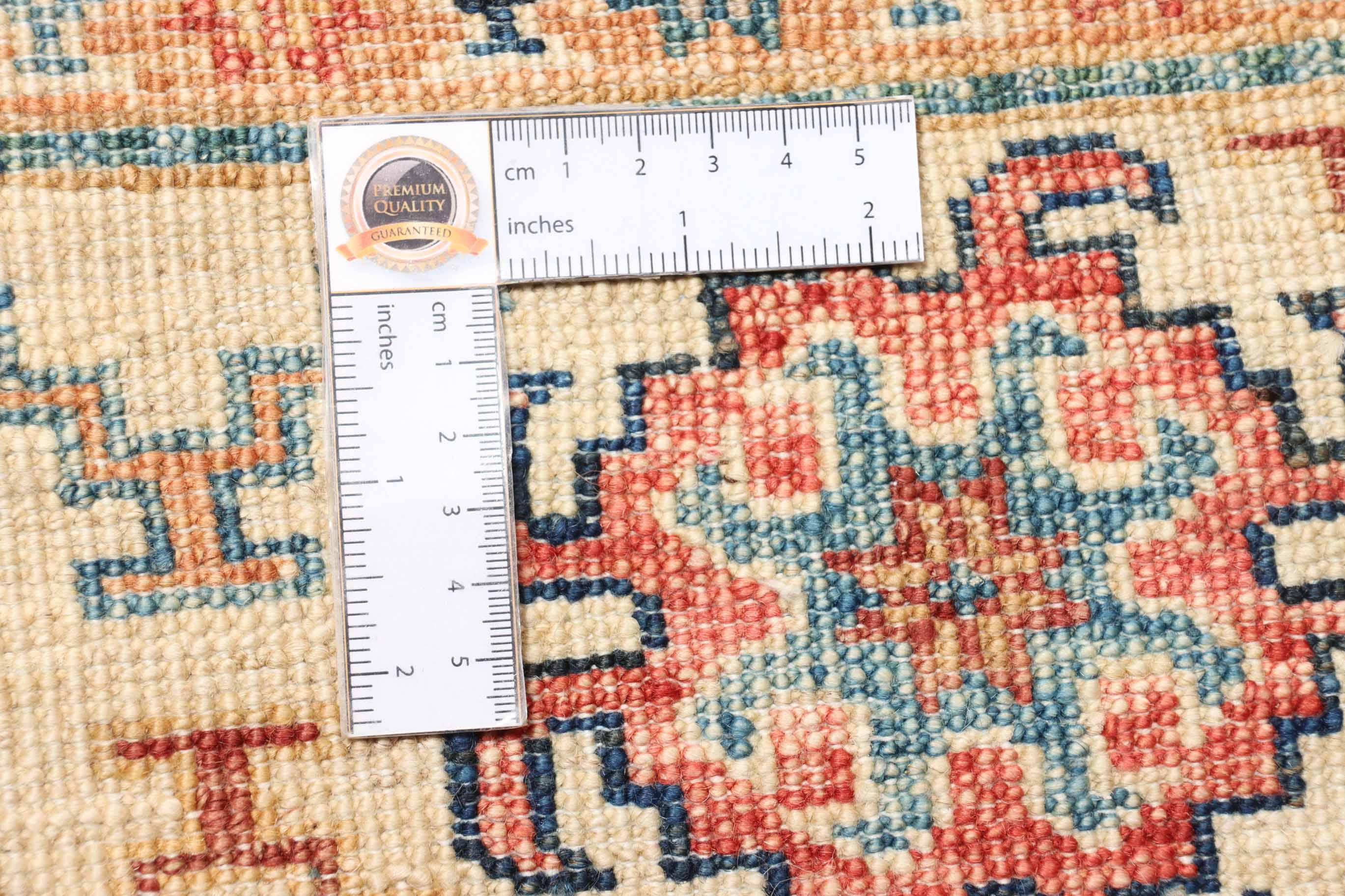 Dieser Kazak Teppich wurde nach einem traditionellen Verfahren aus handgesponnener Wolle und Naturfarben in Pakistan handgeknüpft.