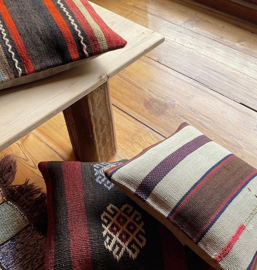 Die Kelims werden von uns sorgfältig ausgewählt und vor der Weiterverarbeitung zu Kissen gereinigt und – falls nötig – behutsam restauriert.