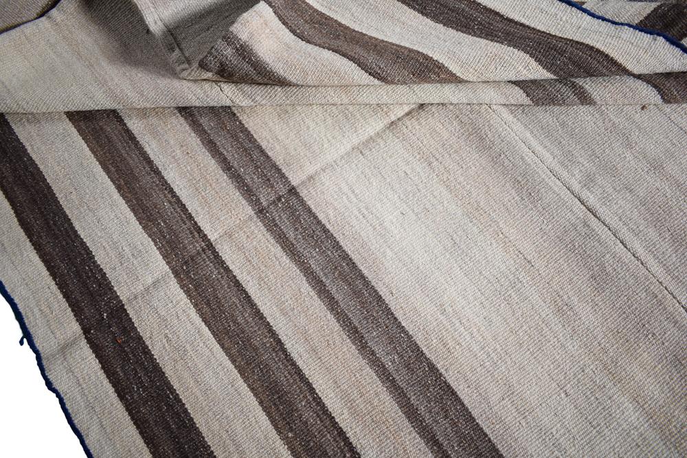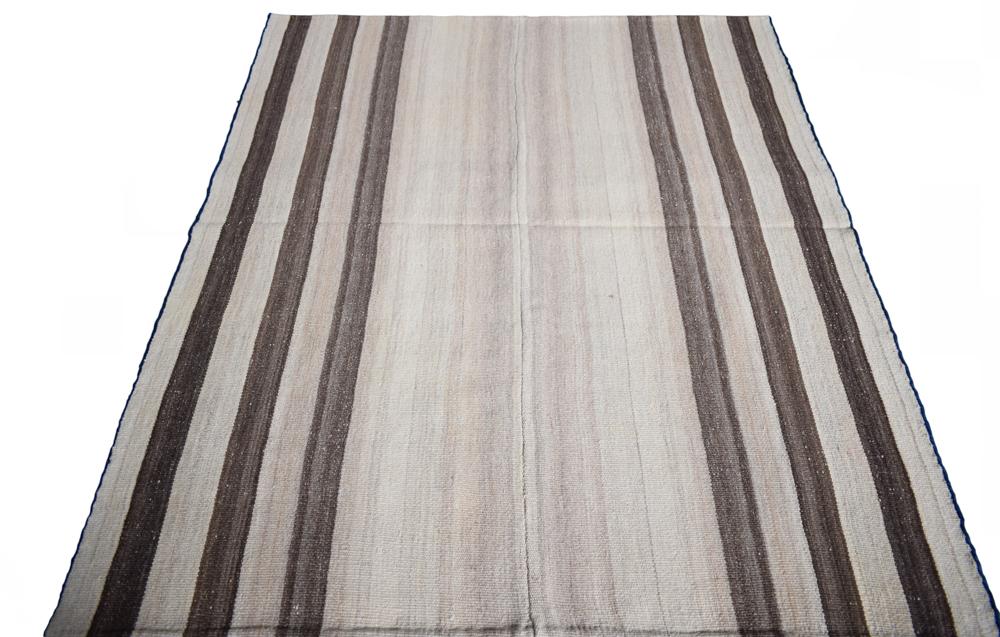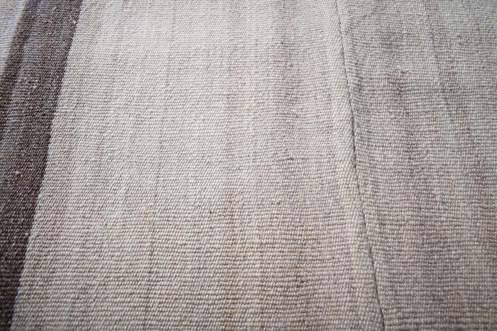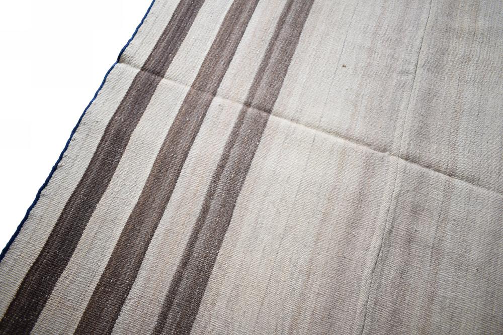 Die Schuss-Fäden dieses Kelim Teppichs bestehen aus handgesponnener, mit Pflanzenfarben gefärbter Schafwolle. Vor dem Weben des Teppichs wurden dafür zunächst Schafe geschoren und die Wolle anschließend gereinigt, gekämmt und schließlich gesponnen. Nach dem Spinnen wird die Wolle der Kelim Teppiche in einem aufwendigen Prozess mit Naturfarben gefärbt. Der Flor der Kelim Teppiche wirkt wegen dieses traditionellen Verfahrens trocken und leicht pelzig. Die Kett-Fäden dieses Kelims bestehen aus Wolle.