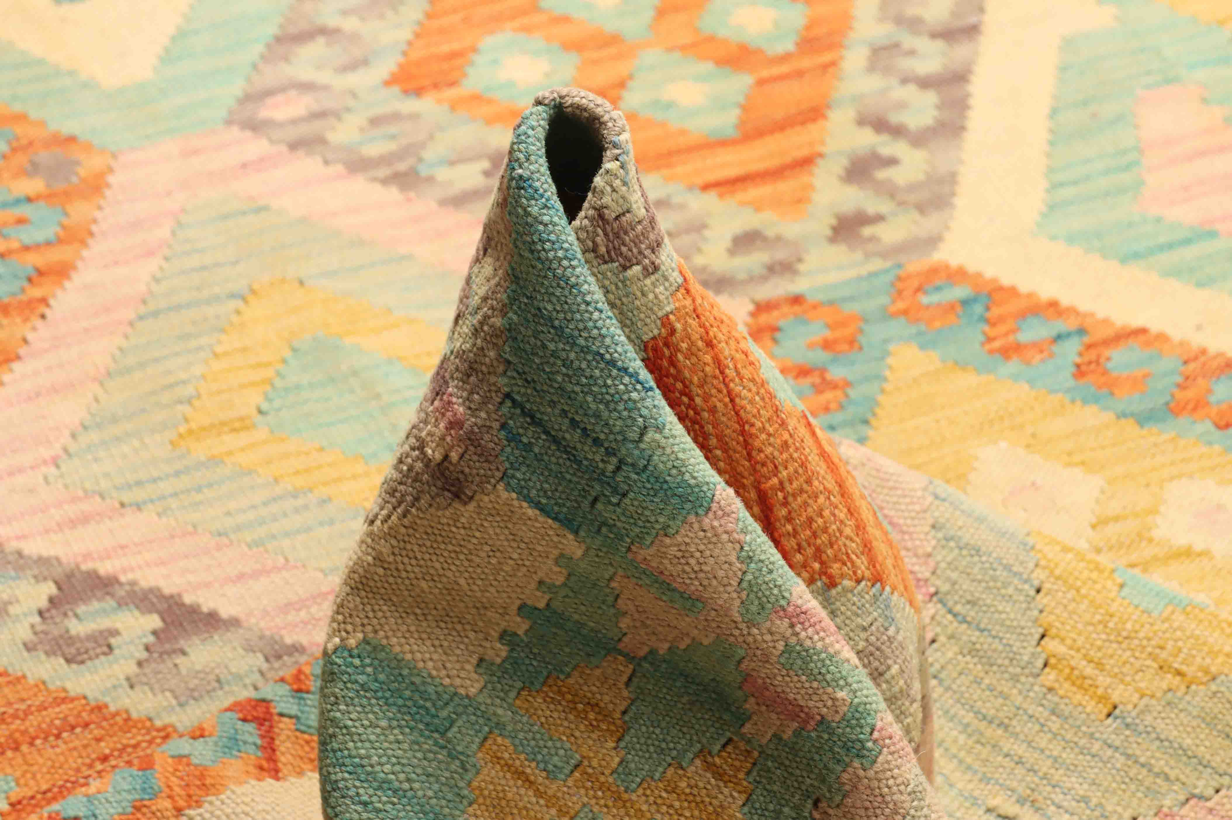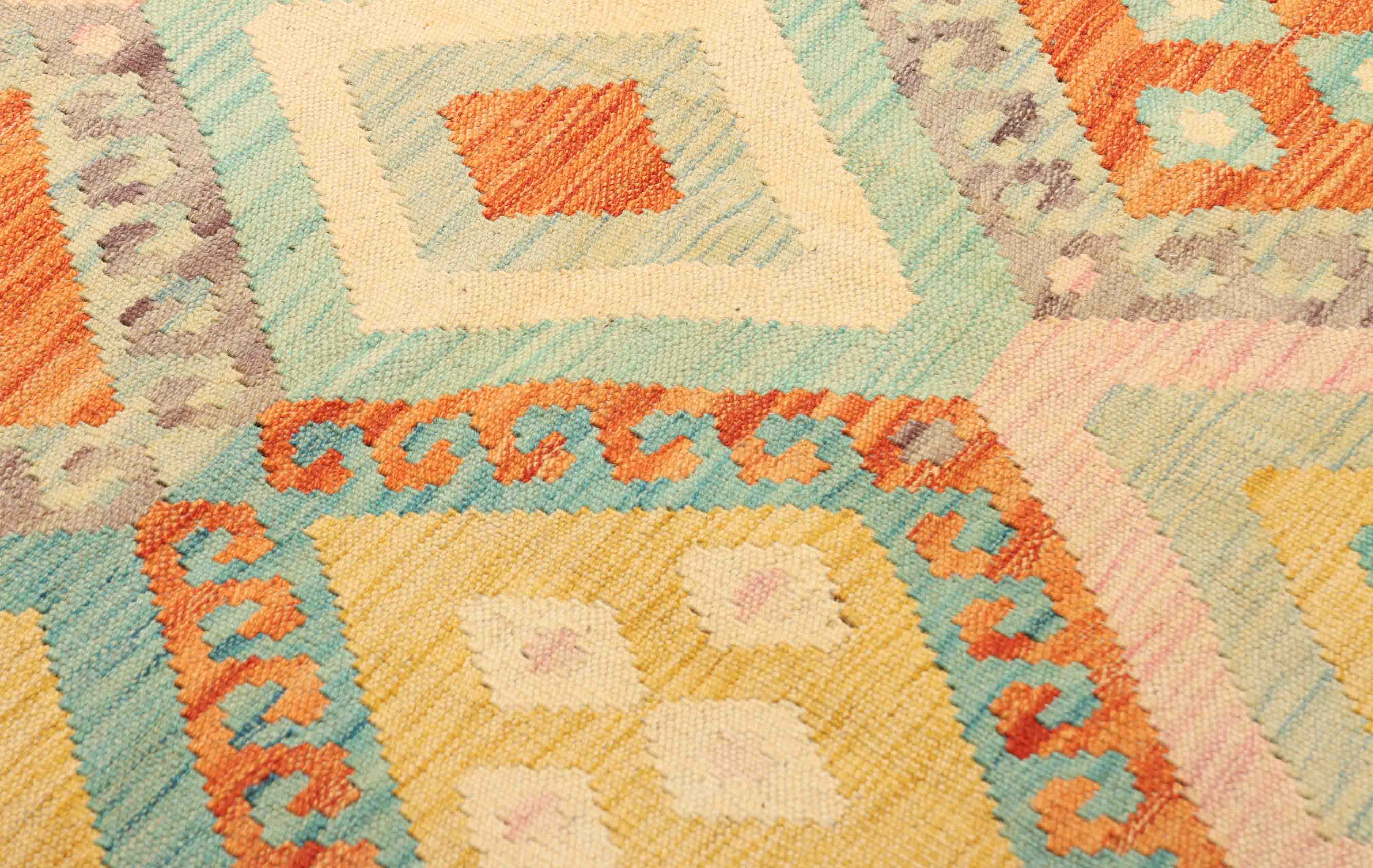 Die Schuss-Fäden dieses Kelim Teppichs bestehen aus handgesponnener, mit Pflanzenfarben gefärbter Schafwolle. Vor dem Weben des Teppichs wurden dafür zunächst Schafe geschoren und die Wolle anschließend gereinigt, gekämmt und schließlich gesponnen. Nach dem Spinnen wird die Wolle der Kelim Teppiche in einem aufwendigen Prozess mit Naturfarben gefärbt. Der Flor der Kelim Teppiche wirkt wegen dieses traditionellen Verfahrens trocken und leicht pelzig. Die Kett-Fäden dieses Kelims bestehen aus Wolle.