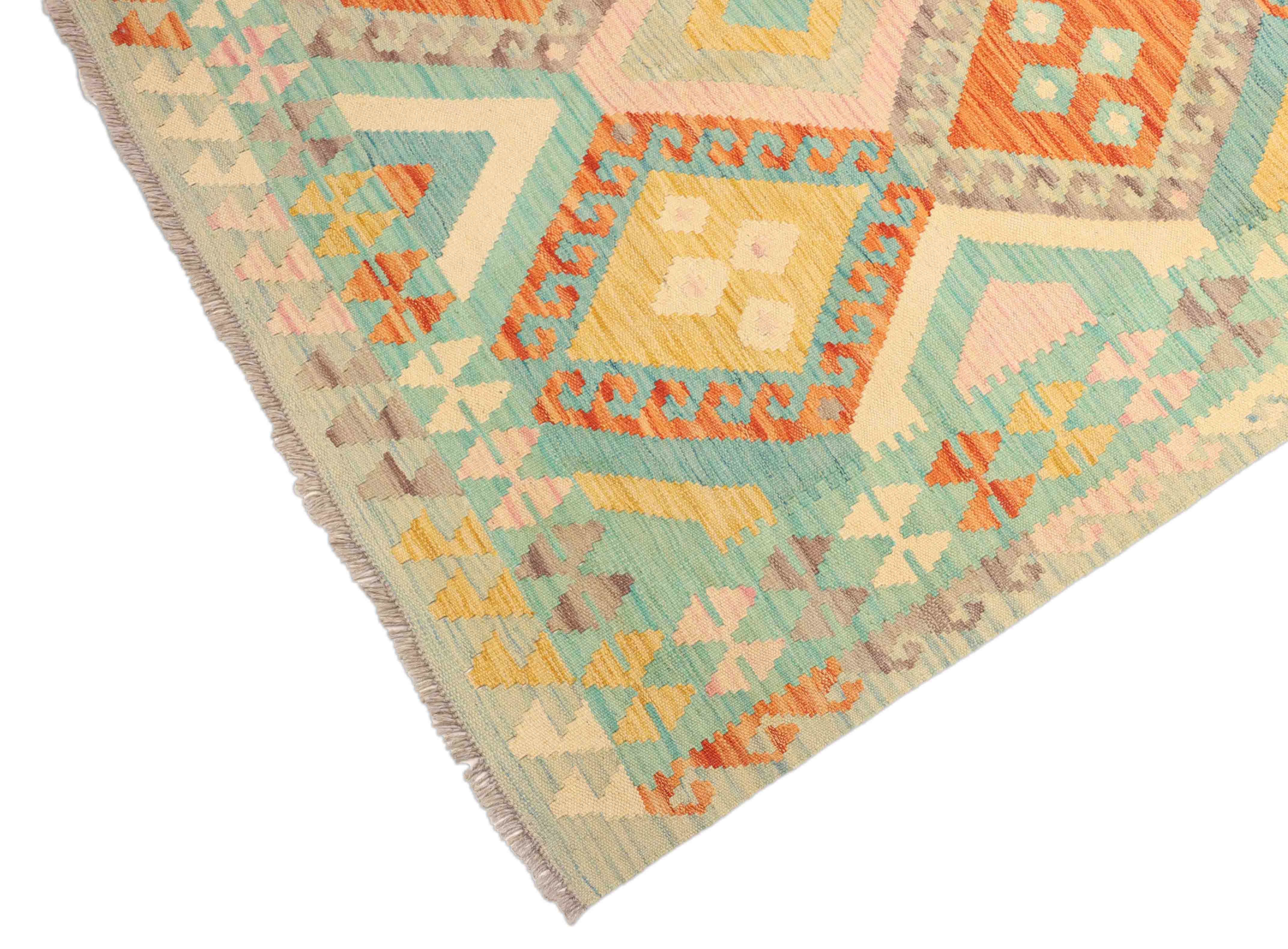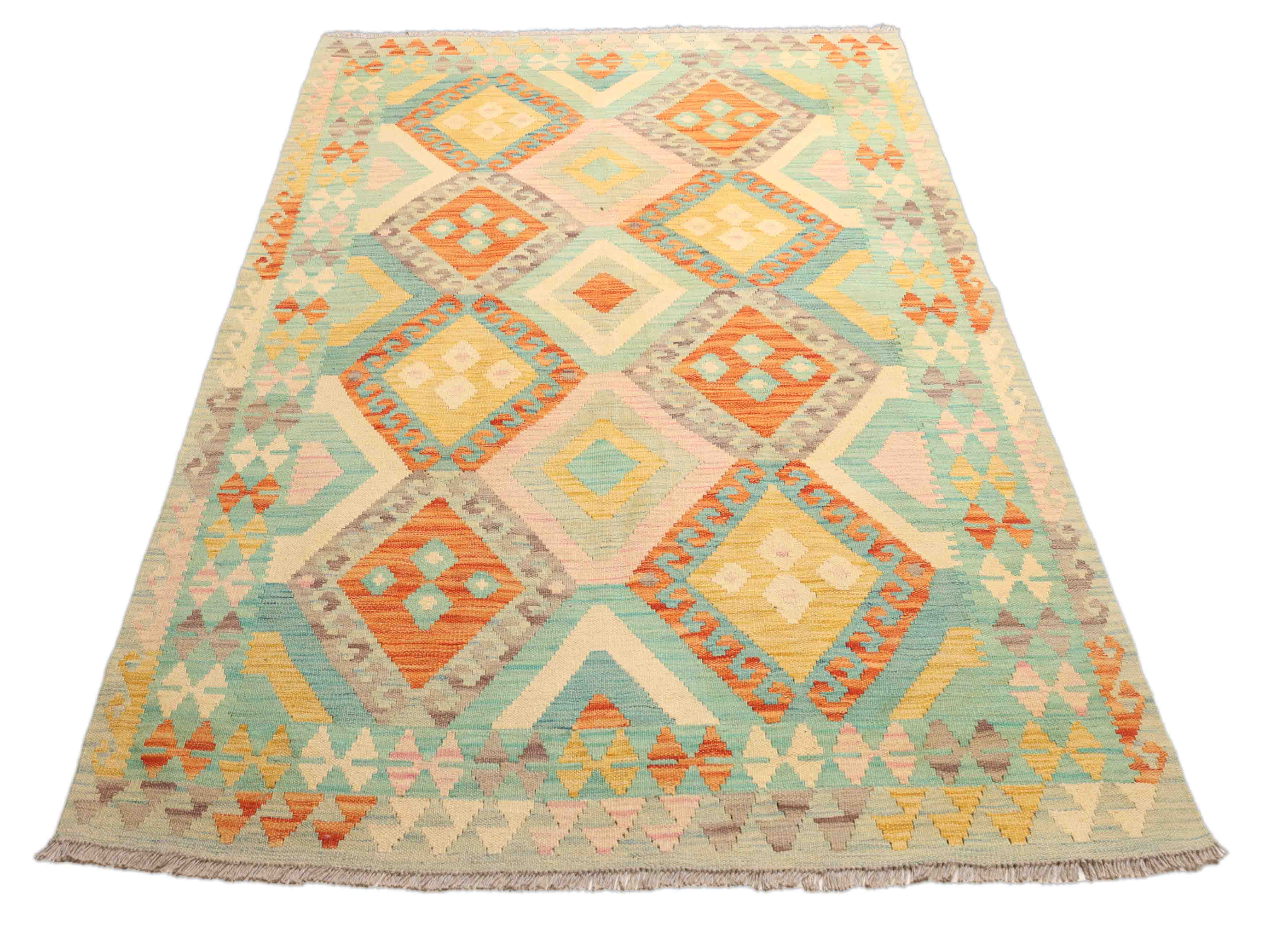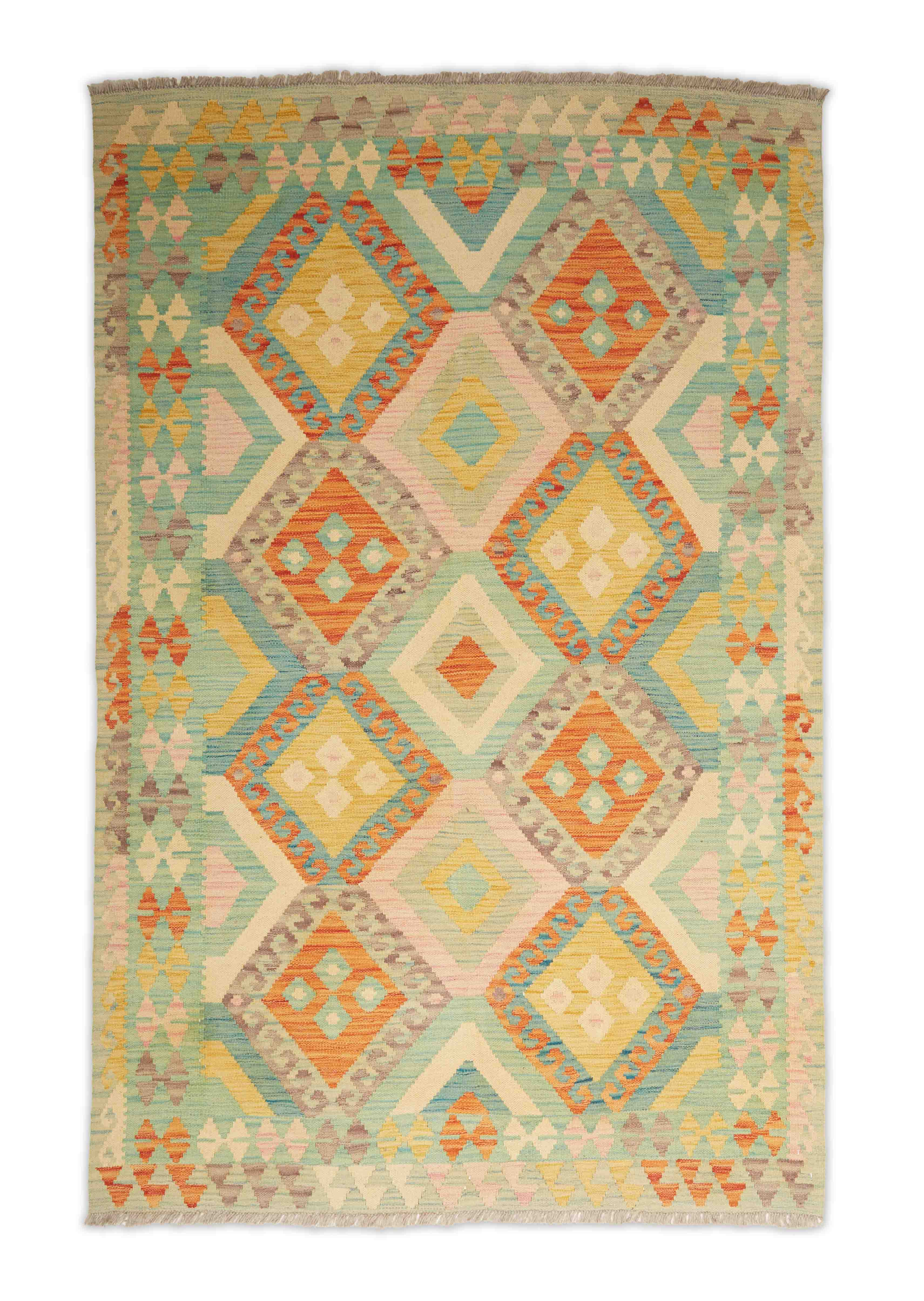 Der Hintergrund dieses Kelims ist Beige. Im Gesamteindruck dominieren außerdem die Farben Hellgrün und Curry.