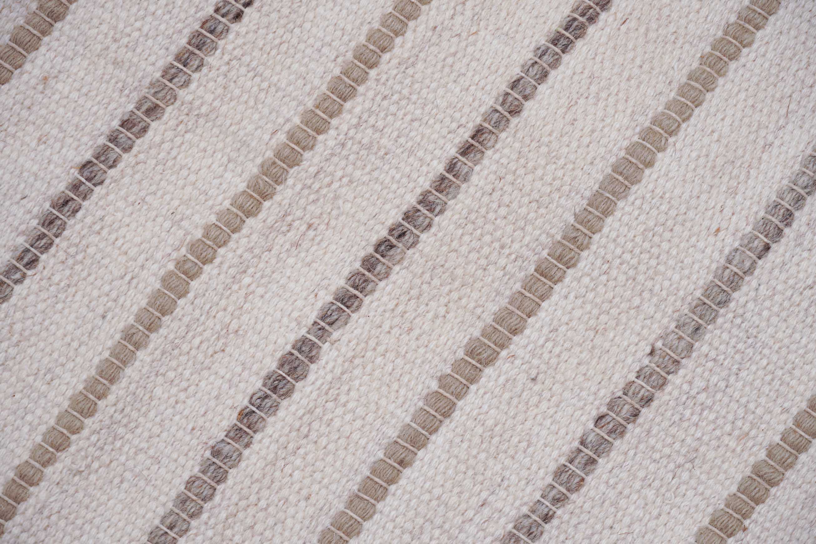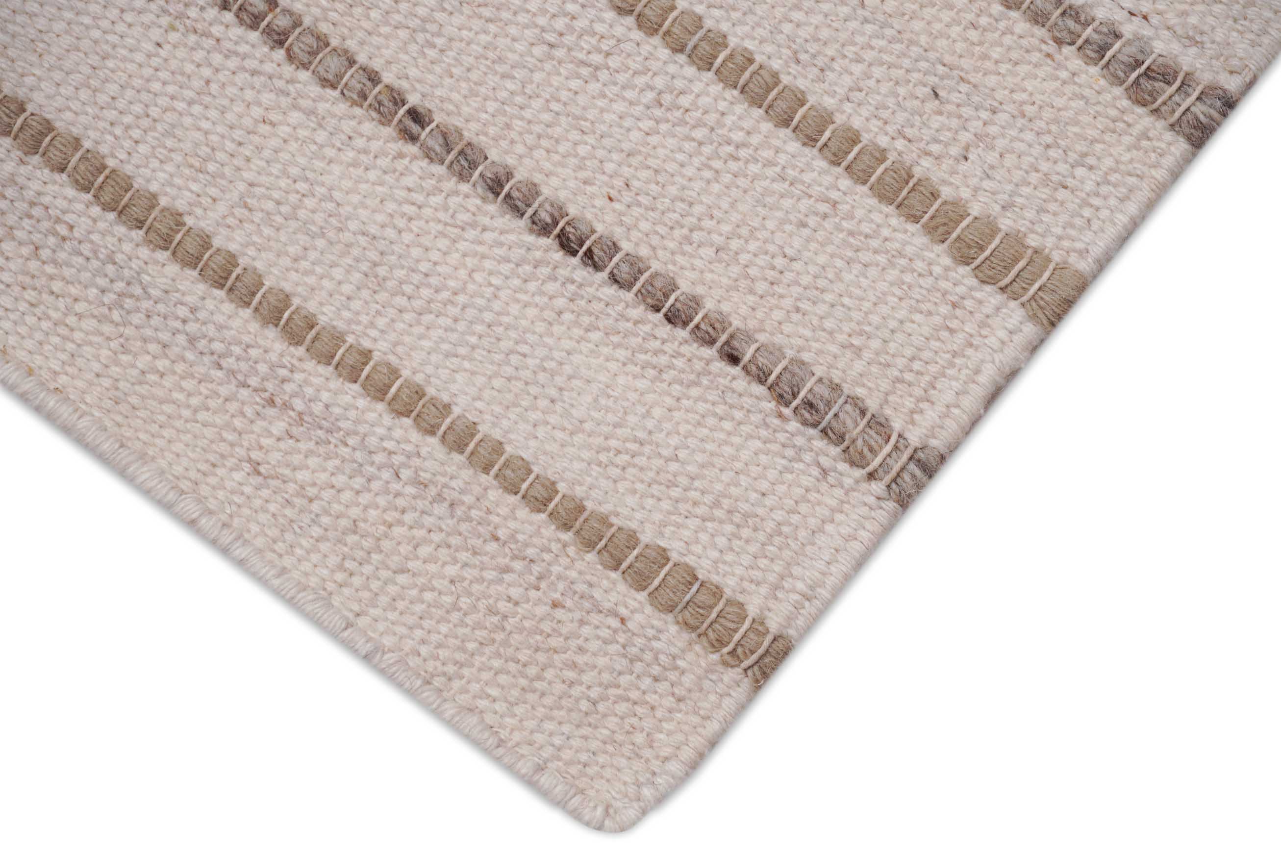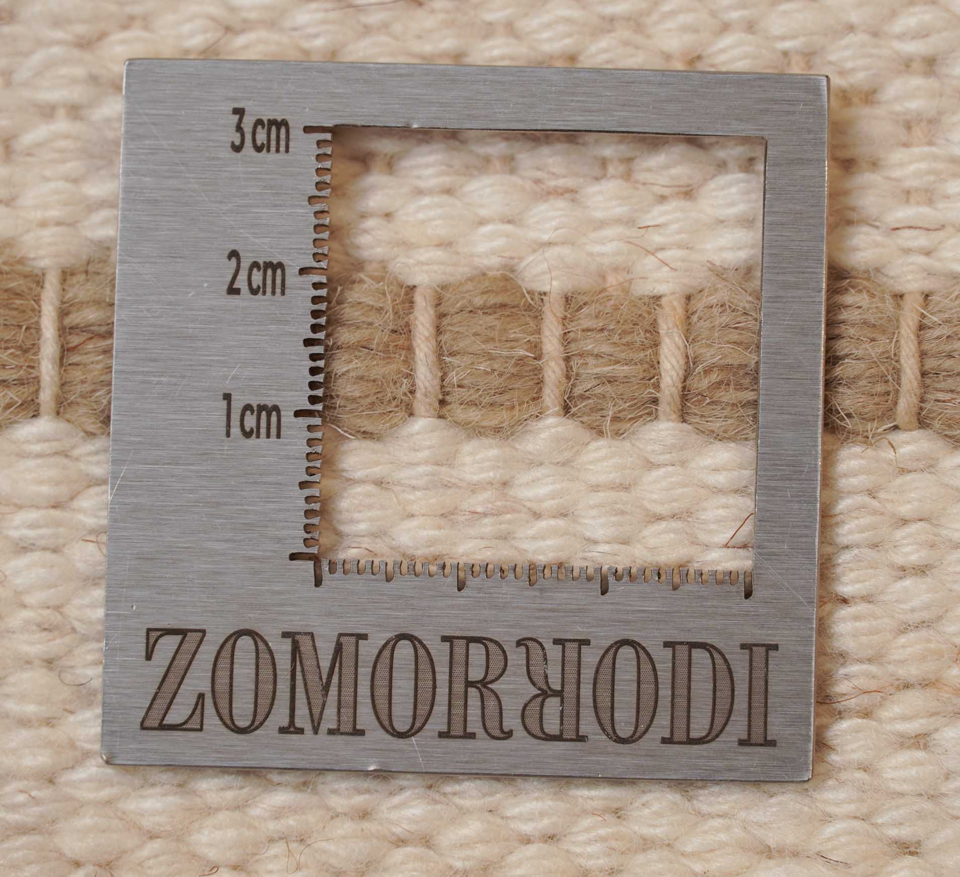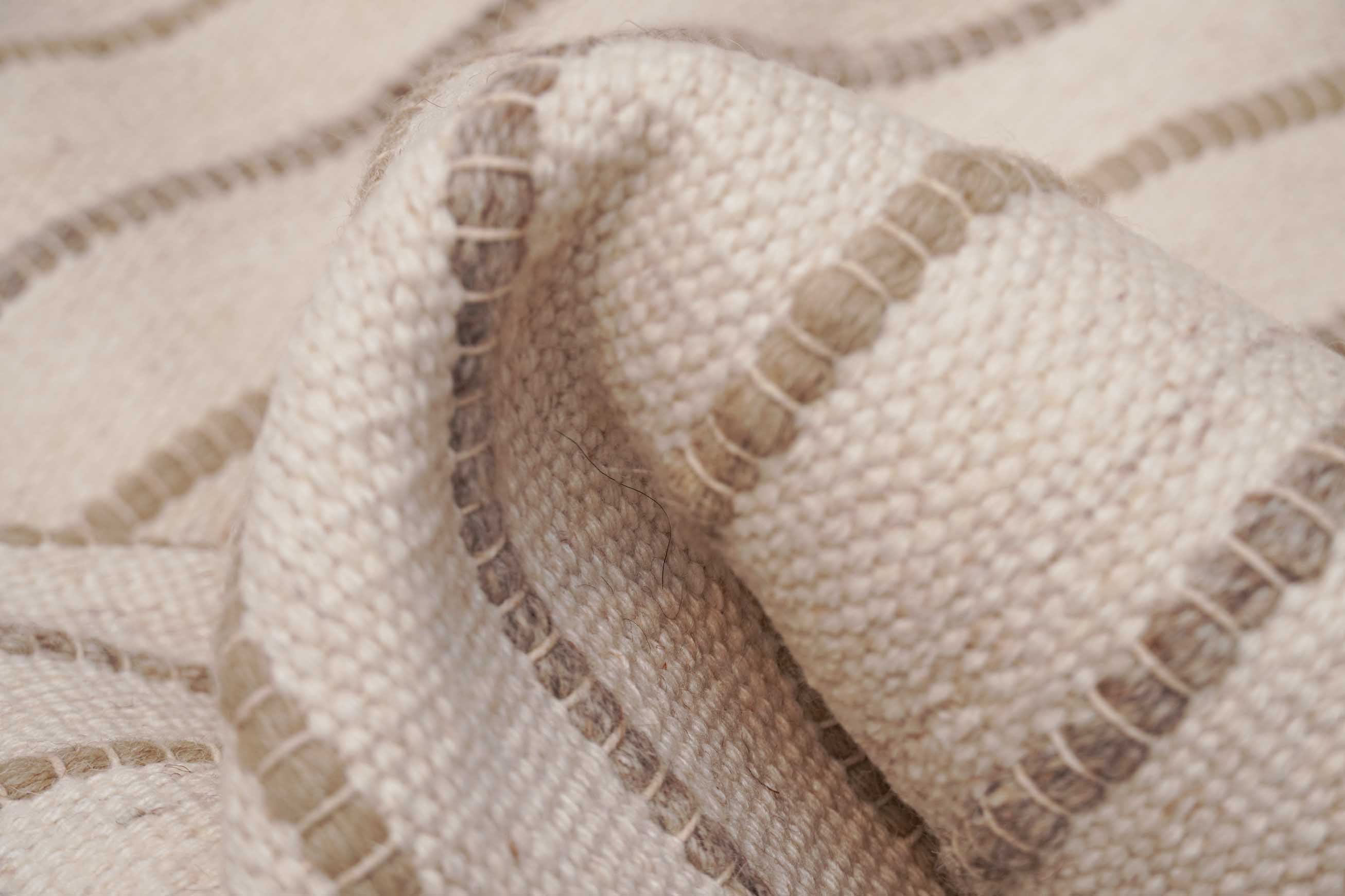 Die Schuss-Fäden dieses Kelim Teppichs bestehen aus handgesponnener, mit Pflanzenfarben gefärbter Schafwolle. Vor dem Weben des Teppichs wurden dafür zunächst Schafe geschoren und die Wolle anschließend gereinigt, gekämmt und schließlich gesponnen. Nach dem Spinnen wird die Wolle der Kelim Teppiche in einem aufwendigen Prozess mit Naturfarben gefärbt. Der Flor der Kelim Teppiche wirkt wegen dieses traditionellen Verfahrens trocken und leicht pelzig. Die Kett-Fäden dieses Kelims bestehen aus Baumwolle.