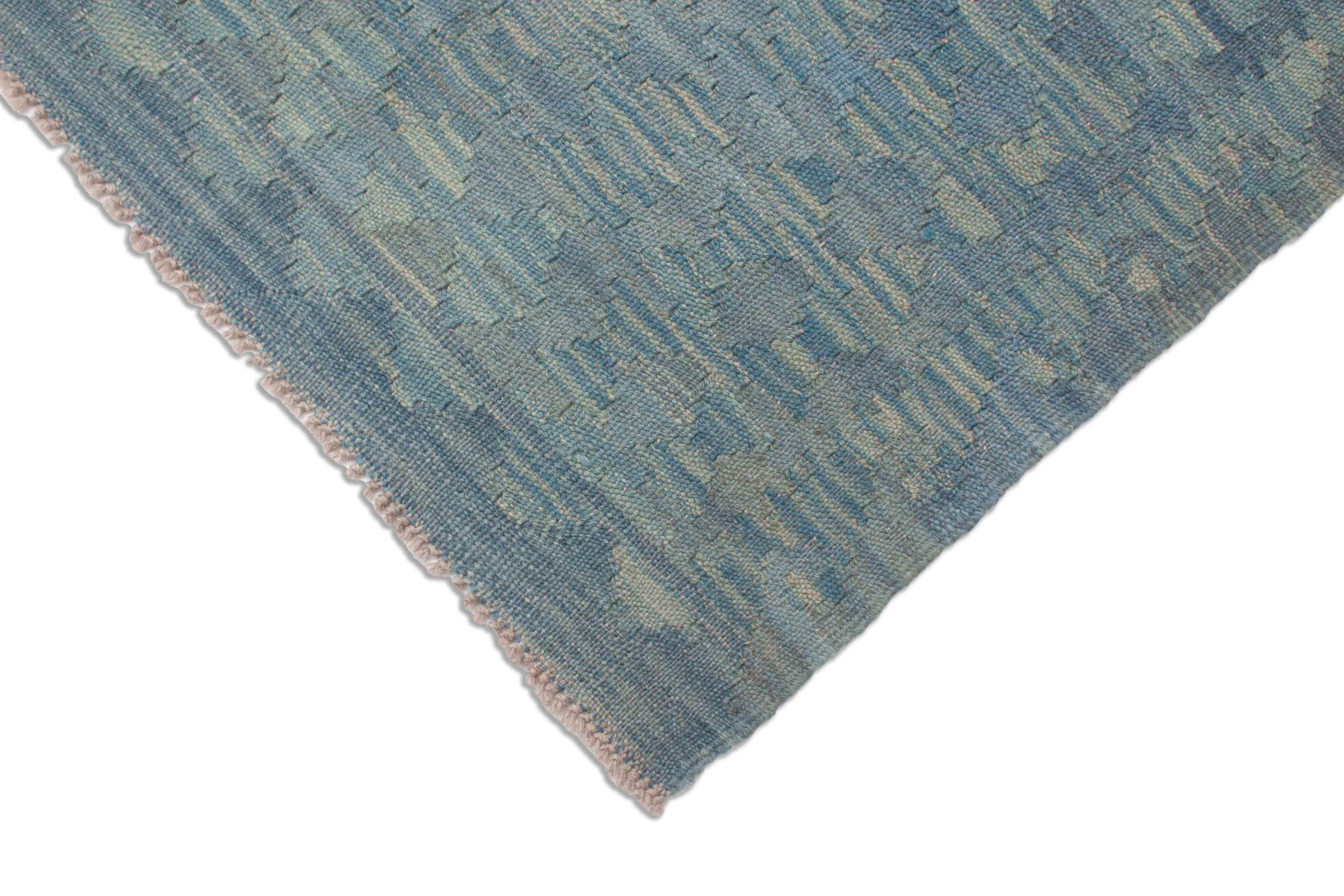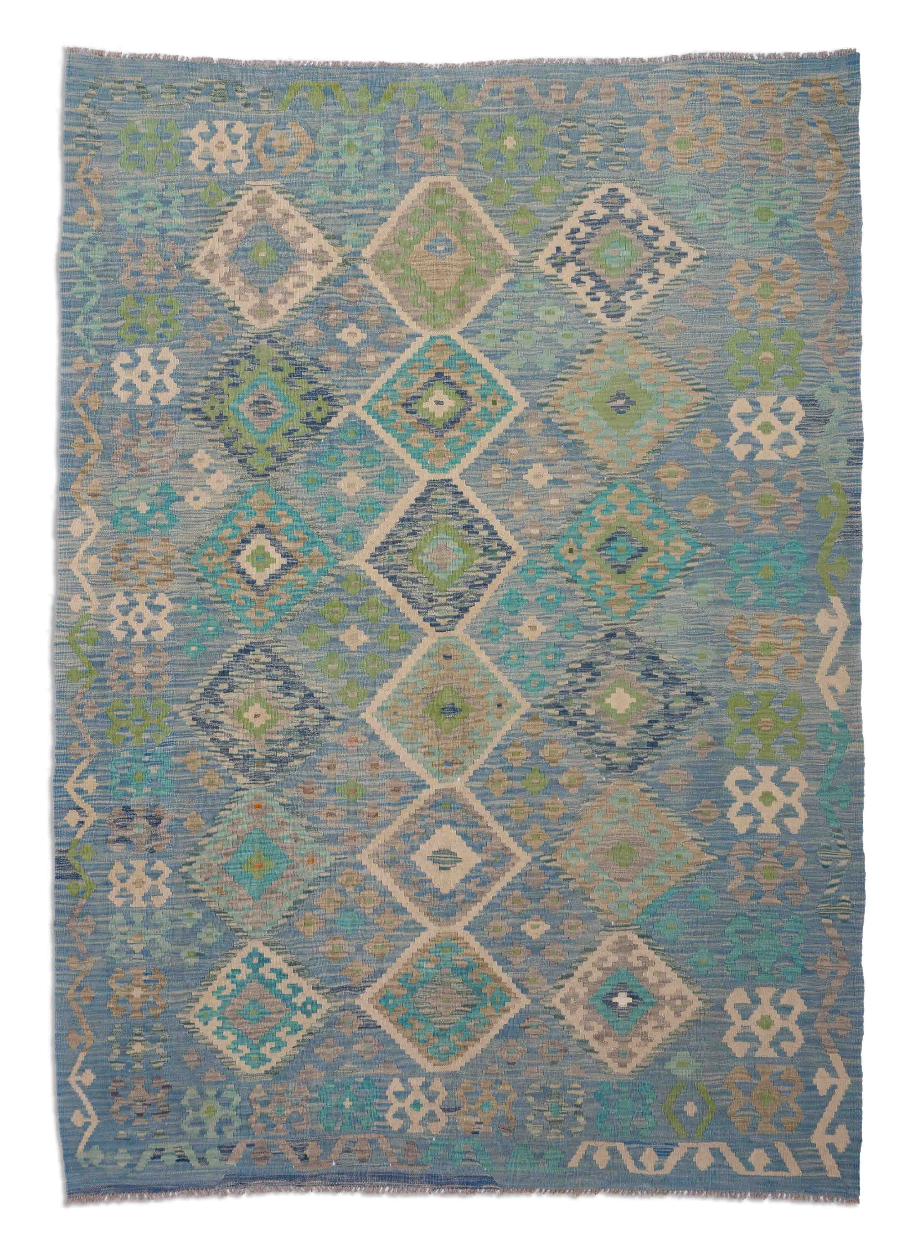 Geometrischer Kelim, blaugrau mit Bordüre und Rauten