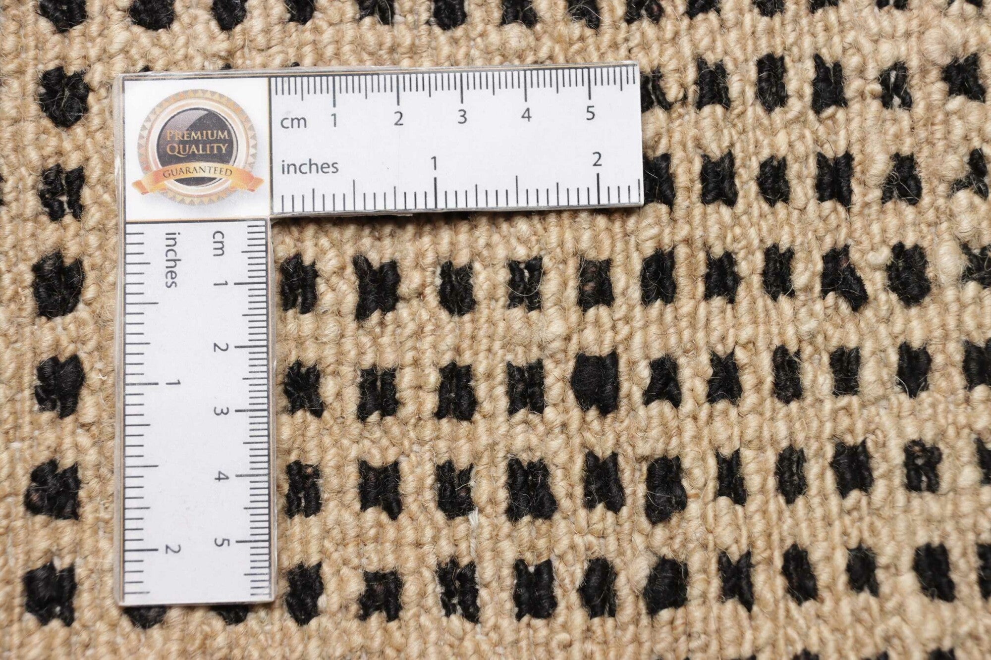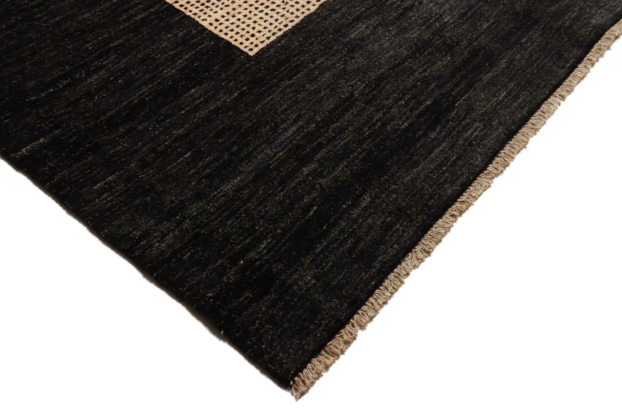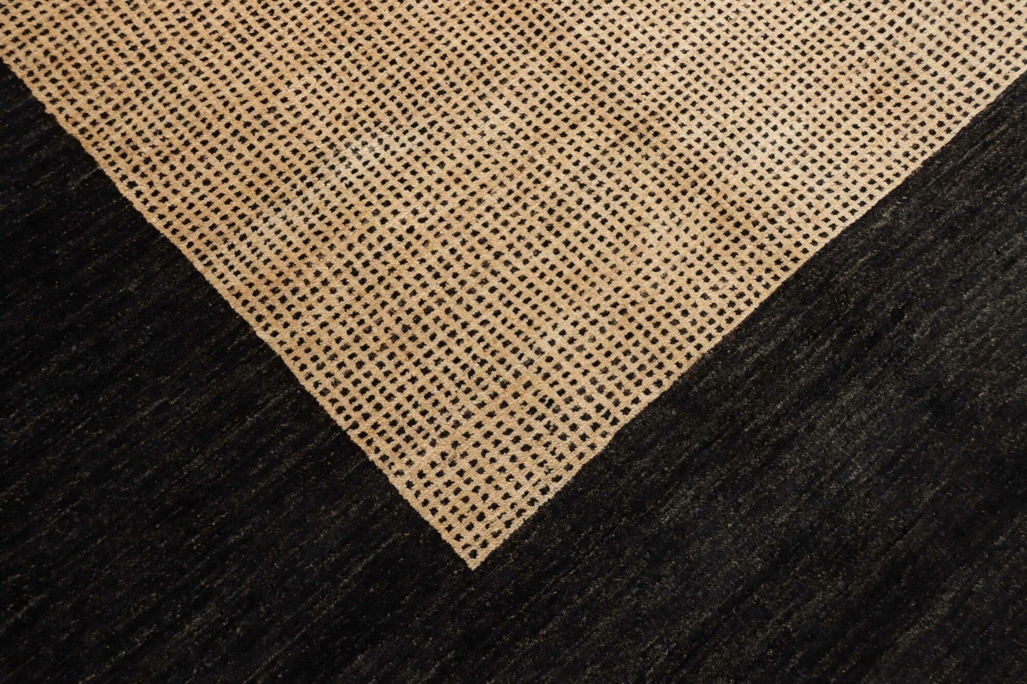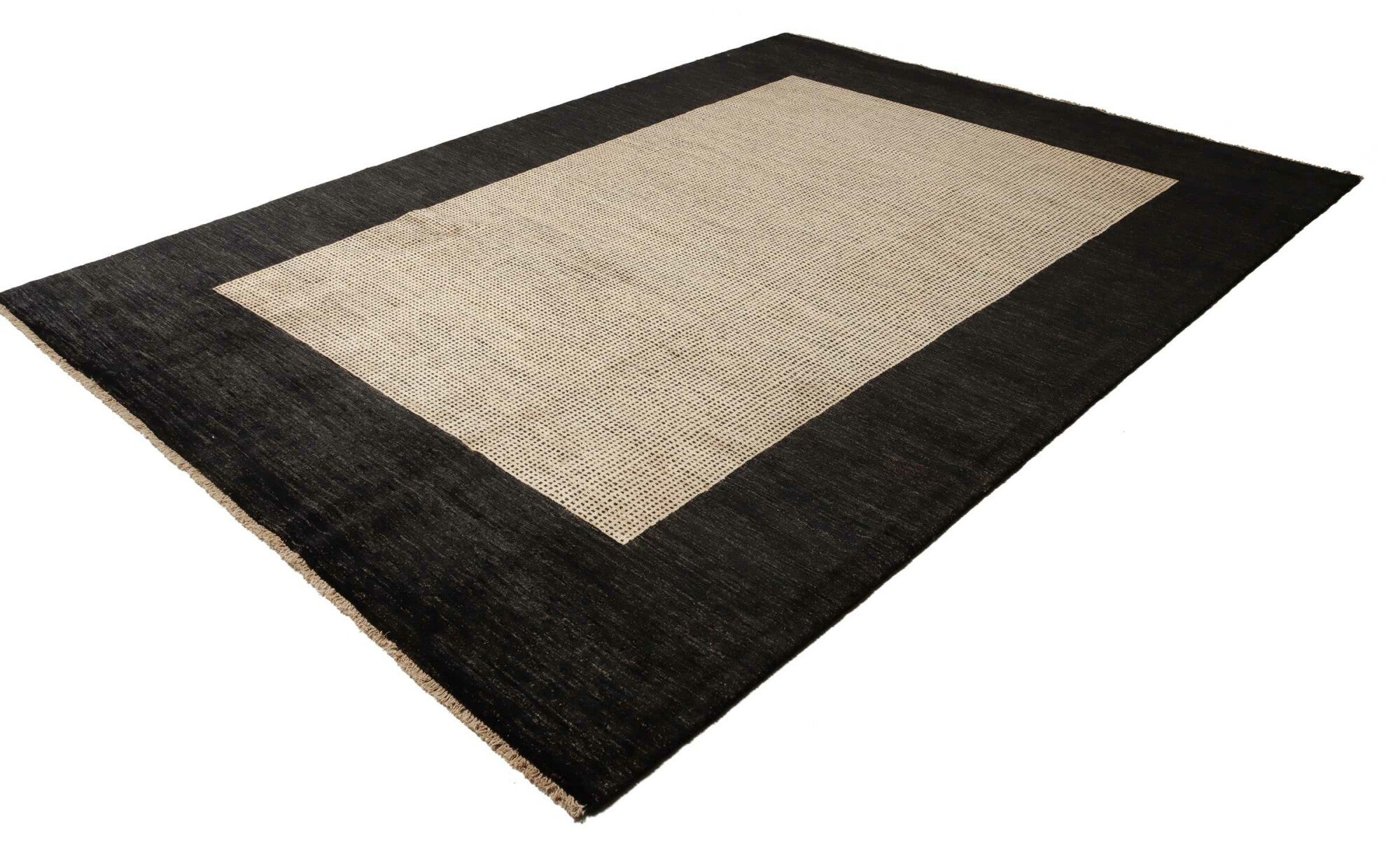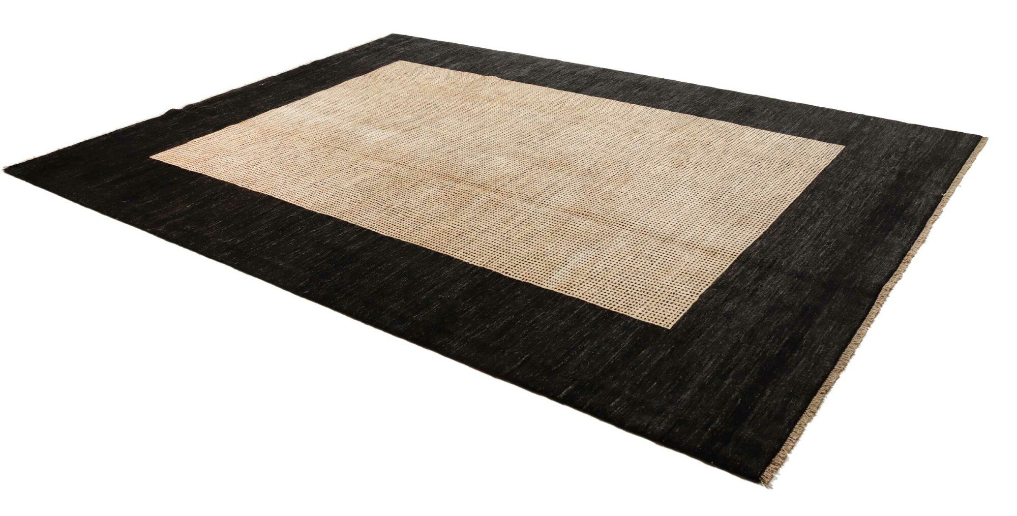 Das einfarbige goldbeige Feld ist von einer Bordüre in Schwarz umrahmt. Das verleiht dem Teppich trotz seiner relativ schlichten Gestaltung Tiefe.