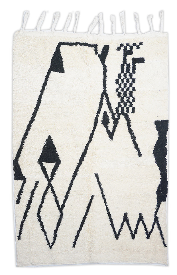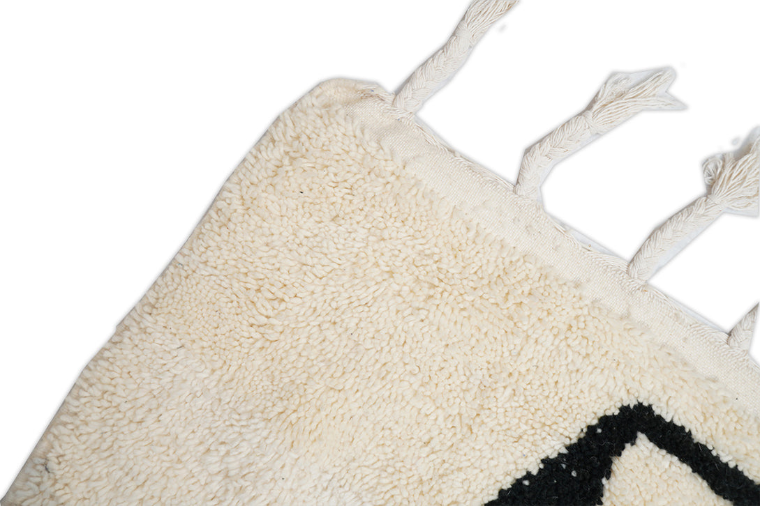 Der Hintergrund dieses Marokkanischer Berberteppichs ist Creméweiß. Im Gesamteindruck dominiert außerdem die Farbe Schwarz-Weiß.