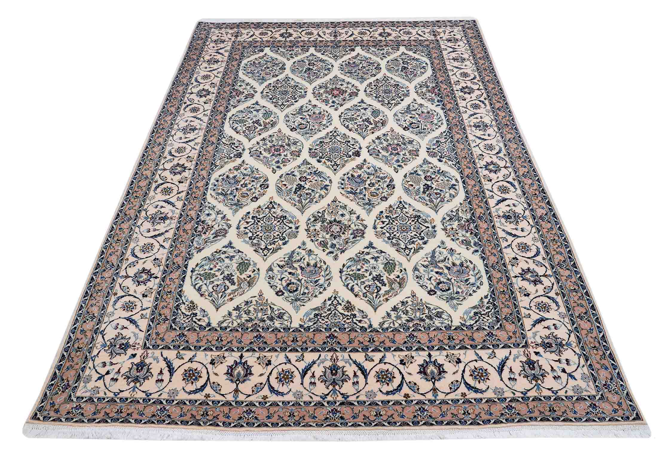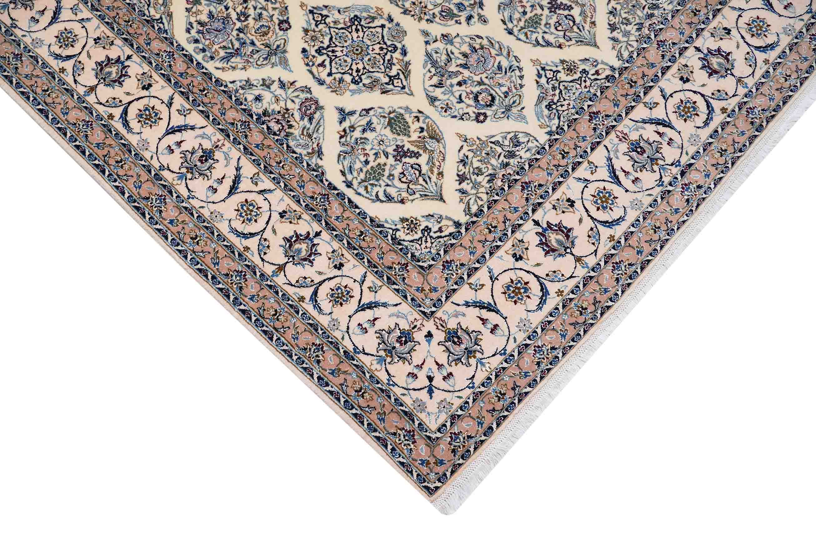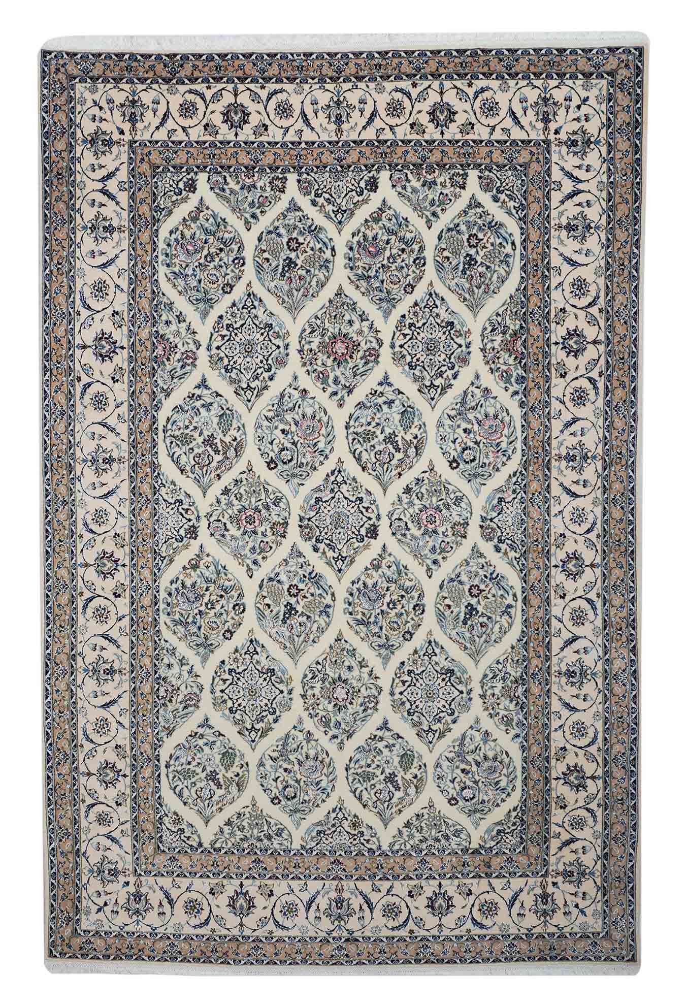 Die wiederholenden Elemente dieses Nain Tepppichs haben kein spezifisches Zentrum. Das wiederkehrende Rapportmuster wirkt beruhigend aber nicht langweilig. Teppiche mit Rapportmuster werden auch als durchgemustert bezeichnet.