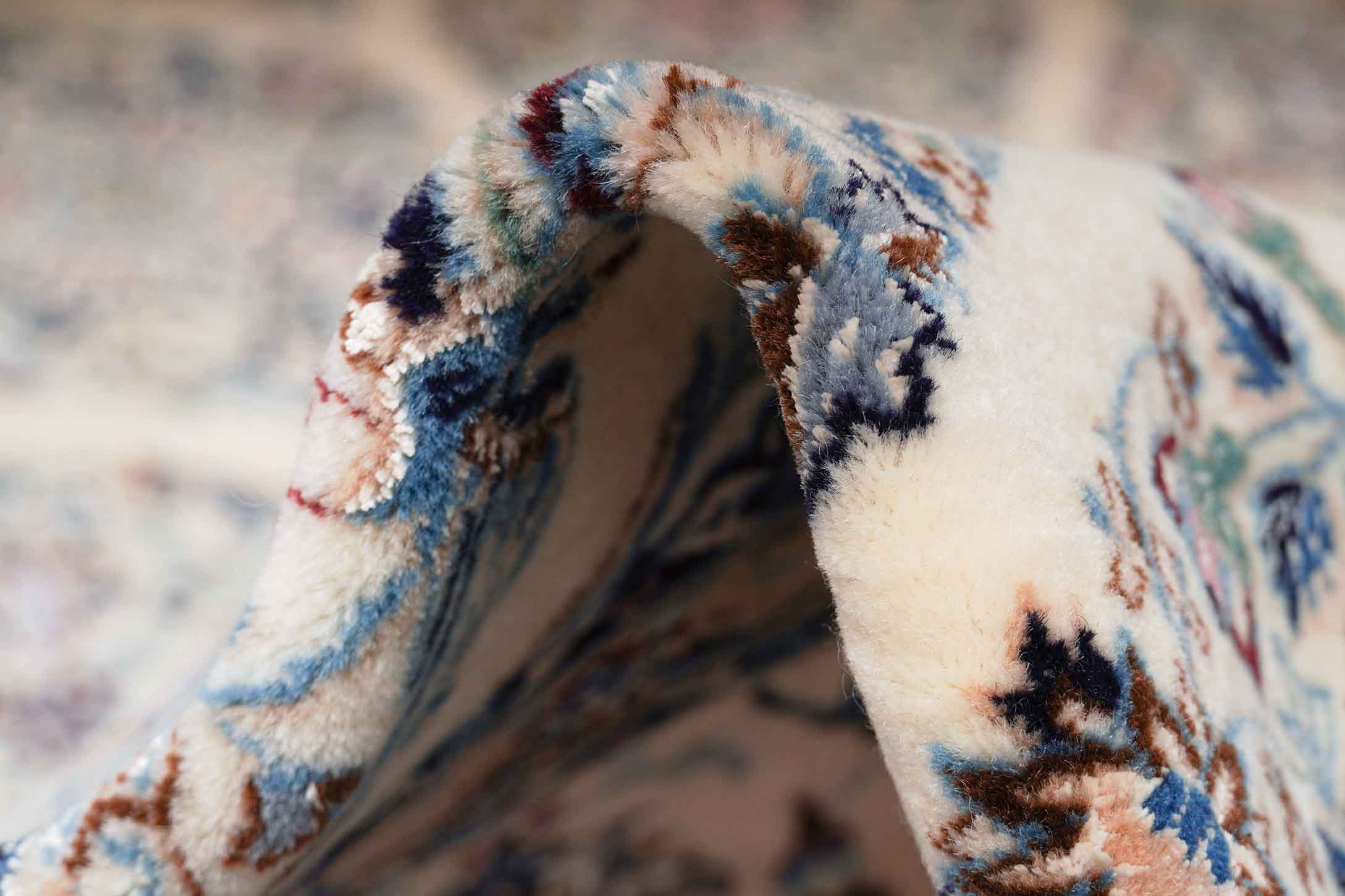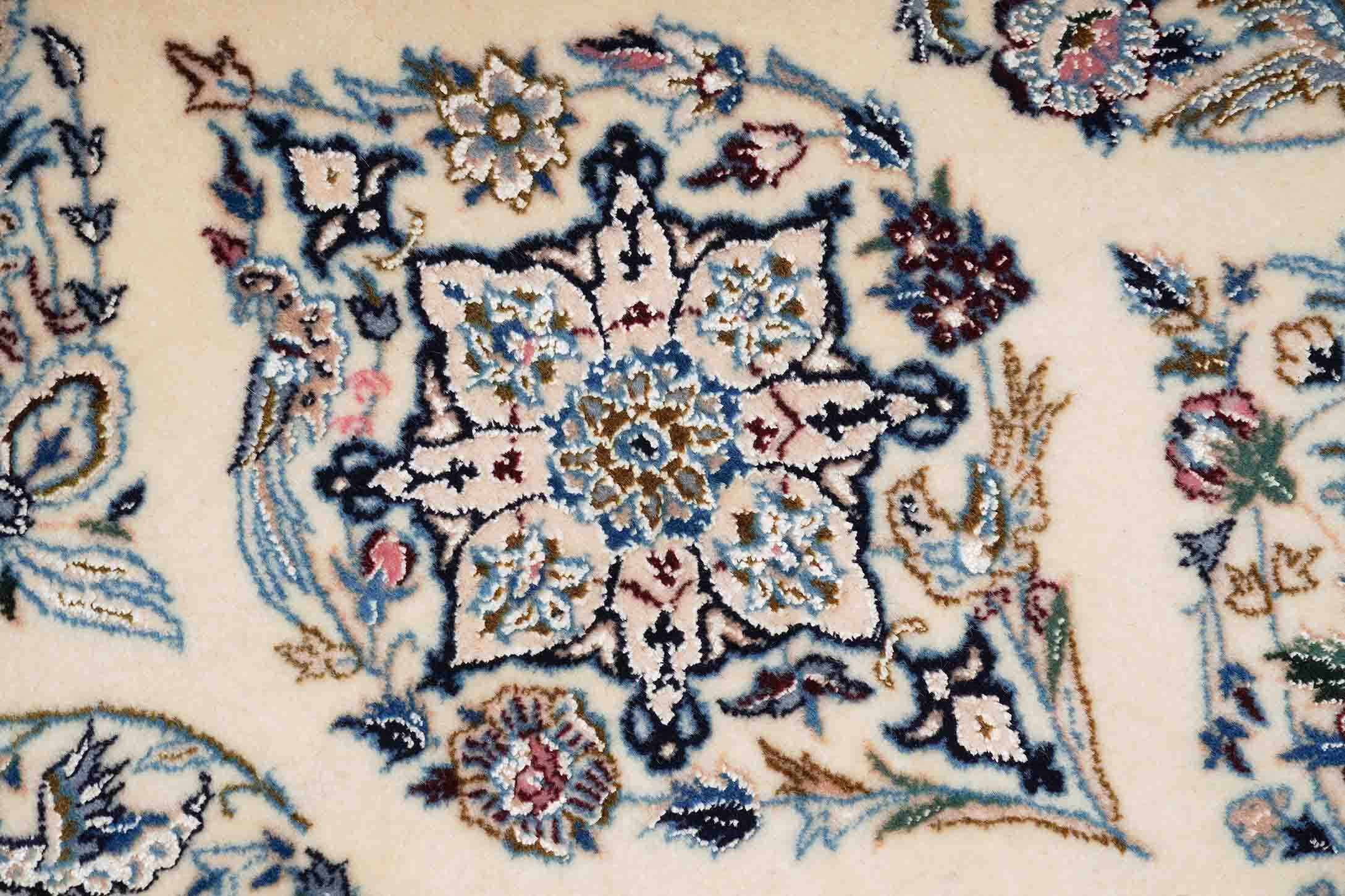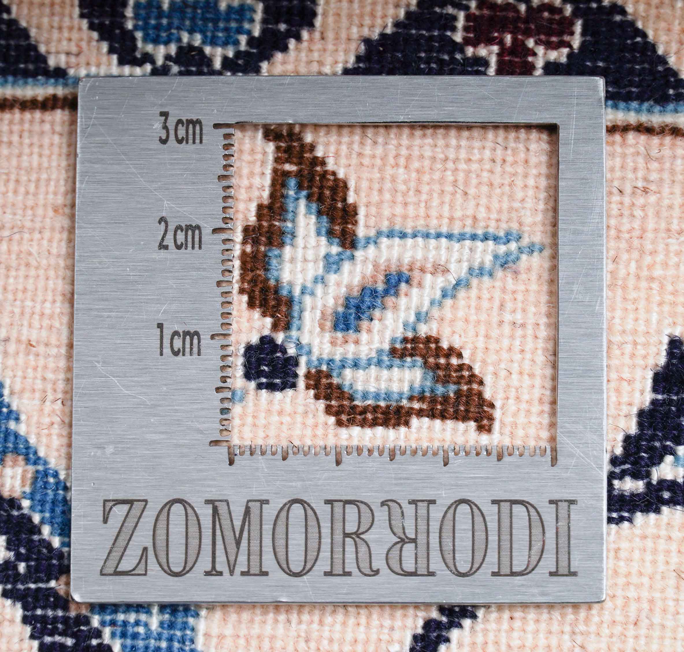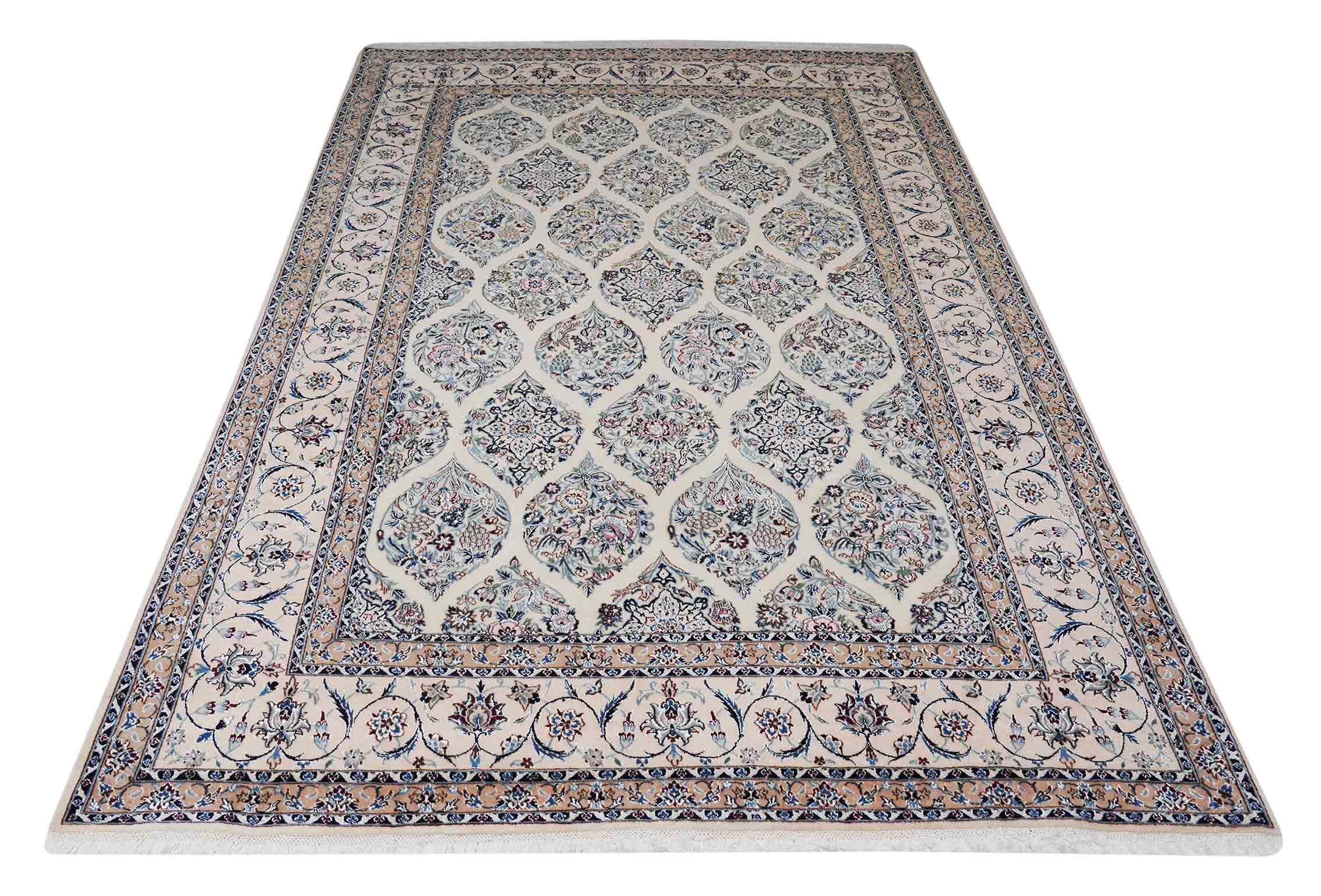 Die wiederholenden Elemente dieses Nain Tepppichs haben kein spezifisches Zentrum. Das wiederkehrende Rapportmuster wirkt beruhigend aber nicht langweilig. Teppiche mit Rapportmuster werden auch als durchgemustert bezeichnet.