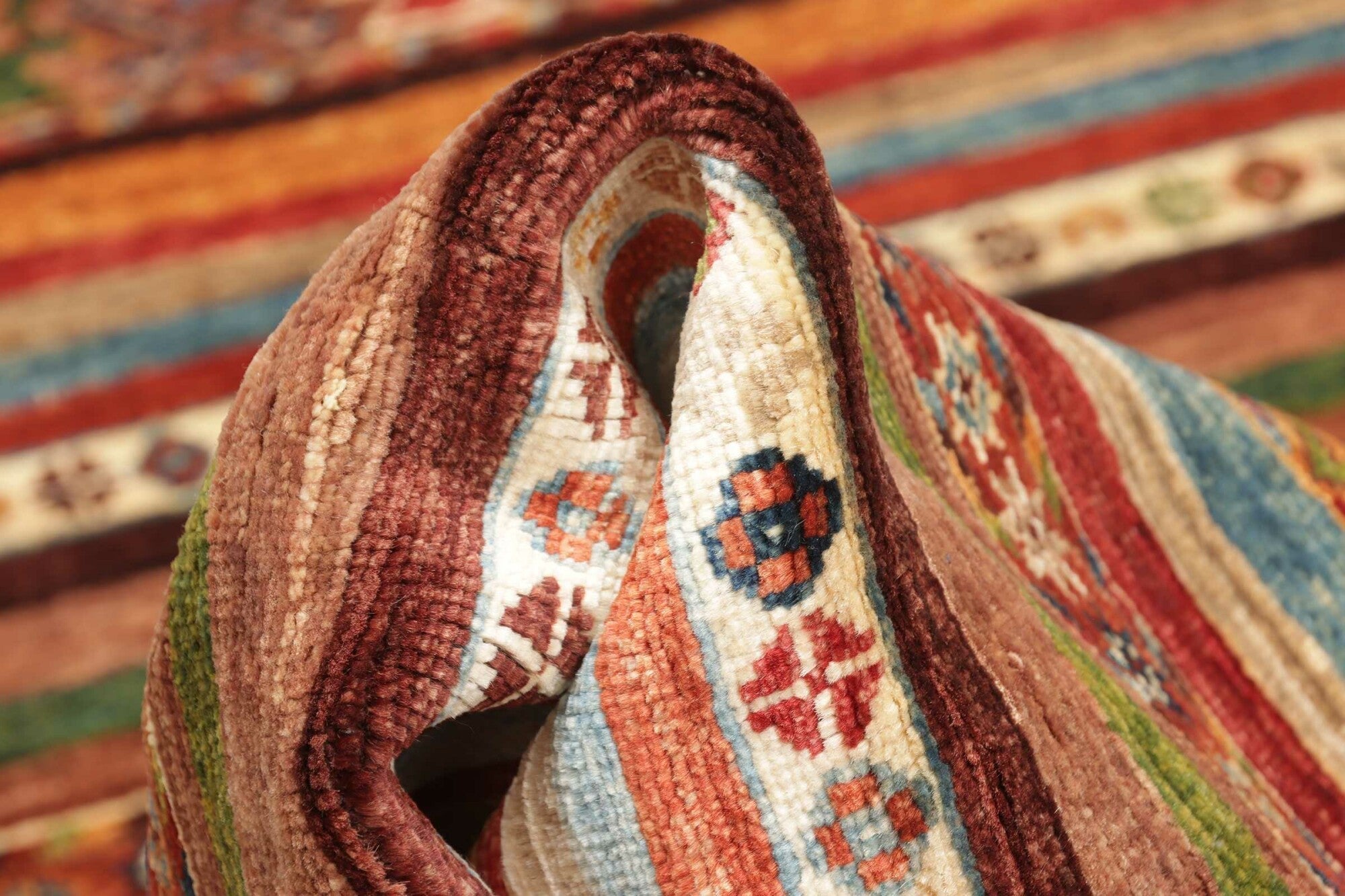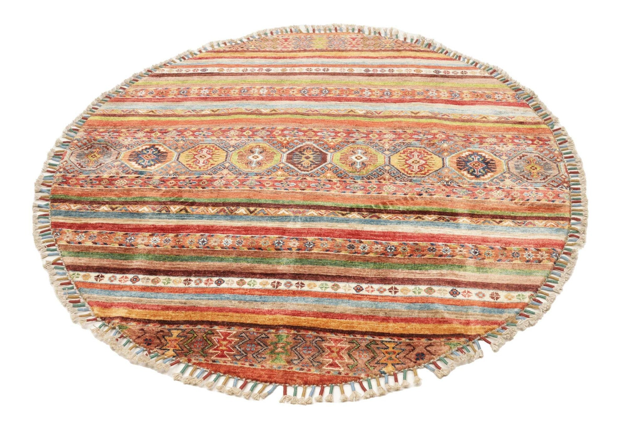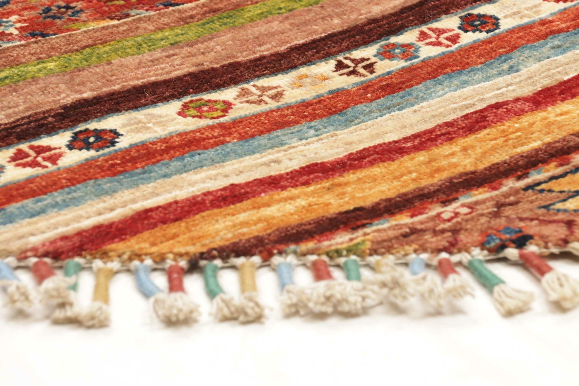 Das Muster dieses handgeknüpften Oxiana Teppichs ist angelehnt an die traditionellen, usbekischen Muster. Ursprünglich wurde vor allem in der Region um Samarkand und Oxiana Teppiche mit einem ähnlichen Muster geknüpft. Unsere Oxiana Teppiche sind auf den zeitgenössischen Geschmack abgestimmt: Harmonische Farbkompositionen aus Naturfarben schmeicheln dem traditionellen Muster. Die Oxiana Teppiche zieren farbenfrohe Querstreifen, die sich mit phantasievoll gemusterten Bereichen abwechseln. Die gemusterten Teile zeigen geometrische Kompositionen, die an ein Kazak Muster erinnern. Charakteristisch ist außerdem, dass die Fransen in kleinen Bündeln zusammengefasst und mit verschiedenfarbigen Fäden umwickelt wurden.