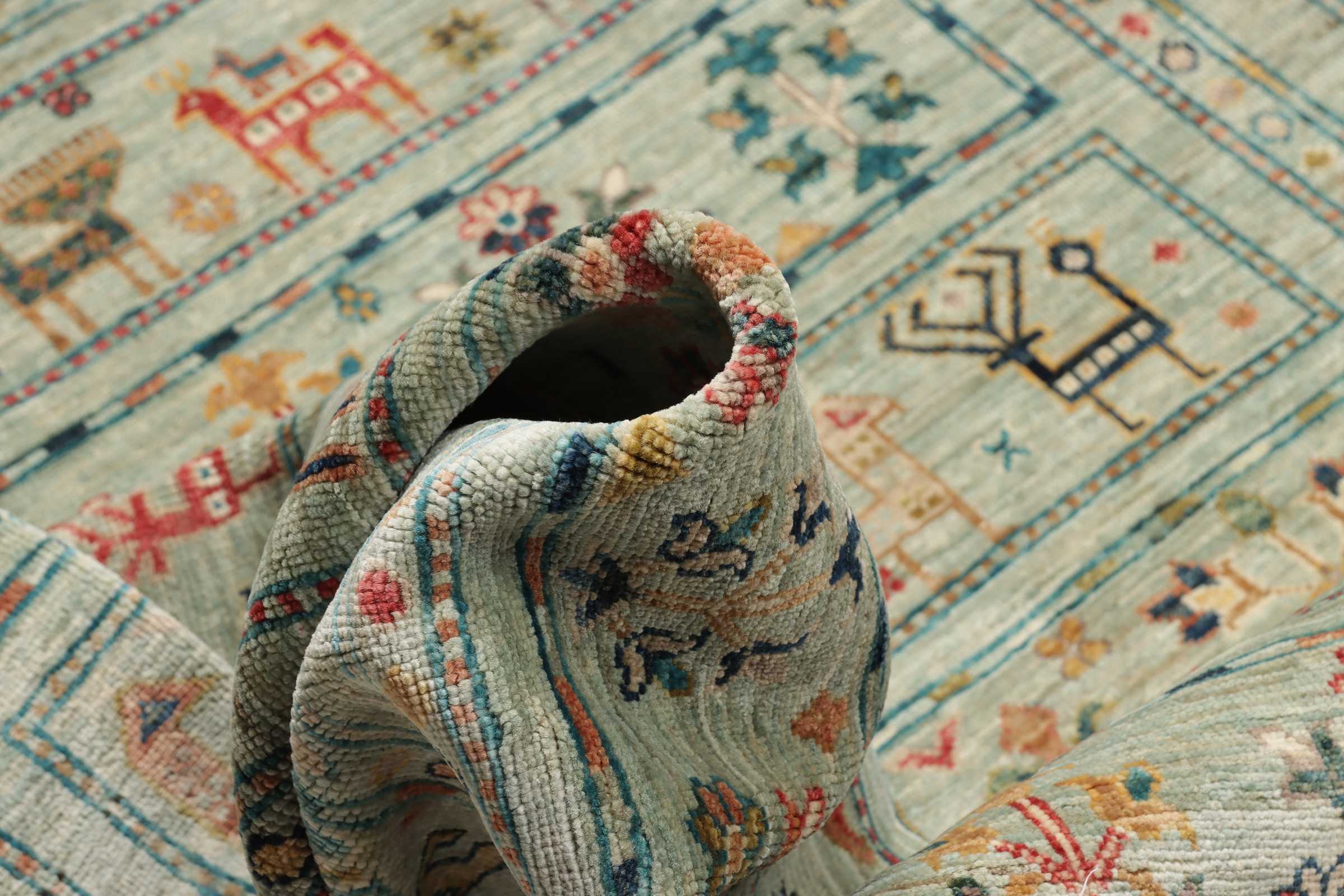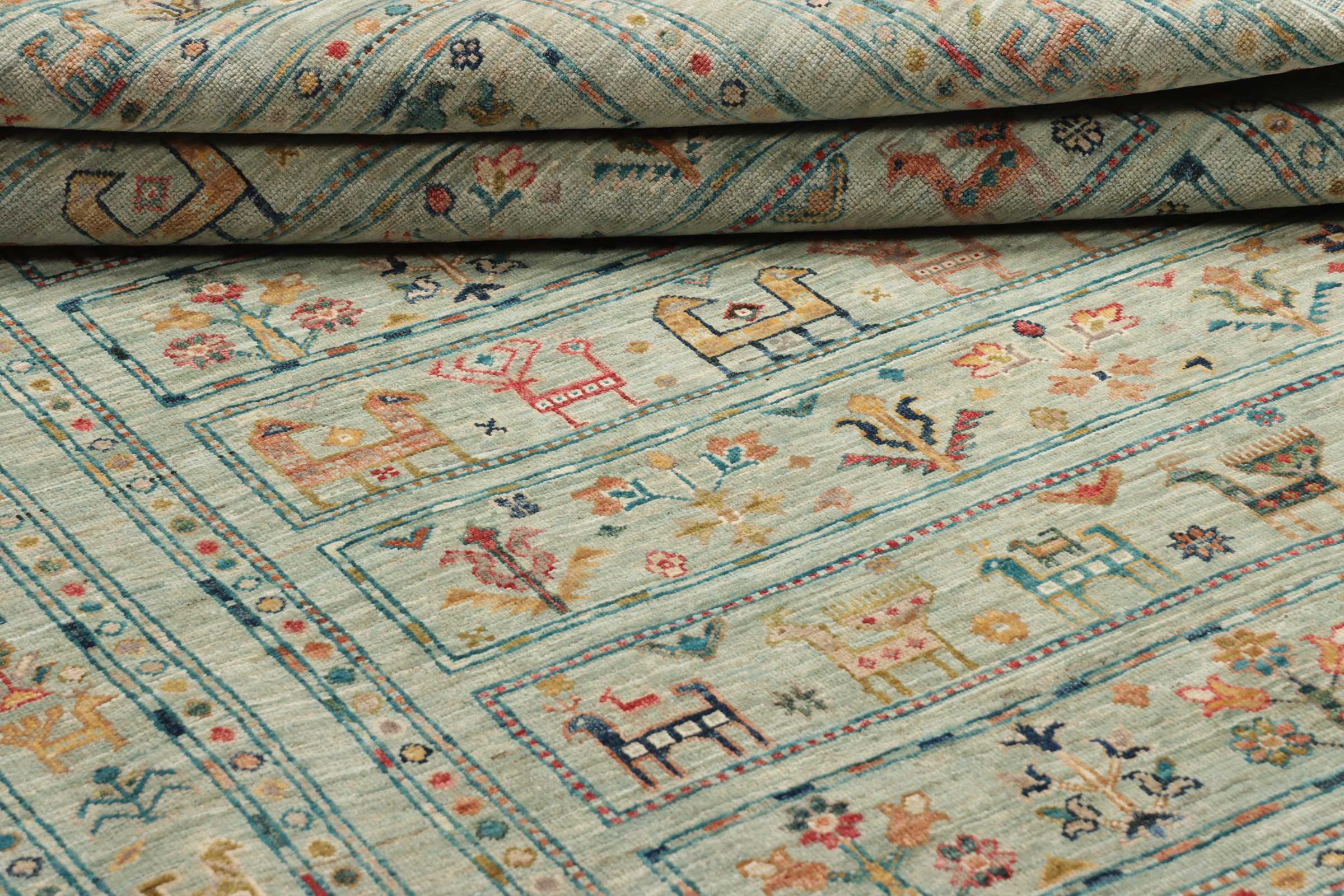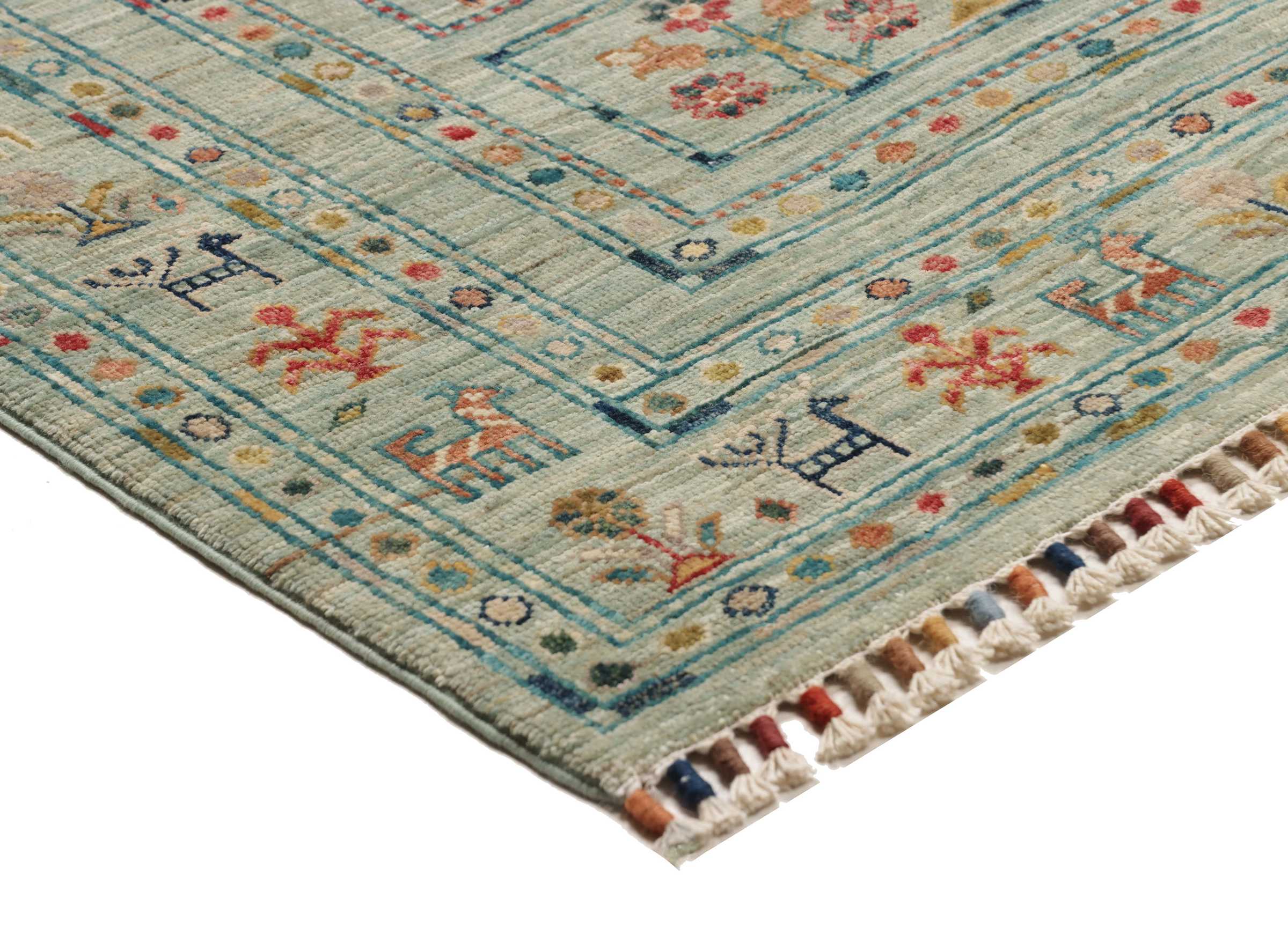 Das Muster dieses handgeknüpften Oxiana Teppichs ist angelehnt an die traditionellen, usbekischen Muster. Ursprünglich wurde vor allem in der Region um Samarkand und Oxiana Teppiche mit einem ähnlichen Muster geknüpft. Unsere Oxiana Teppiche sind auf den zeitgenössischen Geschmack abgestimmt: Harmonische Farbkompositionen aus Naturfarben schmeicheln dem traditionellen Muster. Die Oxiana Teppiche zieren farbenfrohe Querstreifen, die sich mit phantasievoll gemusterten Bereichen abwechseln. Die gemusterten Teile zeigen geometrische Kompositionen, die an ein Kazak Muster erinnern. Charakteristisch ist außerdem, dass die Fransen in kleinen Bündeln zusammengefasst und mit verschiedenfarbigen Fäden umwickelt wurden.