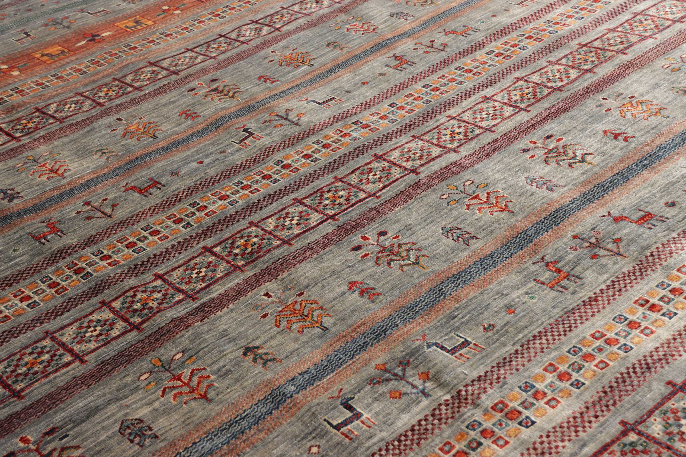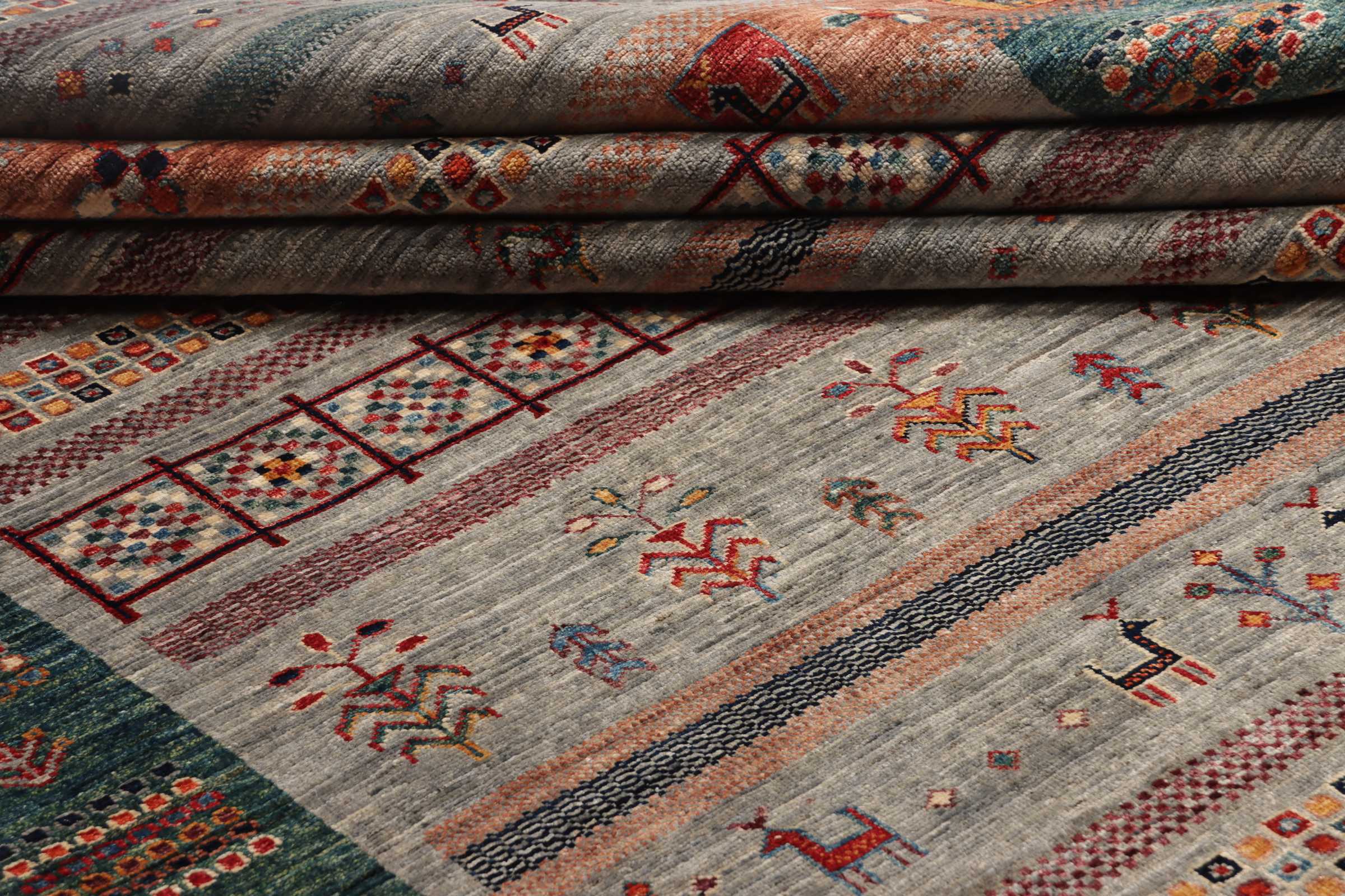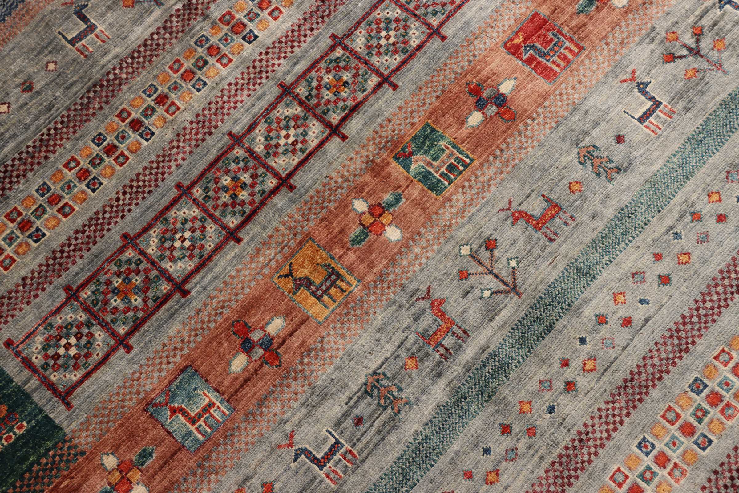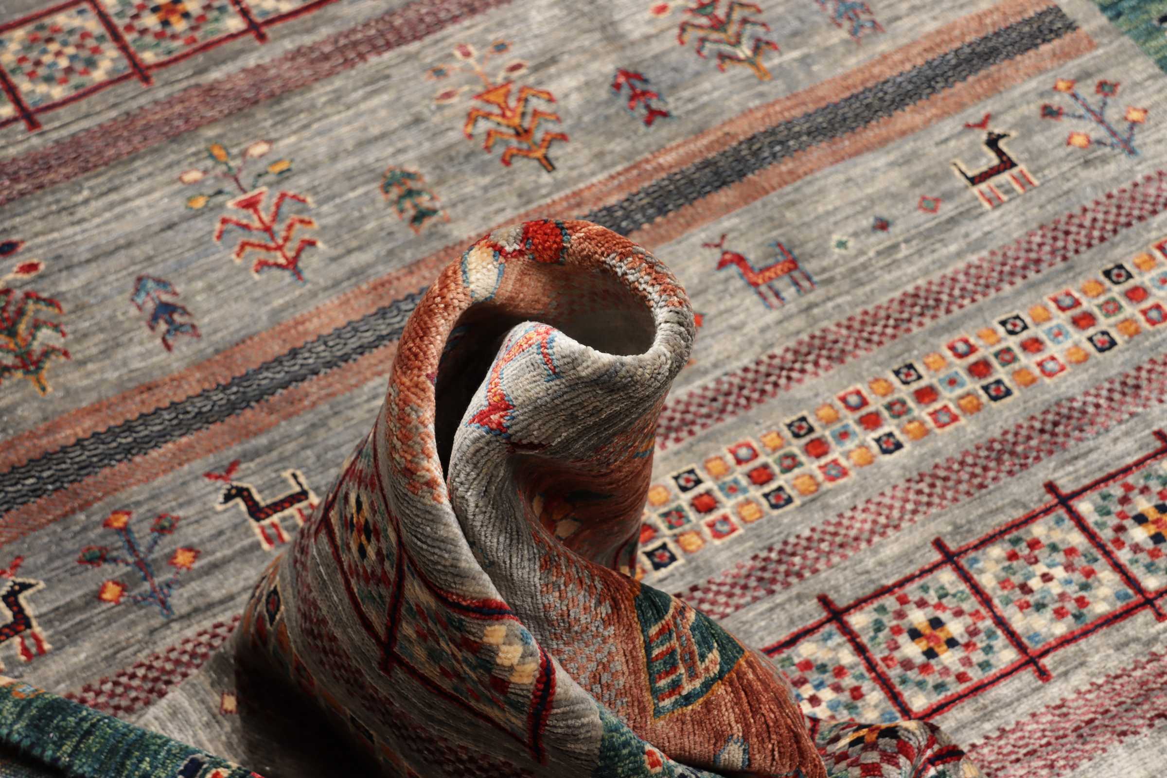 Das Muster dieses handgeknüpften Oxiana Teppichs ist angelehnt an die traditionellen, usbekischen Muster. Ursprünglich wurde vor allem in der Region um Samarkand und Oxiana Teppiche mit einem ähnlichen Muster geknüpft. Unsere Oxiana Teppiche sind auf den zeitgenössischen Geschmack abgestimmt: Harmonische Farbkompositionen aus Naturfarben schmeicheln dem traditionellen Muster. Die Oxiana Teppiche zieren farbenfrohe Querstreifen, die sich mit phantasievoll gemusterten Bereichen abwechseln. Die gemusterten Teile zeigen geometrische Kompositionen, die an ein Kazak Muster erinnern. Charakteristisch ist außerdem, dass die Fransen in kleinen Bündeln zusammengefasst und mit verschiedenfarbigen Fäden umwickelt wurden.