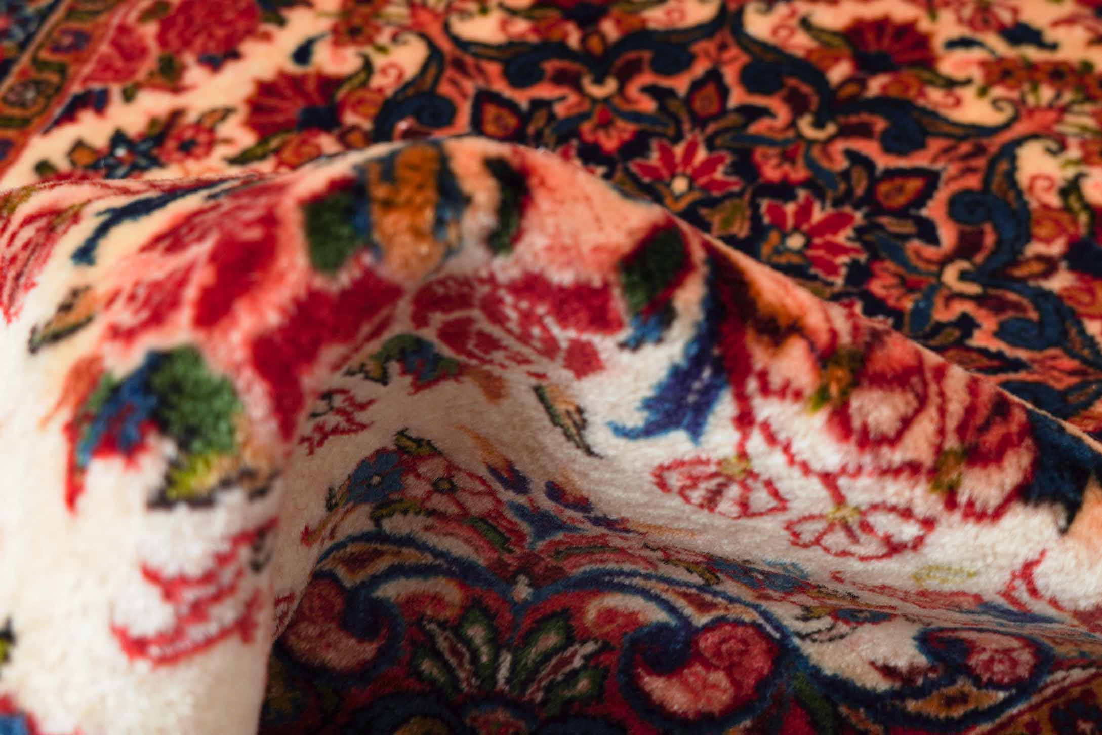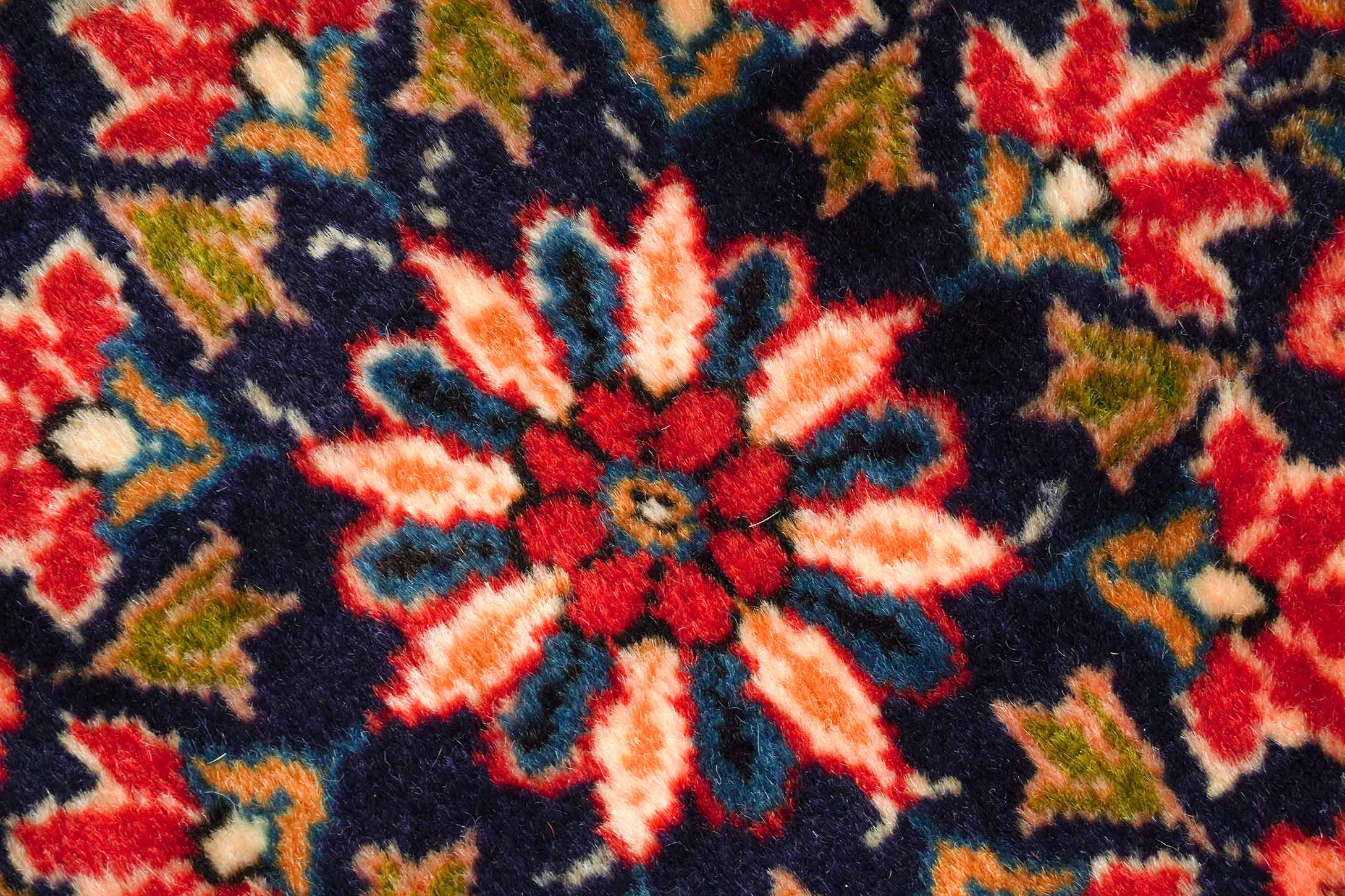 Der Flor dieses Saroughs wurde aus hochwertiger Schurwolle handgeknüpft. Schurwolle wird durch das schonende Scheren von Schafen gewonnen. Schurwolle ist ein nachwachsender, natürlicher Rohstoff mit einer Reihe beeindruckender Eigenschaften: Durch den natürlichen Fettgehalt der Wolle stößt die Oberfläche Wassertropfen ab und ist so auf natürliche Weise gegen Schmutz imprägniert. Wolle bietet außerdem eine hervorragende Wärmeisolation, wirkt regulierend auf das Wohnklima und dämpft den Schall. Die Schuss- und Kettfäden dieses Saroughs bestehen aus Baumwolle. Das vielseitige Material ist reißfest und dehnbar und daher besonders geeignet für ein strapazierfähiges Untergewebe.