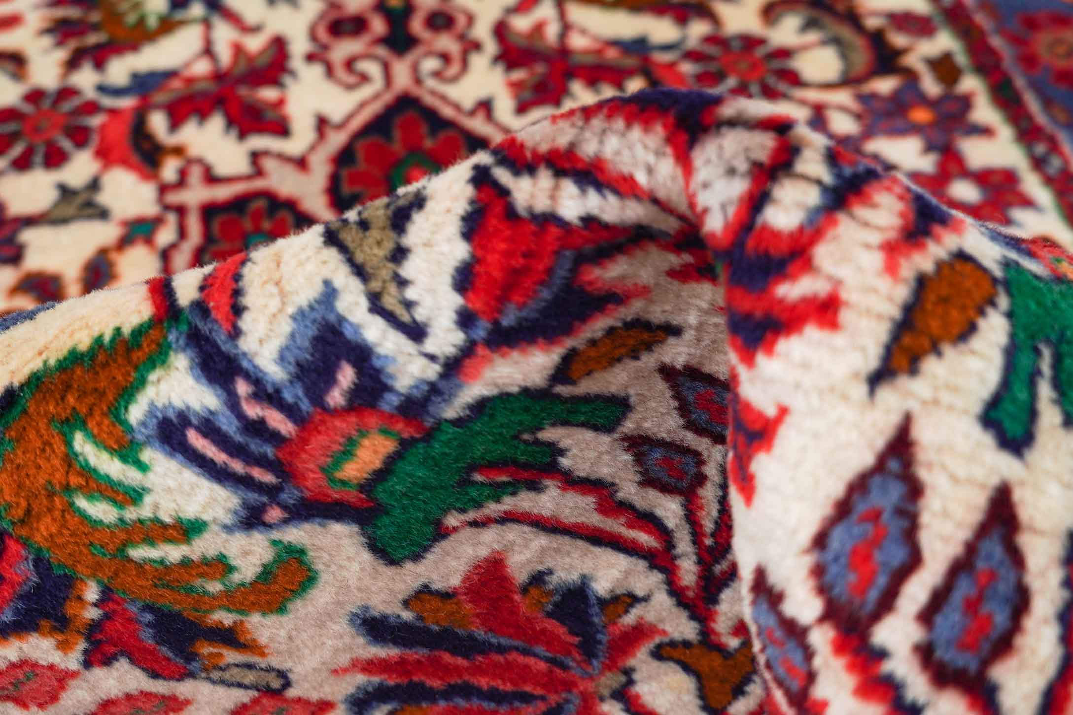 Der Flor dieses Saroughs wurde aus hochwertiger Schurwolle handgeknüpft. Schurwolle wird durch das schonende Scheren von Schafen gewonnen. Schurwolle ist ein nachwachsender, natürlicher Rohstoff mit einer Reihe beeindruckender Eigenschaften: Durch den natürlichen Fettgehalt der Wolle stößt die Oberfläche Wassertropfen ab und ist so auf natürliche Weise gegen Schmutz imprägniert. Wolle bietet außerdem eine hervorragende Wärmeisolation, wirkt regulierend auf das Wohnklima und dämpft den Schall. Die Schuss- und Kettfäden dieses Saroughs bestehen aus Baumwolle. Das vielseitige Material ist reißfest und dehnbar und daher besonders geeignet für ein strapazierfähiges Untergewebe.