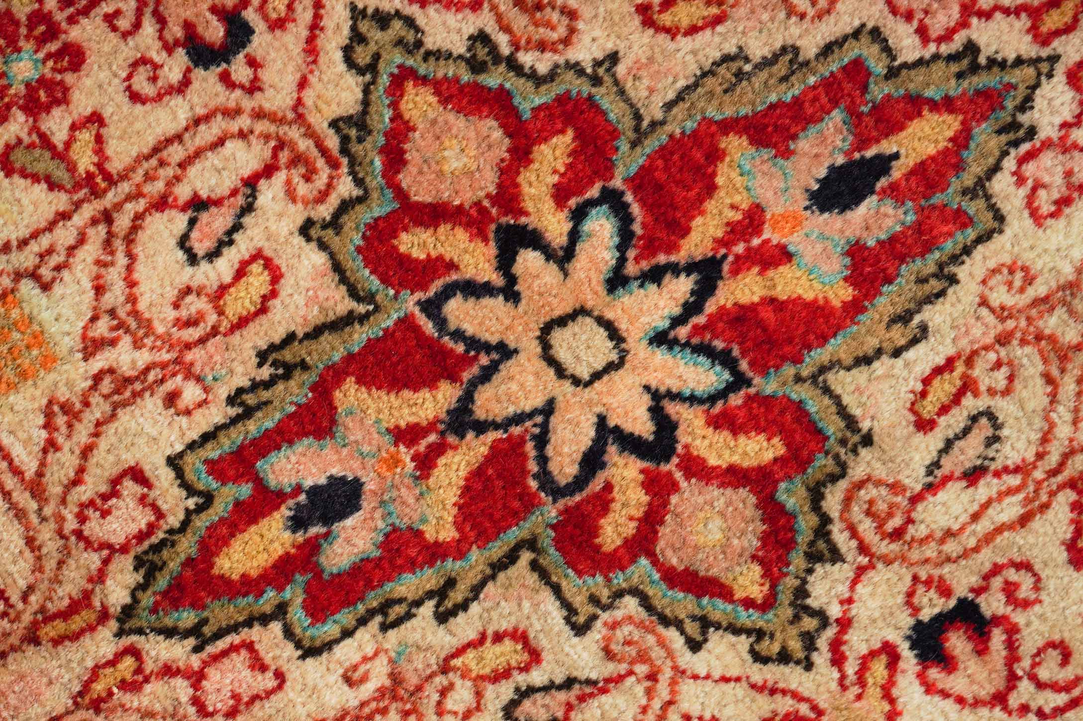 Dieser Teppich stammt aus Sarough (auch Sarouk, Saruk oder Sarogh). Sarough zählt zu den bekanntesten Teppich-Knüpfgebieten des Irans. Gelegen in der westpersischen Provinz Aarak umfasst es die Provinienzen Arak, Djozan, Ghiasabad, Mahal, Malayer, Mohajeran, Sultanabad und Wiss. In Sarough werden Persermuster aller Gattungen, zum Teil auch nach Angaben der Besteller geknüpft. Mit Vorliebe werden auch die benachbarten Farahan sowie die eigenen Sultanabad Designs und das aus Paisley Motiven bestehende, sogenannte Mir-i-Boteh-Muster realisiert. Typisch für diese Teppichgattung ist die sehr gute Wollqualität des Flors; denn die Schurwolle stammt aus dem persischen Hochland. Das Untergewebe – Kette und Schuss – besteht allerdings in der Regel aus Baumwolle. Bei alten und antiken Teppichen findet man häufig einen blauen Schussfaden. Die Knüpfungen sind sehr fein und der Flor relativ hoch.