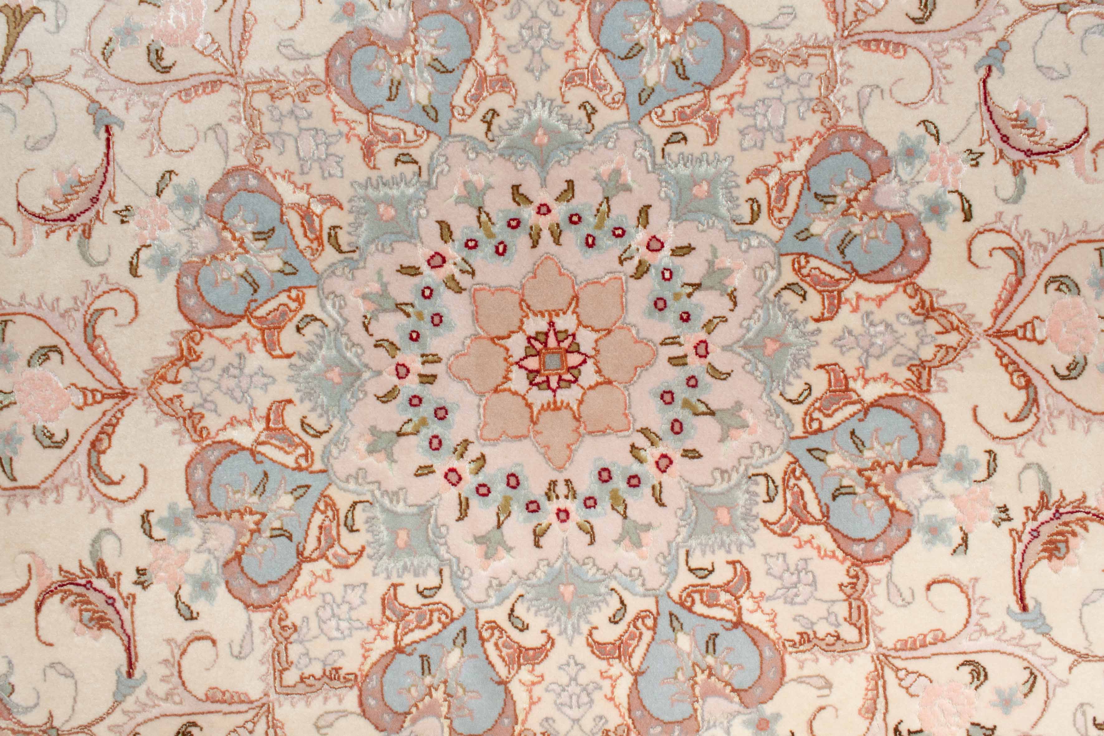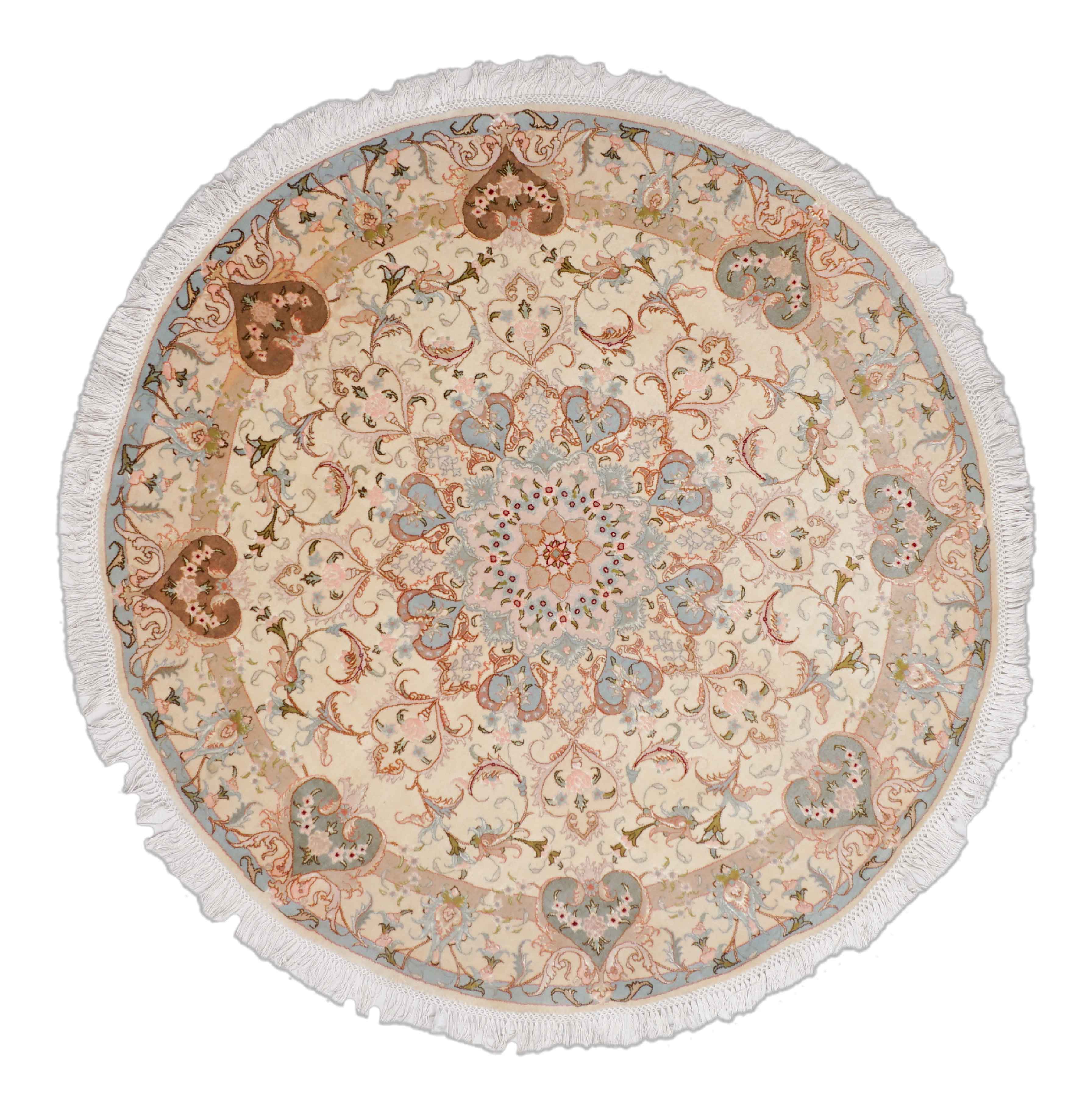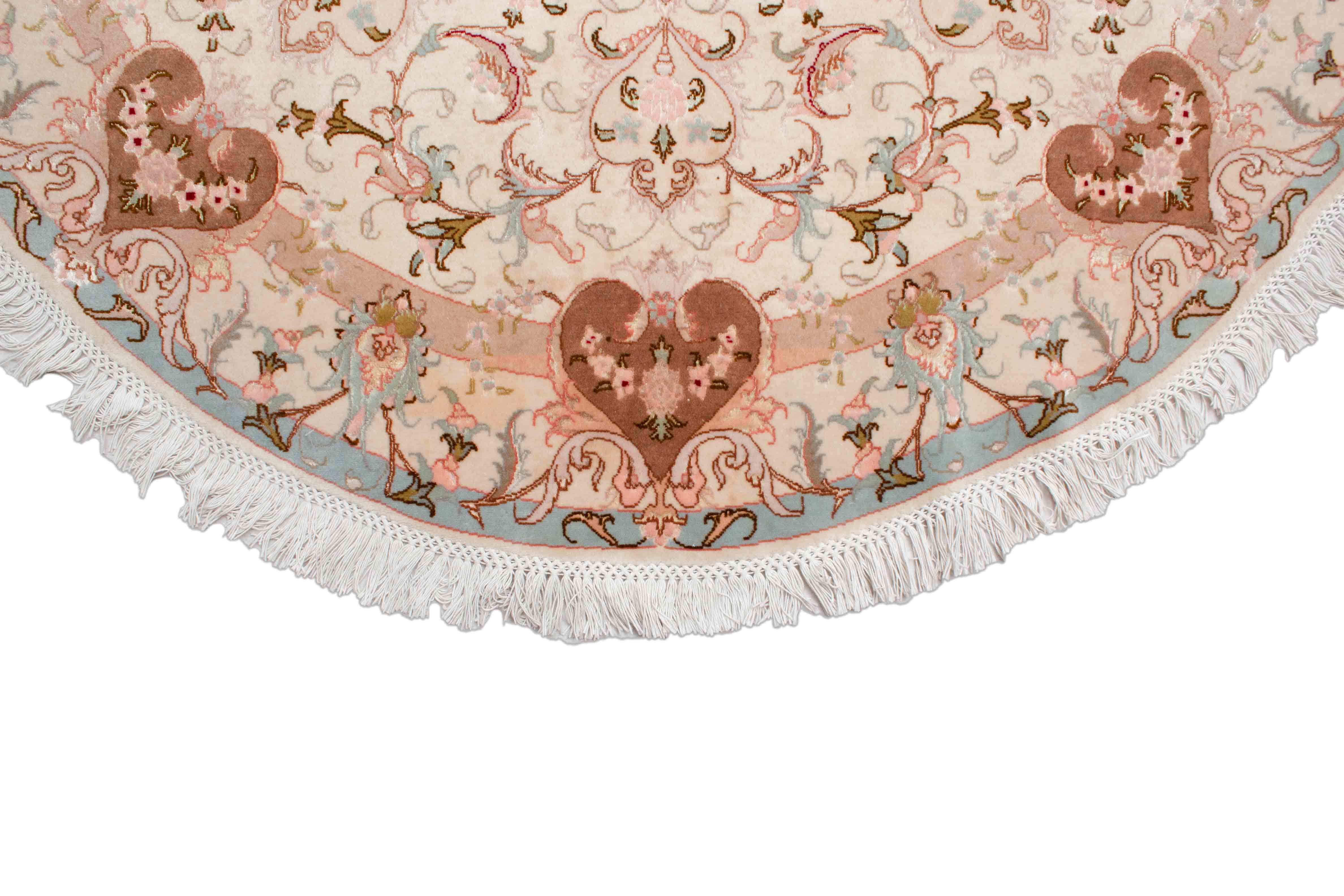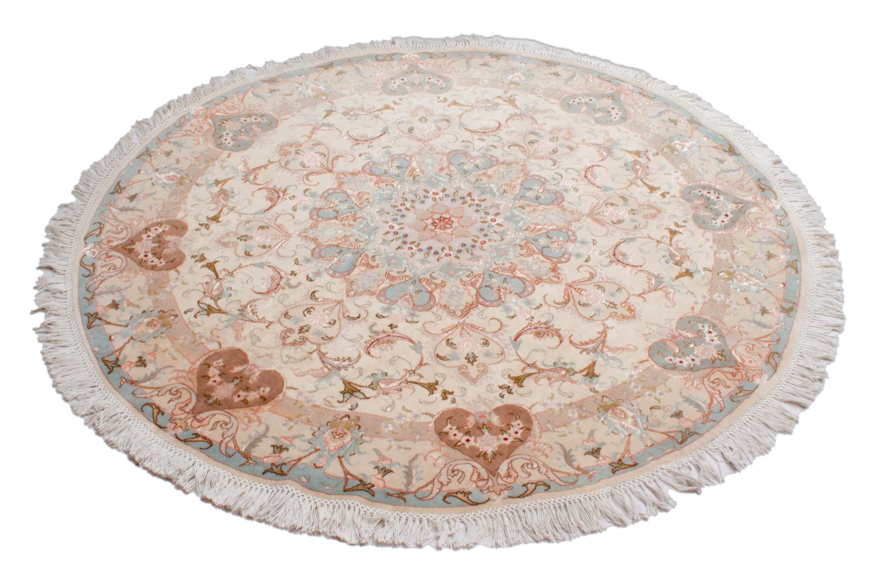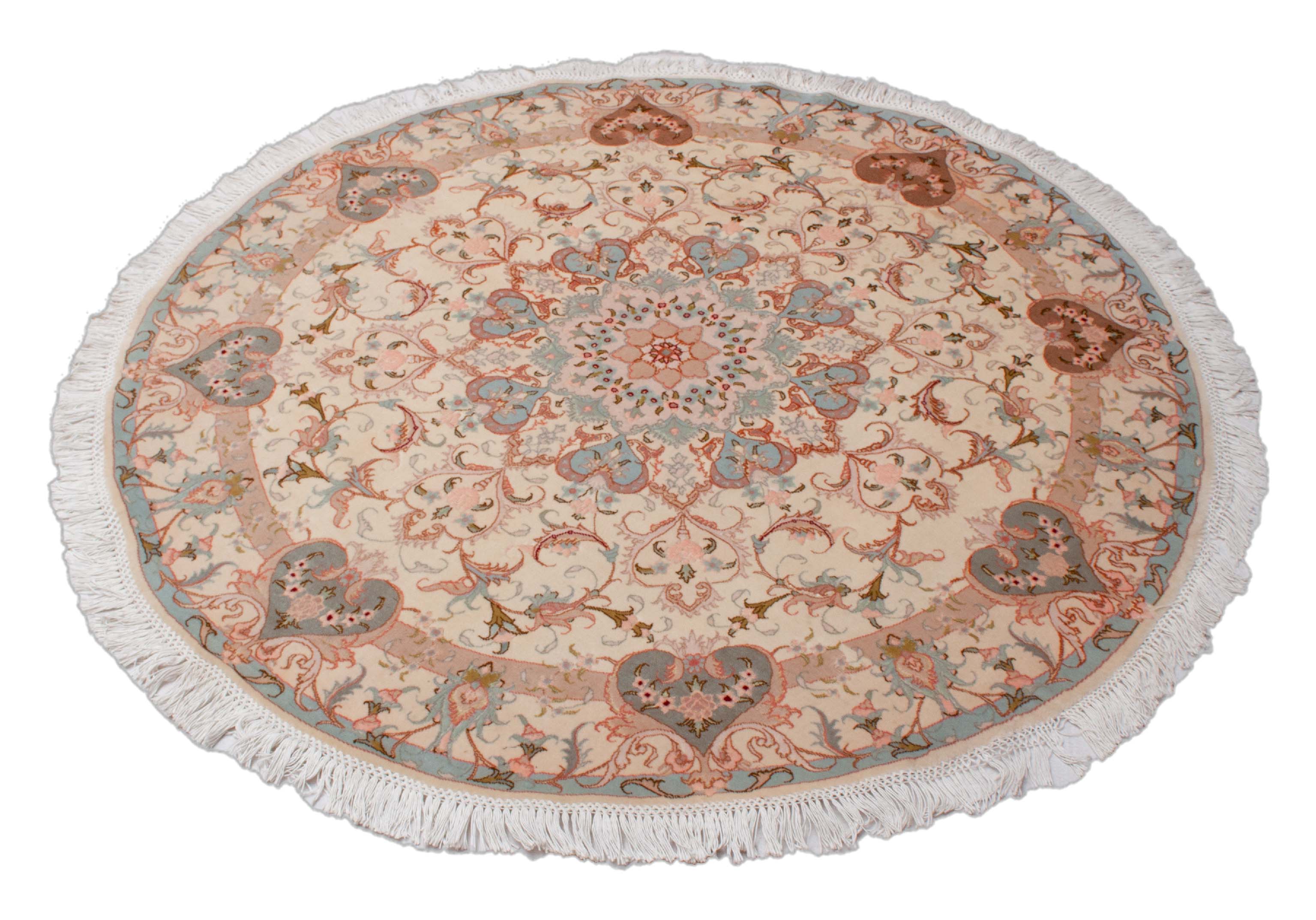 Das runde Format dieses handgeknüpften Täbriz ist sehr selten und eignet sich beispielsweise hervorragend für Räume mit einem runden Ess- oder Wohnzimmertisch.