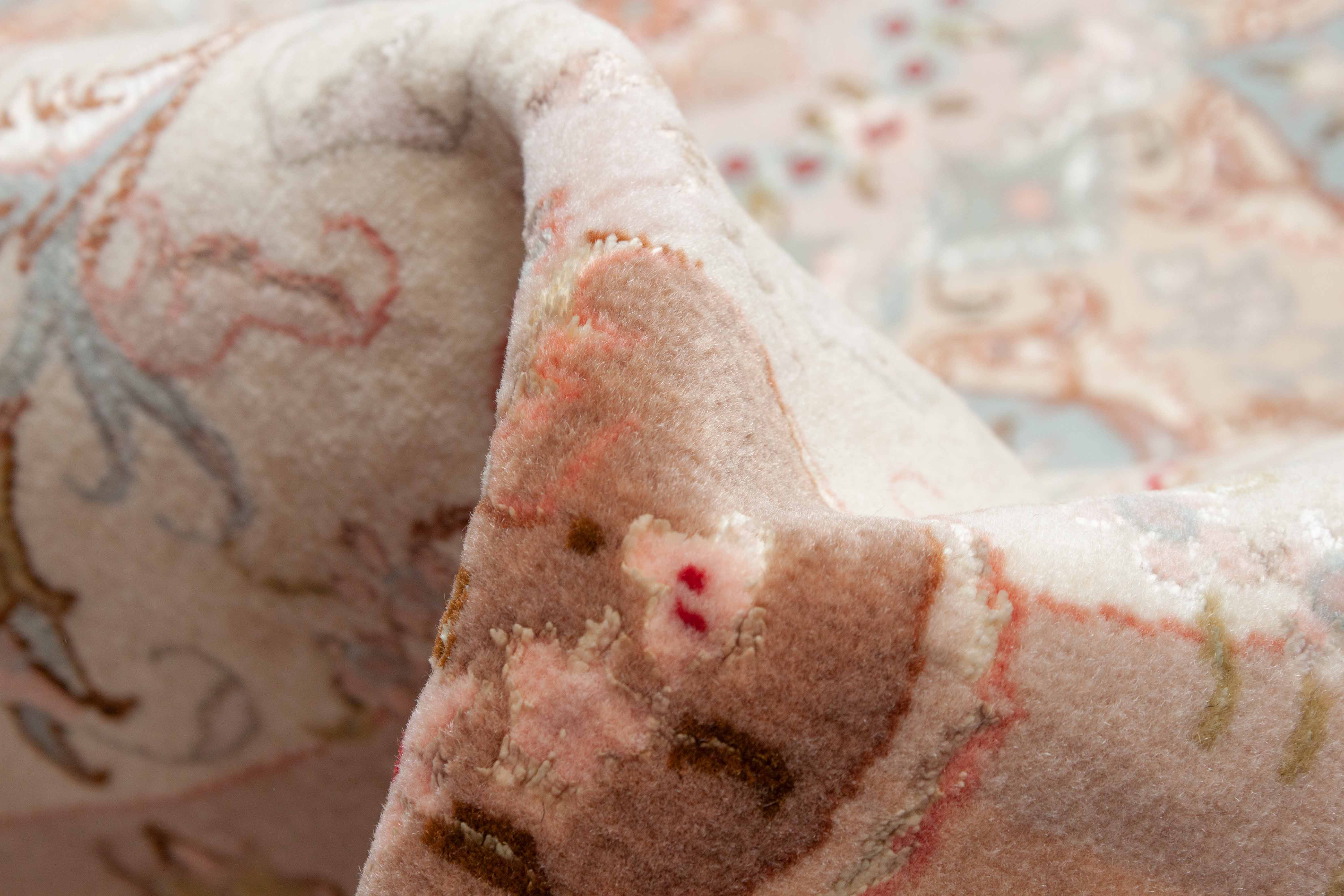 Der Flor dieses Täbriz wurde aus Korkwolle und Seide handgeknüpft. Kork- oder auch Kurkwolle ist ein besonders feinfädiges, sich fast samten anfühlendes Knüpfgarn. Die Korkwolle wird dem Nacken, dem Bauch und den Innenseiten der Beine der Schafe entnommen und ist besonders hochwertig. Das Muster dieses Täbriz ist mit glänzender reiner Seide, die in Handarbeit aus den Kokons des Seidenspinners gewonnen wird, abgesetzt. Die Seidenelemente erzeugen einen schimmernden Kontrast und lassen die Farben – je nach Lichteinfall – in verschiedenen Nuancen erstrahlen. Die Schuss- und Kettfäden dieses Täbriz bestehen aus Baumwolle. Das vielseitige Material ist reißfest und dehnbar und daher besonders geeignet für ein strapazierfähiges Untergewebe.