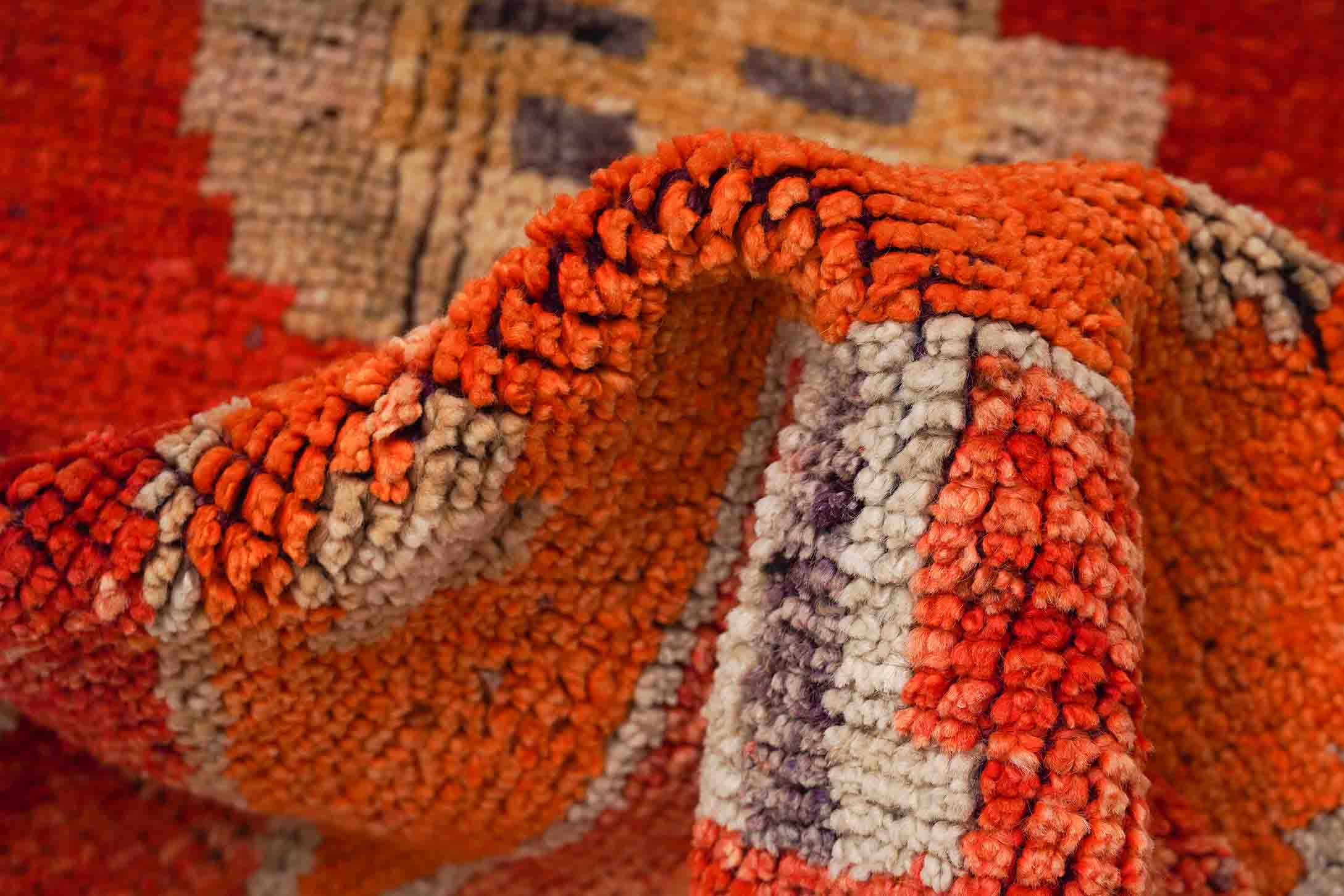 Die Oberfläche dieses Türkischer Orientteppichs wirkt meliert. Die Farbtonänderungen und Hell-Dunkel-Schattierungen des Florgarns lassen die Farben schimmern und machen den Teppich unempfindlich gegenüber Verschmutzungen. Der Teppich wirkt wegen diesen sogenannten Farbsprünge Abrasch lebendiger. Die Melierung entsteht, weil die Wolle dieses Türkischer Orientteppich handgesponnenen wurde. Beim Einfärben werden die natürlichen Farbstoffe unterschiedlich aufgenommen.