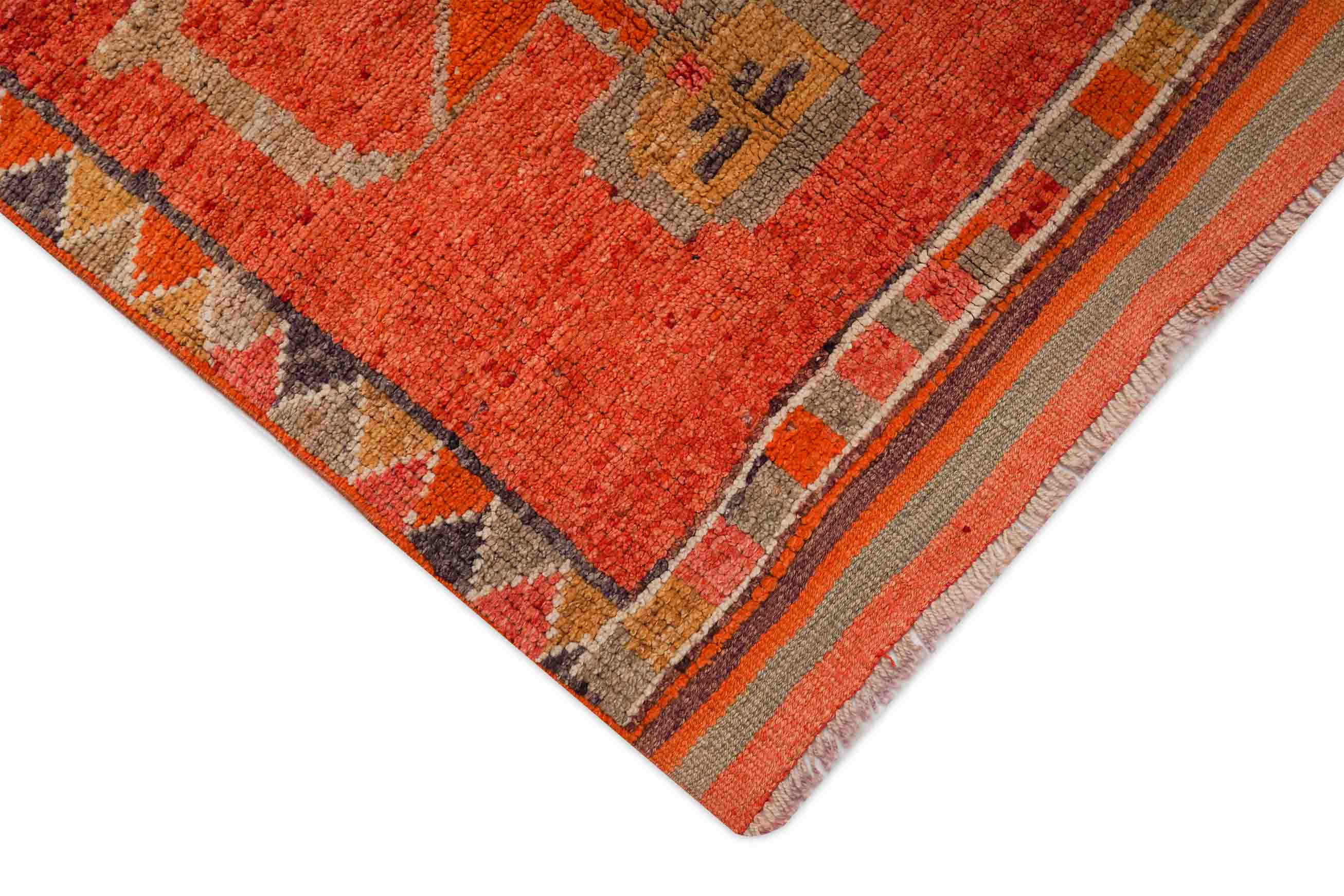 Der Hintergrund dieses Türkischer Orientteppichs ist Terracotta. Der Rand ist in den Farben Olivgrün, Terracotta und Dunkelgrau gestaltet.