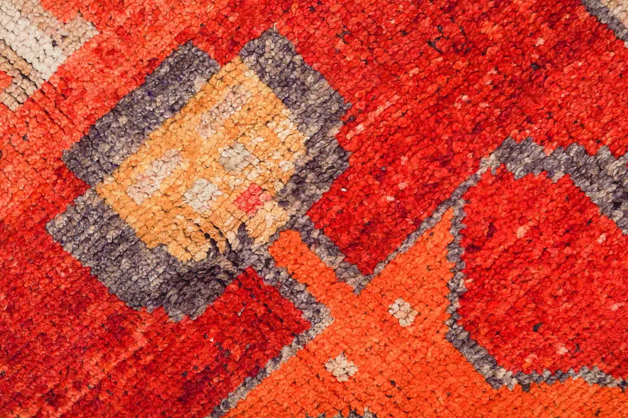 Doch der Aufwand lohnt sich: Durch das Färben mit Naturfarben behält die hochwertige Wolle ihren natürlichen Fettgehalt. Die mit Naturfarben gefärbte und von Hand versponnene Wolle erzeugt faszinierende, changierende Muster. Der Charme handgesponnener Wolle mit ihren leichten Unregelmäßigkeiten und natürlichen Farbtönen entfaltet sich als Kontrast in modernen Interieurs aber auch in Räumen, die traditioneller oder im Landhausstil eingerichtet sind. Der Untergrund (Schuss- und Kettfäden) dieses Türkischer Orientteppichs besteht aus Schurwolle.