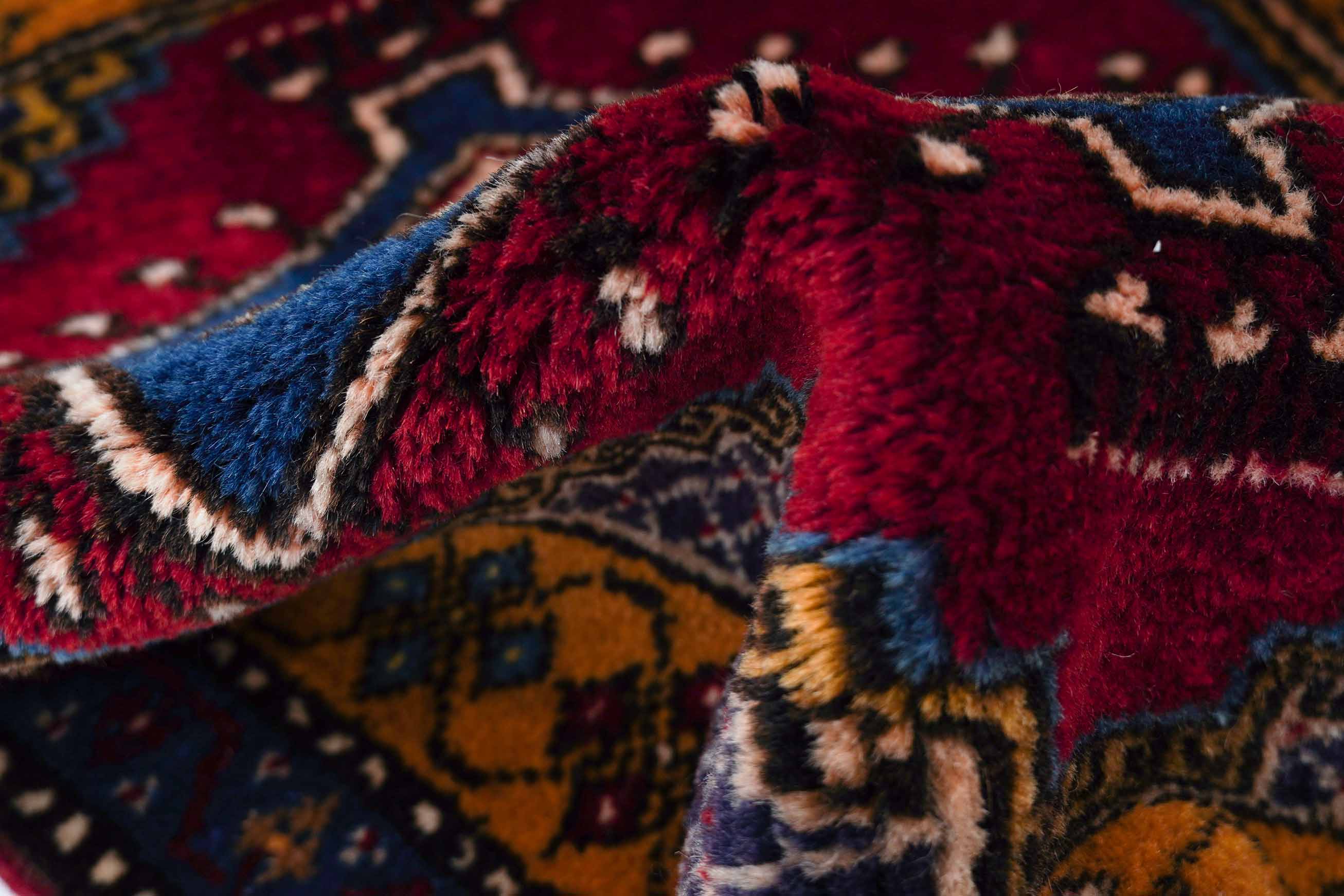 Der Hintergrund dieses Türkischer Orientteppichs ist Weinrot. Im Gesamteindruck dominieren außerdem die Farben Curry und Weinrot. In dem beigen Zentrum sind die Farben Dunkelrot und Dunkelblau kombiniert.