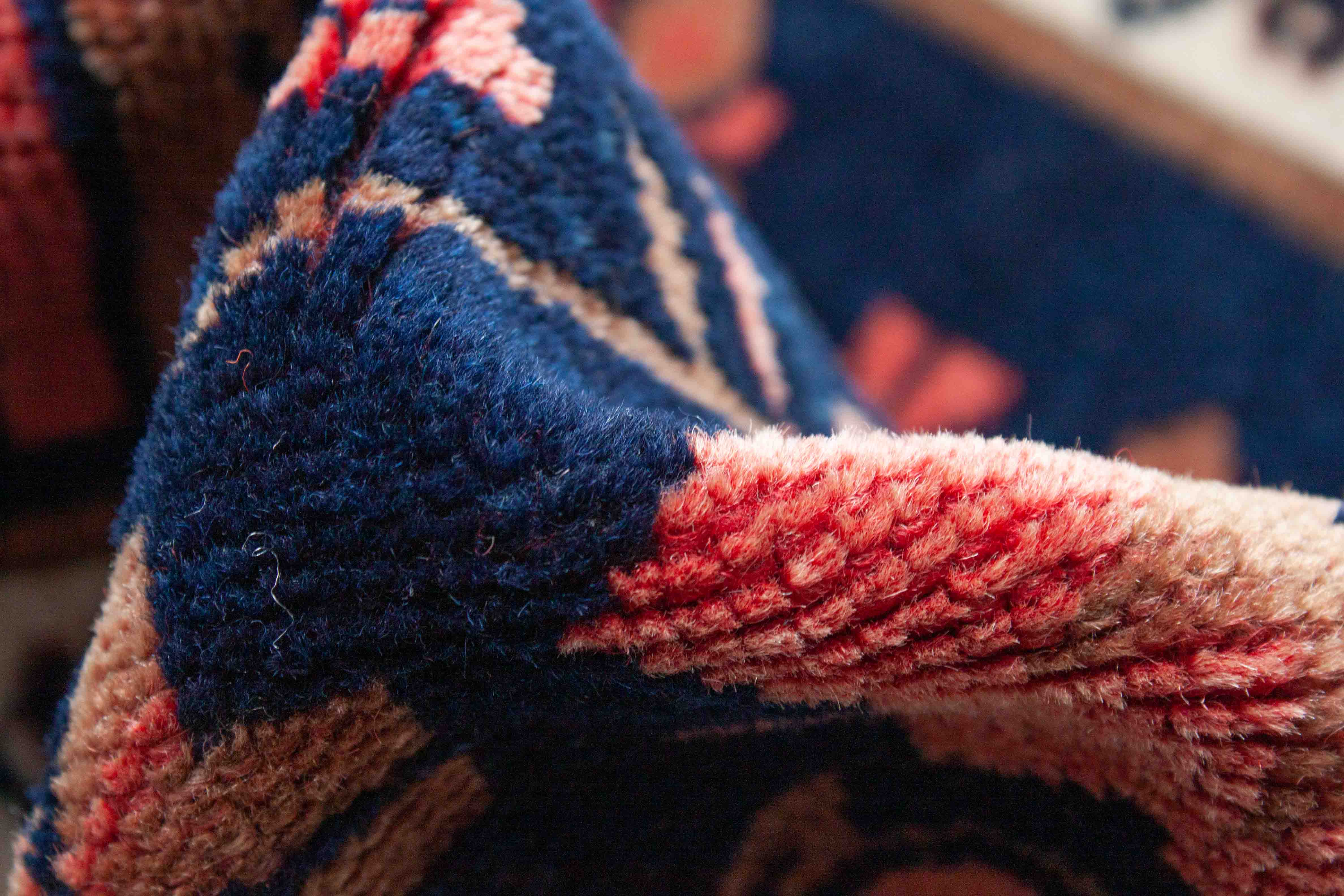 Der Hintergrund dieses Turkmenischer Teppichs ist Dunkelblau. Der Rand ist in den Farben Beige, Hellbraun und Dunkelblau gestaltet.