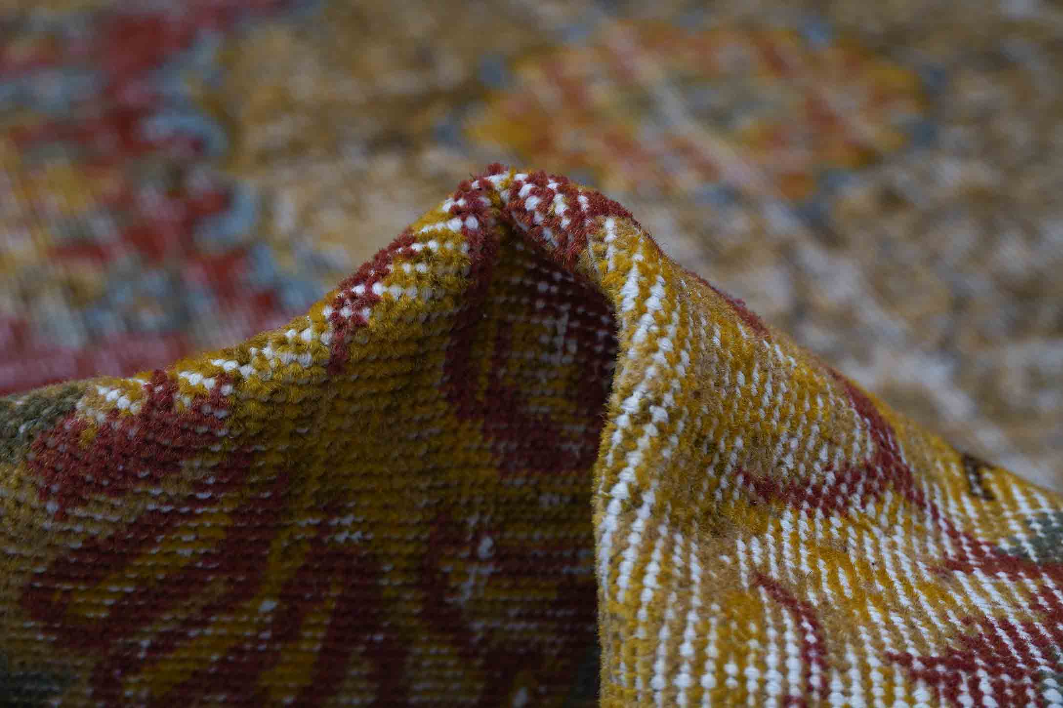 Der Flor dieses Vintage Teppichs wurde aus hochwertiger Schurwolle handgeknüpft. Schurwolle wird durch das schonende Scheren von Schafen gewonnen. Schurwolle ist ein nachwachsender, natürlicher Rohstoff mit einer Reihe beeindruckender Eigenschaften: Durch den natürlichen Fettgehalt der Wolle stößt die Oberfläche Wassertropfen ab und ist so auf natürliche Weise gegen Schmutz imprägniert. Wolle bietet außerdem eine hervorragende Wärmeisolation, wirkt regulierend auf das Wohnklima und dämpft den Schall. Die Schuss- und Kettfäden dieses Vintage Teppichs bestehen aus Baumwolle. Das vielseitige Material ist reißfest und dehnbar und daher besonders geeignet für ein strapazierfähiges Untergewebe.
