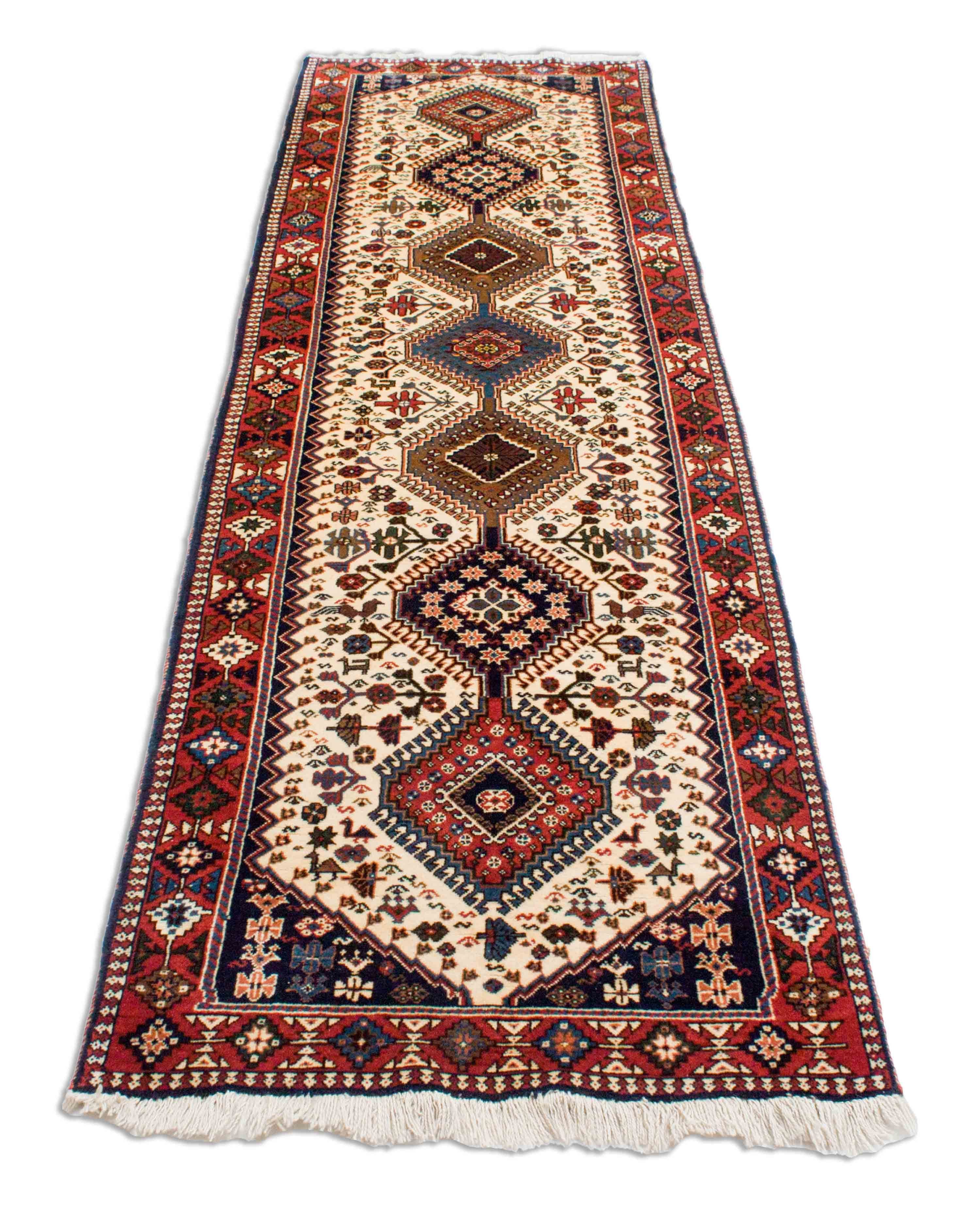 In das Feld, das in exakte, geometrische Formen – meist Quadrate oder Rauten – eingeteilt ist, sind Stern- oder Tiermotive eingegeben. Häufig kommt auch – insbesondere bei größeren Yalameh Teppichen, das sogenannte "se-hoze"-Motiv vor, ein Grundmuster mit dre vertikal angelegten Hexagon-Medaillons, in welche scheinbar wahllos Stern- und Tier-Motive eingestreut sind. "Se-hoze" bedeutet übersetzt soviel wie "drei Teiche". Die Stern- und Tier-Motive werden also wie Spiegelungen in die Darstellung der drei Teiche eingearbeitet.