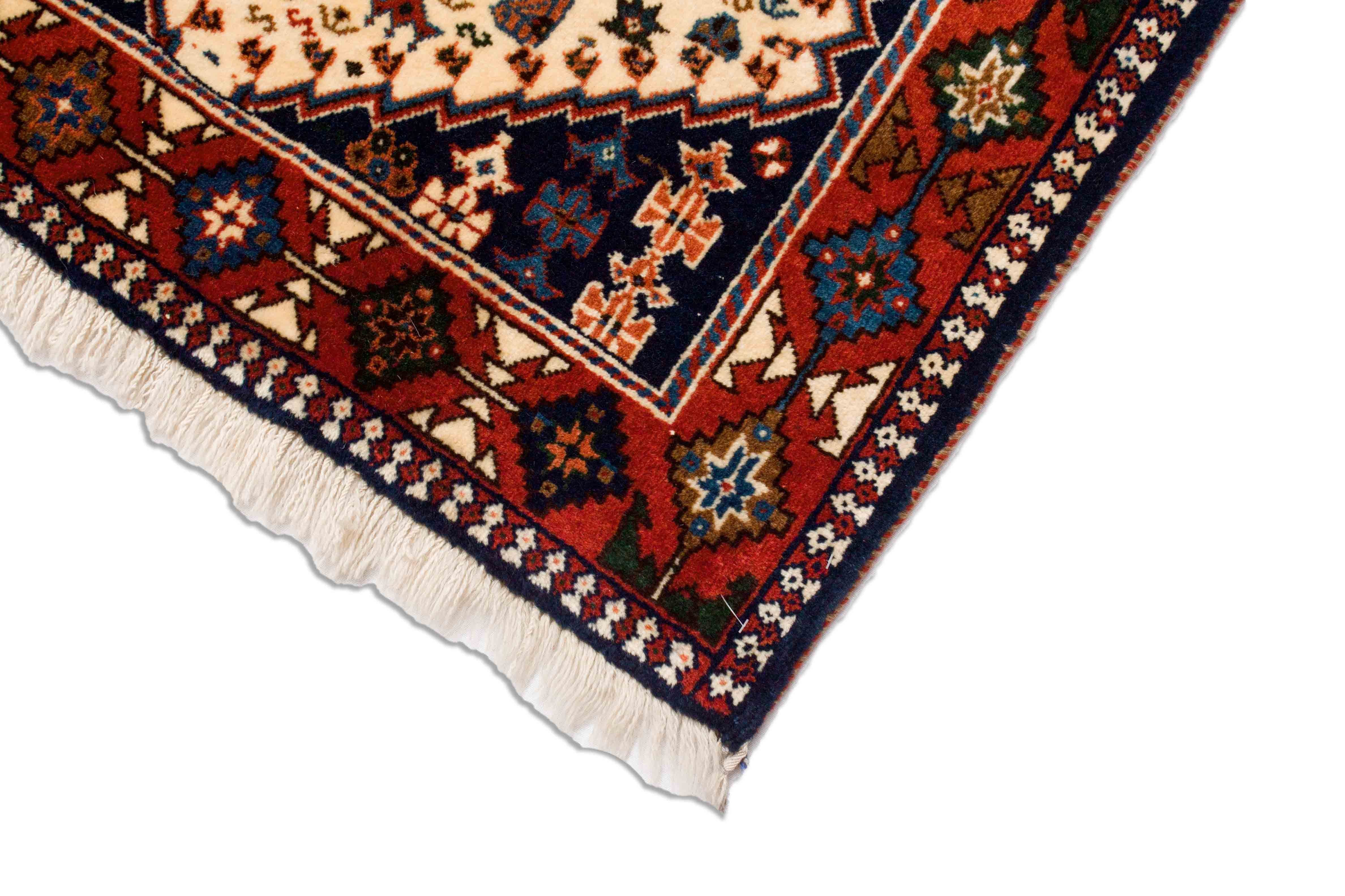 Die wiederholenden Elemente dieses Yalameh Tepppichs haben kein spezifisches Zentrum. Das wiederkehrende Rapportmuster wirkt beruhigend aber nicht langweilig. Teppiche mit Rapportmuster werden auch als durchgemustert bezeichnet.