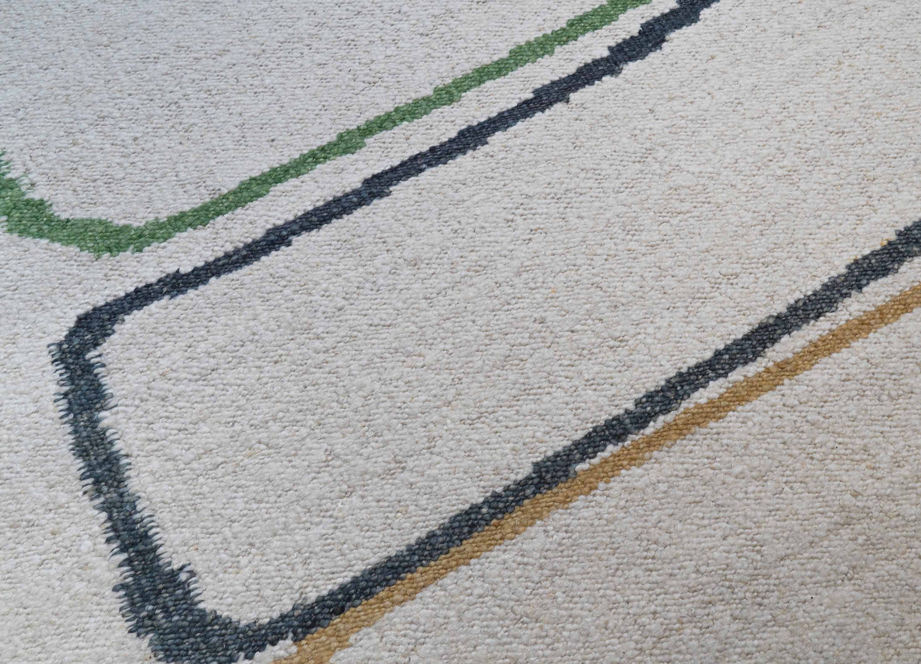 Das klare, abstrakte Design dieses zeitgenössischen Teppichs spricht Menschen, die schlichte, moderne Inneneinrichtung und Architektur lieben besonders an. Die Designidee für diesen Teppich stammt aus Europa. Ohne an die Regeln traditioneller Teppichmuster gebunden zu sein wurde es für den westlichen Kunst- und Inneneinrichtungsstil entwickelt. Das ist dabei keine ganz neue Entwicklung. Die Wurzeln des europäischen Teppichdesigns gehen zurück auf Art-Deco-Teppiche, die zwischen den späten zwanziger und fünfziger Jahren nach westlichen Vorgaben hergestellt wurden.