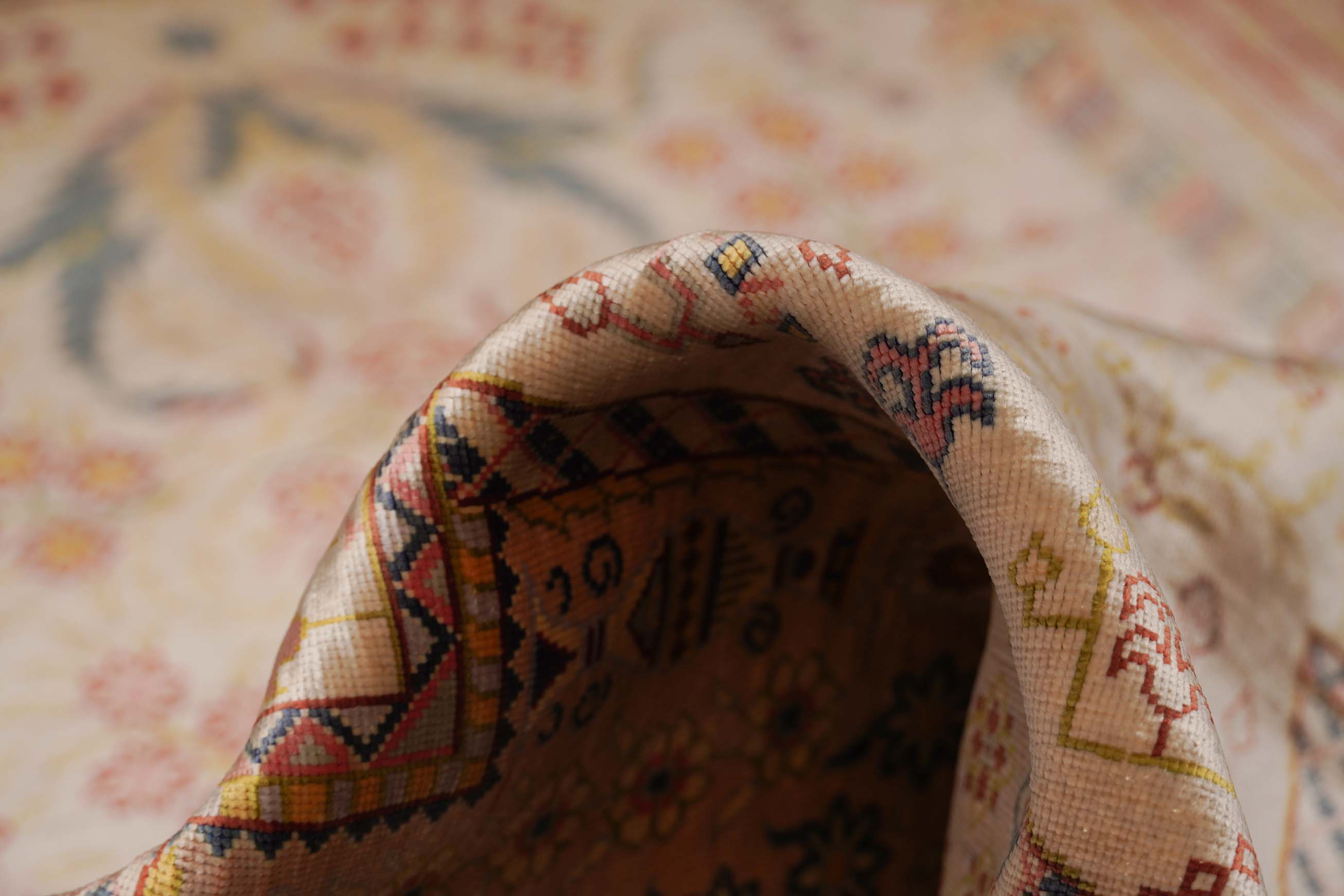 Die Seide des Flors dieses Herekes lässt die Farben des Musters – je nach Lichteinfall – in verschiedenen Nuancen erstrahlen. Sie macht diesen Hereke zu einem echten Juwel und schafft eine gemütliche und zugleich sehr elegante und hochwertige Atmosphäre im Raum. Seide wird in Handarbeit aus den Kokons des Seidenspinners gewonnen. Da die einzelnen Seidenfäden äußerst lang sind, lassen sich sehr dünne Garne herstellen, die bei geringem Gewicht trotzdem reißfest sind. Mit dem dünnen Garn lassen sich kleinere Teppichknoten knüpfen und damit feinere Muster erzeugen. Daher werden die feinsten Teppiche der Welt aus reiner Seide handgeknüpft. Bei diesem Hereke wurde sogar der Untergrund aus reiner Seide gefertigt. Durch das dünne, aber strapazierfähige Material der Schuss- und Kettfäden ist eine besonders feine Knüpfung und daher auch ein besonders feines Muster möglich.
